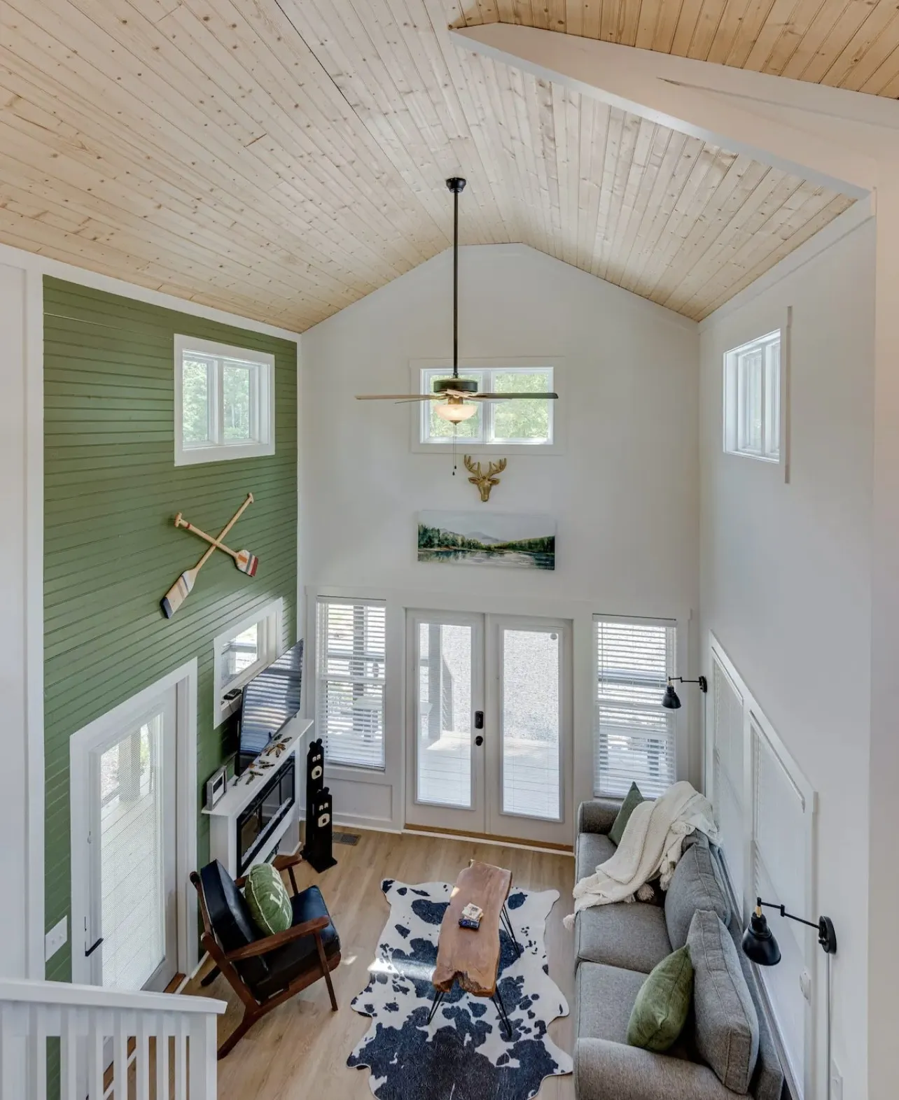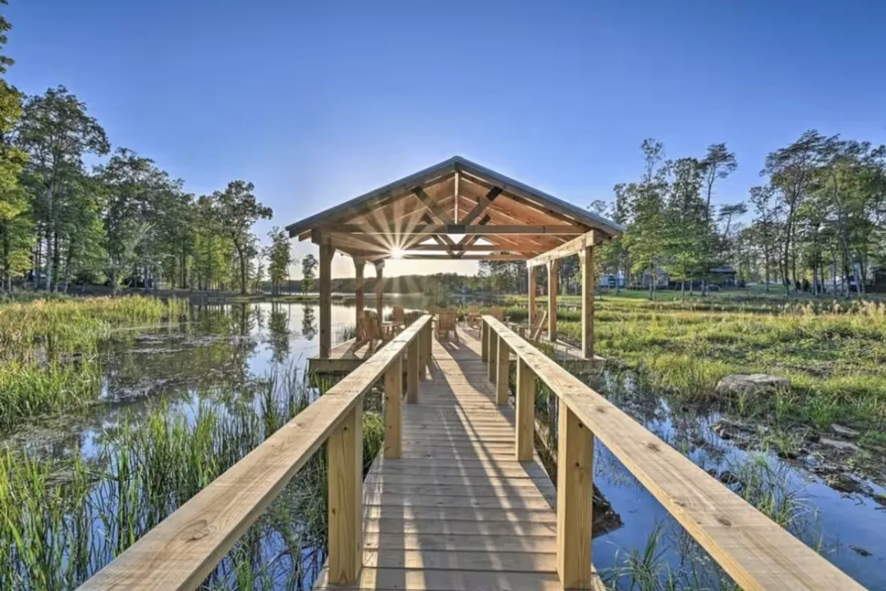The ultimate in luxury! This lovely site-built cottage has a wrap-around porch, a huge loft that serves as a second bedroom, and a king-size bed with a ceiling high enough that you don’t have to crawl to get to it! Two bunks, two FULL bathrooms, and a master bed downstairs! Waterview of the community’s lovely lake during the fall and winter. It’s a wonderful way to get away from daily life.