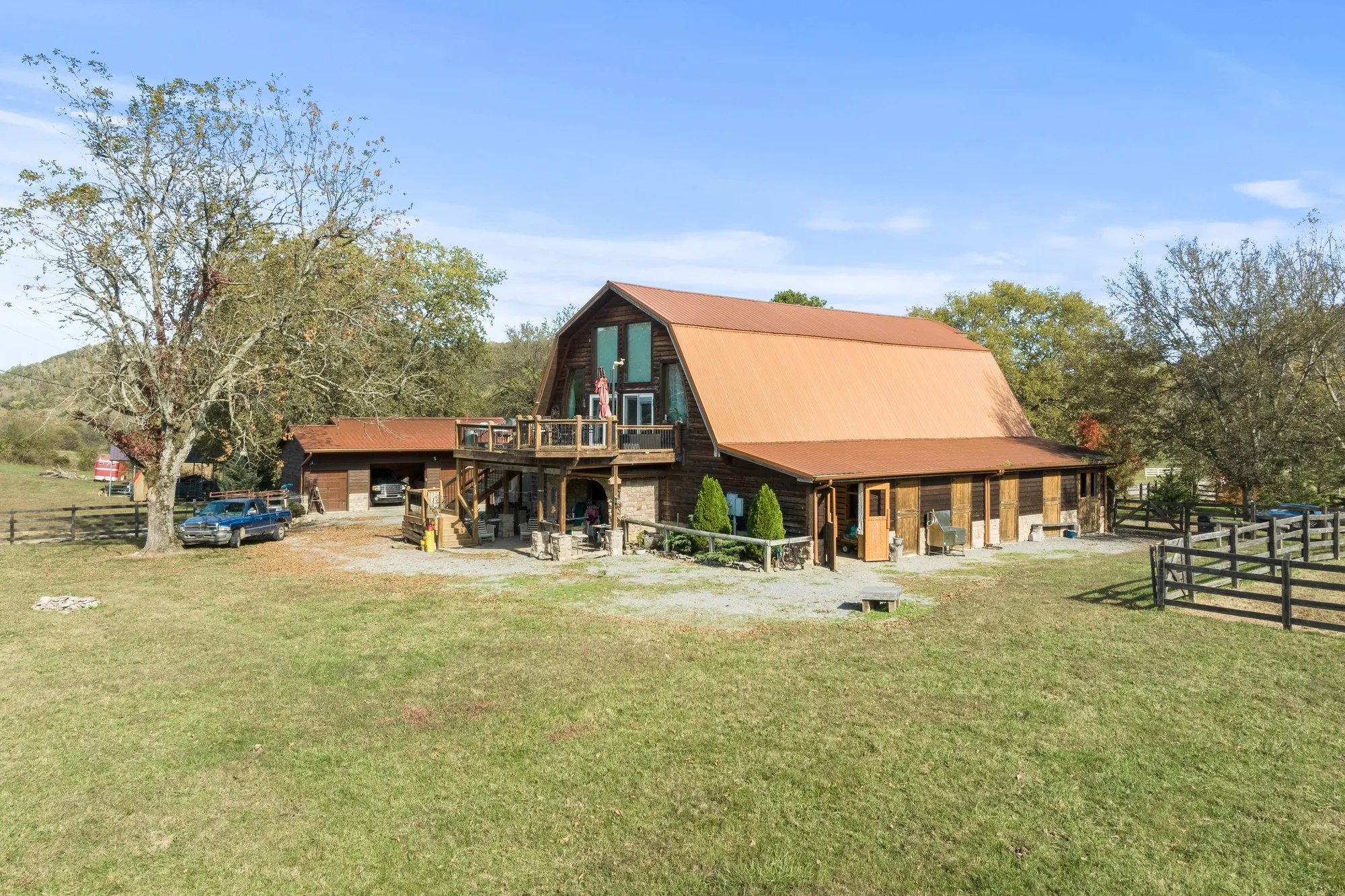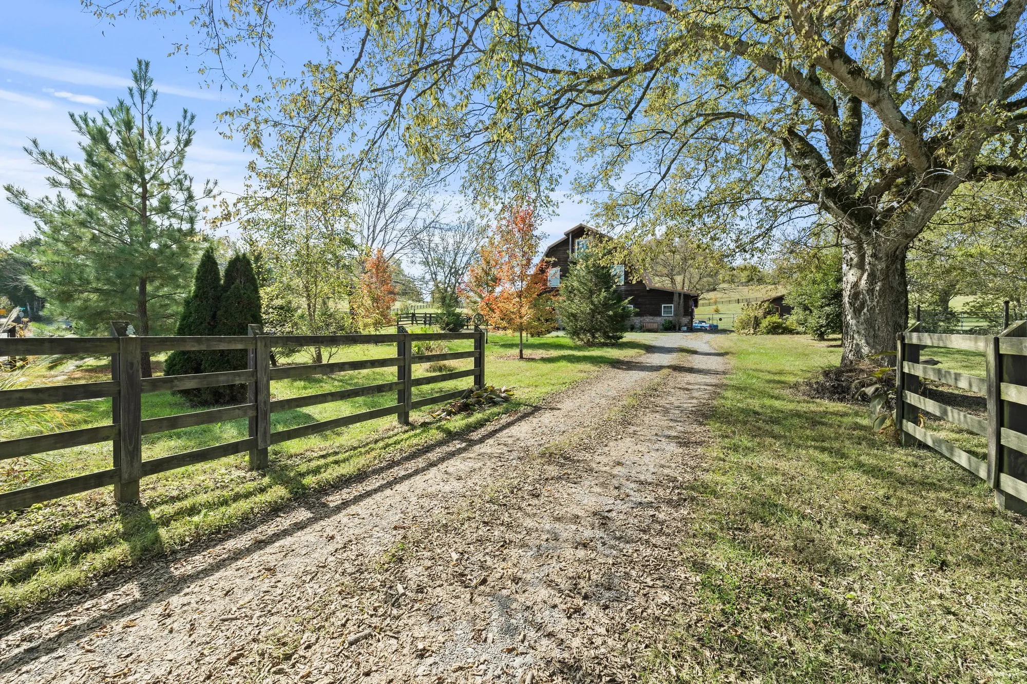 This unique, one of a kind, property is nestled in the hills of Tennessee on 34 beautiful acres located only 250 feet from Roaring River. There is road frontage on Dodson Branch Hwy and also Old County Lane. The 34 acres features 6 pastures, 9 gates, 3000 feet of painted fencing, horse hitches, 10 farm faucets, 6 regular horse stalls, 2 brood mare stalls, wash stall for horses, saddle tack room, a 66’ x 198’ Dressage Arena. There are 2 ponds on the property. One is a 1/3 acre stocked spring fed pond. The other is a cement based swimming pool with filtration skimmers and foundation. There is also a 40’ x 30’ implement shed and a 40’ x 50’ bird yard for chickens. There is public utility water as well as a well on site. There is a 2.5 car garage that is paneled, insulated, and has its own