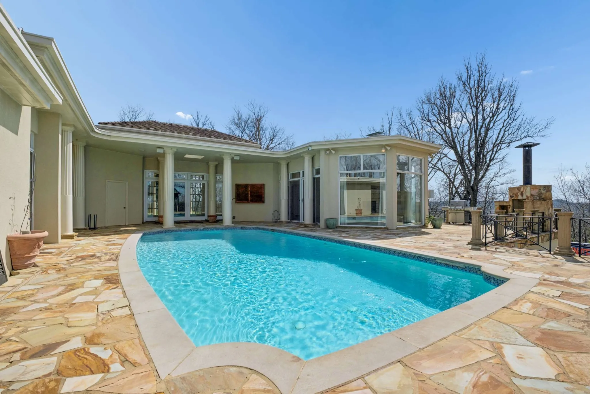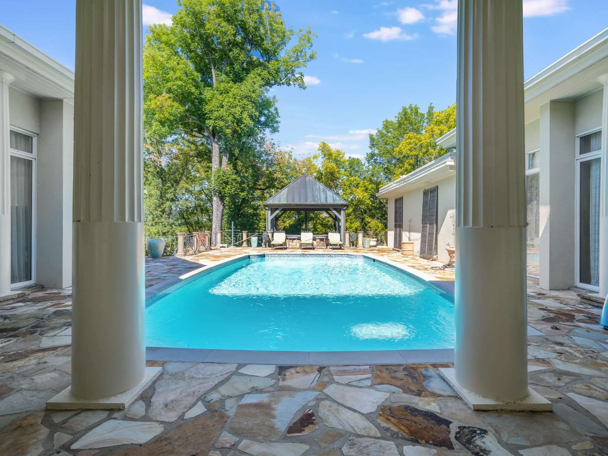 Rare & remarkable* Nestled on 15 secluded wooded hilltop acres, this single-story home offers a private oasis* Gated* This home has been loved by its current owner for 30 years* Abundant natural light throughout* Courtyard saltwater pool* Step into the expansive foyer with soaring 16-foot ceilings* Spacious kitchen with Quartz countertops~ updated in 2016* Enjoy the 10-foot ceilings* Den with Terrazzo flooring and a bold stone fireplace + a cherry-paneled study with floor-to-ceiling windows that flood the space with sunlight* The impressive owner’s suite includes five closets, highlighted by a luxurious cedar walk-in closet* Dual bathrooms (one renovated in 2023 w/ steam shower and heated tile flooring)* 3-Car garage complete with an epoxy floor* Do not hesitate*