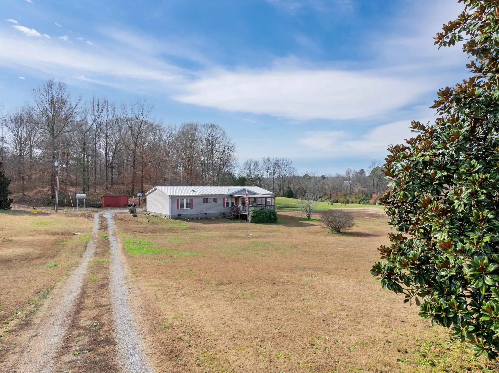 2.68 acres • 2004 Custom Manufactured Home on Permanent Foundation! Enjoy peaceful country living in this excellently maintained 3 BR, 2 BA custom home set on 2.68 private acres with a long gravel drive offering wonderful privacy. The spacious country kitchen features an island, all appliances, a separate breakfast bar, dining area, and plantation shutters that continue into the light-filled living room with a cozy gas fireplace and built-in shelving. The large primary suite offers a custom bath with soaking tub, separate shower, double vanity, and a generous walk-in closet. Two additional bedrooms share a roomy bath with tub/shower combo. A separate laundry area and small office space just off the kitchen add convenience and flexibility. Relax outdoors on the covered front porch, perfect for dining or unwinding, or enjoy the peaceful covered back porch overlooking the wooded countryside. Property includes an excellent workshop/barn with two covered parking bays for vehicles, tractors, or boats, plus an enclosed workshop area. A separate storage building and storm shelter provide additional security and functionality. Utilities include city gas, city water, and fiber internet. Located just off Hwy 641 S between the Tennessee River and the small river town of Decaturville—only 22 miles to I-40 and conveniently situated between Memphis and Nashville. A private, quiet country setting with all the amenities you need!