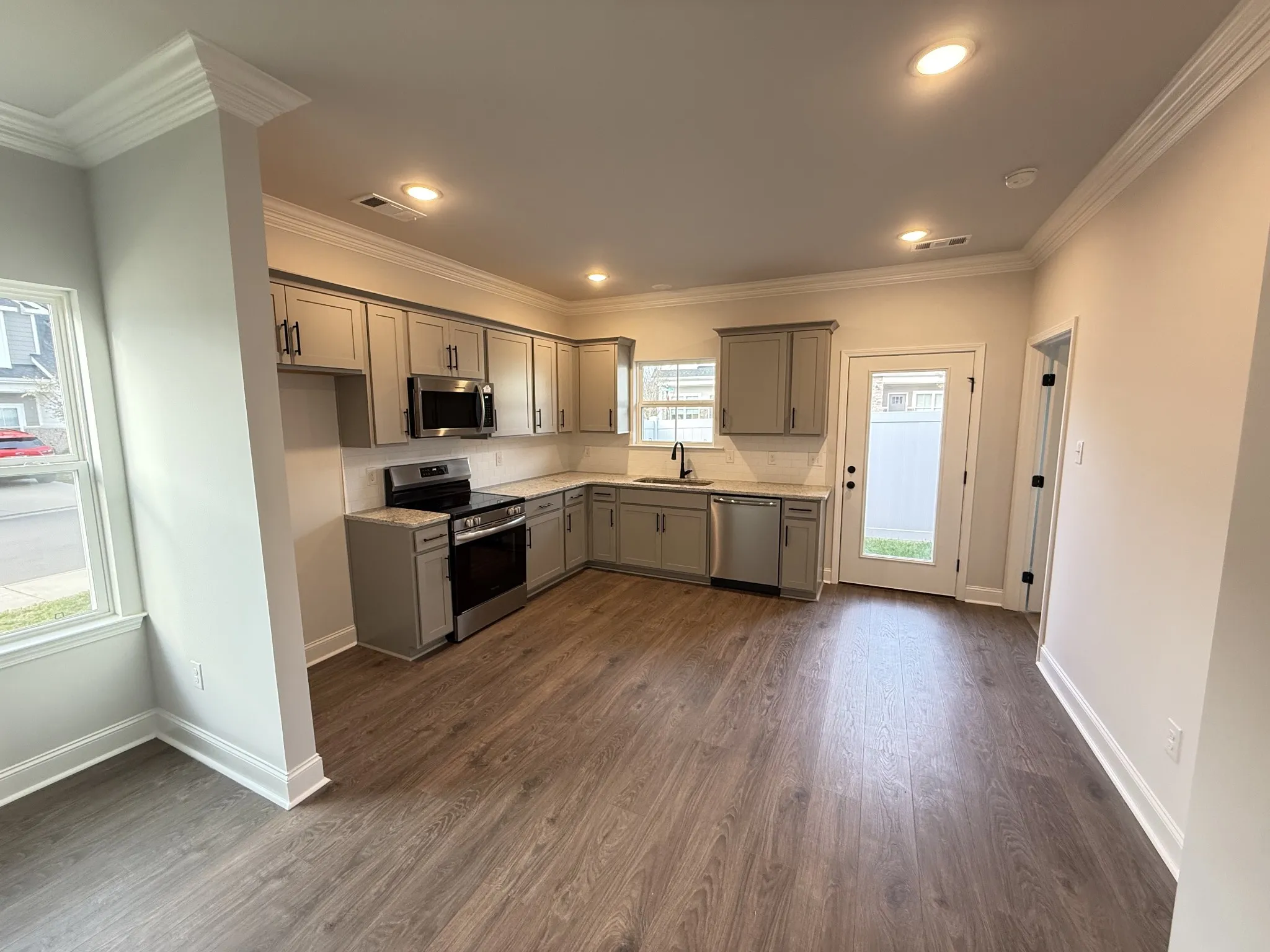 The Denham offers a thoughtful two-story layout with a split floorplan designed for privacy and functionality. The entry opens into a spacious front living room, while the kitchen is tucked privately toward the back of the home. An L-shaped eat-in kitchen provides generous counter and cabinet space, and the central hallway connects to the garage, pantry, powder room, and under-stair storage for added convenience. A large laundry room just off the living area adds even more storage options.\n