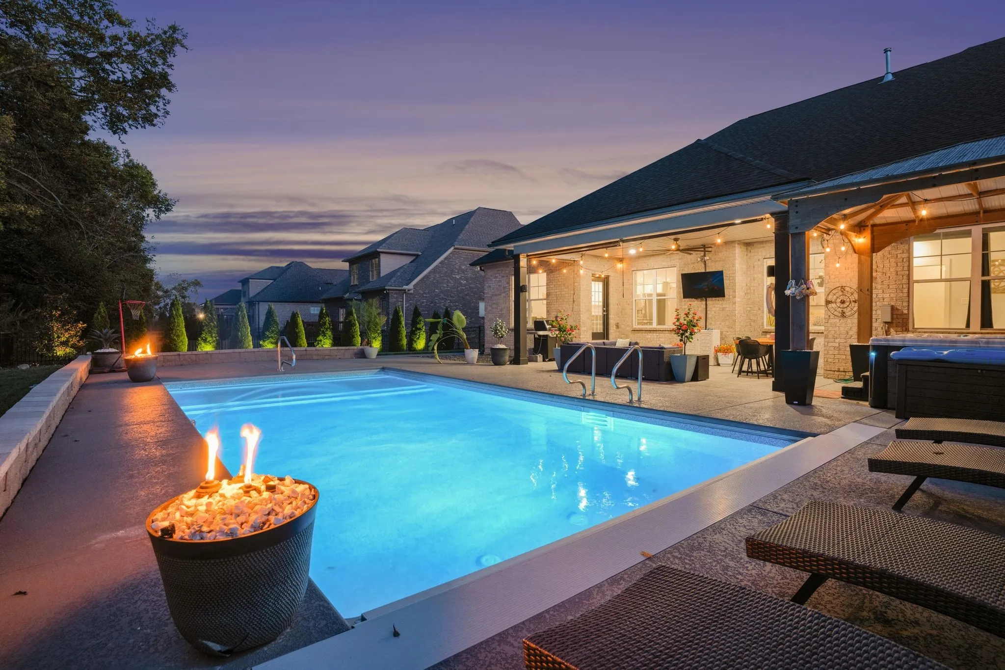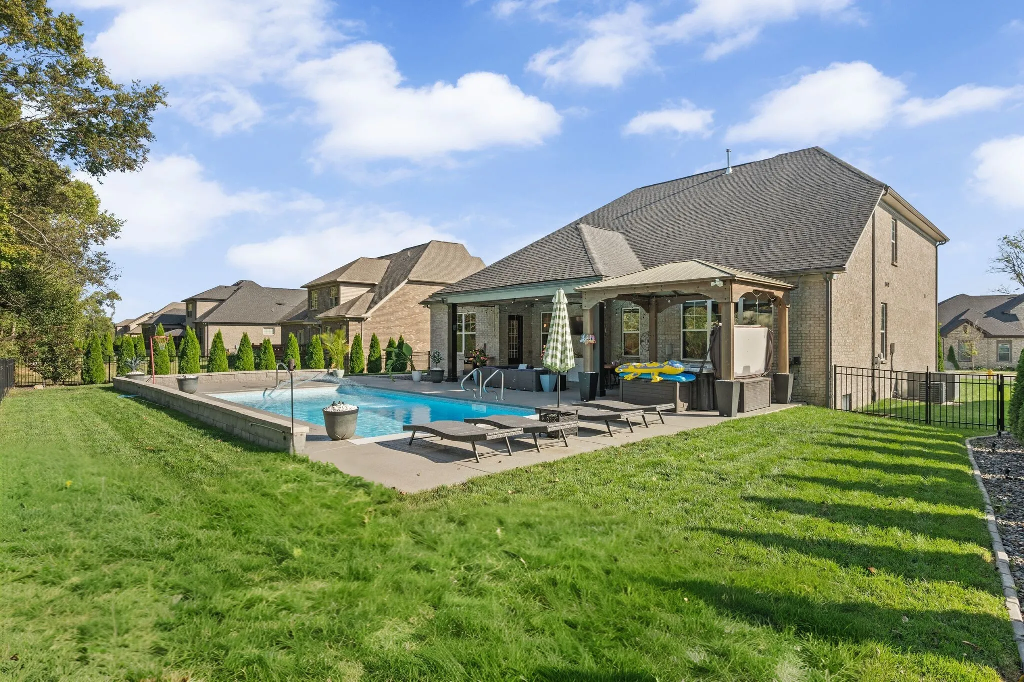Classier than a Tennessee mullet, this house is the epitome of “business in the front, party in the back!” Tucked in the heart of the highly sought-after Kennesaw Farms community, this 4-bedroom, 3-bathroom home is the perfect blend of modern design, thoughtful upgrades, and resort-style living. Built in 2021, every detail—inside and out—has been carefully customized for style, functionality, and entertaining. Step inside and you’re greeted by a stunning stone-accented stairwell that sets the tone for the rest of the home. The open-concept living and kitchen area features an oversized island, elegant built-out electric fireplace, and seamless flow to the showstopping backyard. The downstairs primary suite is a private retreat with a designer accent wall, custom closet system, and a luxurious expanded frameless shower. Upstairs, you’ll find two spacious bedrooms (one oversized with a walk-in closet), a full bath, a versatile bonus room, and a massive walk-in attic for storage. Every inch of the home has been optimized, including custom pantry shelving, a dry bar, drop zone, Rain Bird irrigation system, and a functional laundry room complete with utility sink. Even the 3-car garage impresses—with epoxy floors, built-in work area, and a reinforced safe room. But it’s the backyard oasis that truly steals the show. Imagine relaxing in your in-ground pool with wading area and retractable cover, unwinding in the hot tub beneath a beautiful pergola, or hosting friends under the covered entertainment area—complete with surround sound, pull-down shades, and a built-in gas grill. Surrounded by lush arborvitae trees for total privacy, this space is pure perfection. Capitalize on the savings of a free appraisal and up to $9,500 toward your closing costs by using preferred lender – William Potts, PRMI, 615-512-2967