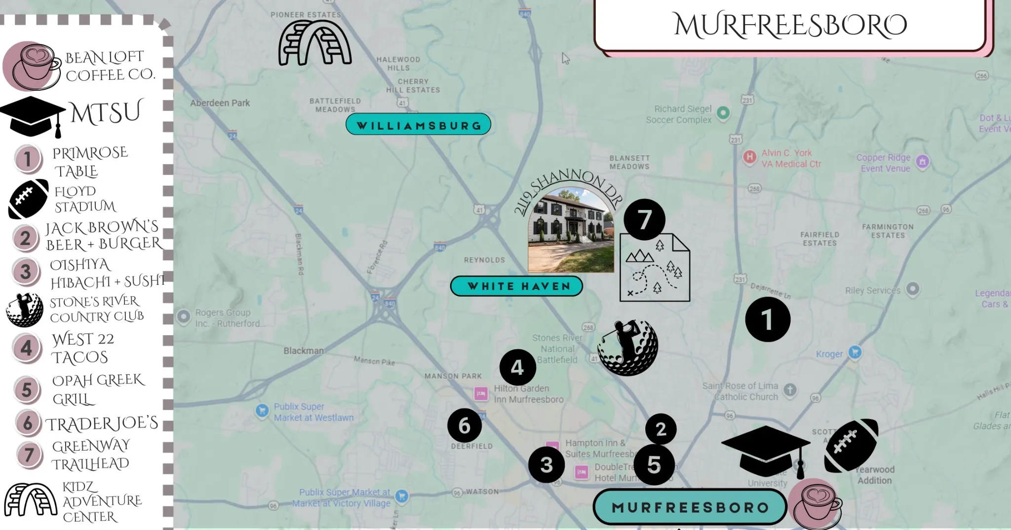 - Directions: From I24 take exit 74B for TN 840 E toward Knoxville, continue to exit 55A-B US -41S/US-70S E toward Murfreesboro, Merge east then left on N Thompson Ln, then left onto Riverbend Dr, left onto Shannon Dr, house is on the left.