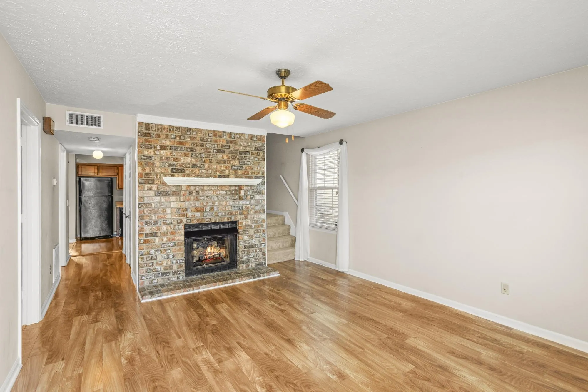 End unit with privacy fence around back yard. Primary bedroom on main level and 2 bedrooms up. Wood laminate floors and gas logs. Large walk-in storage upstairs that could be finished into living space. Community has pool tennis courts and club house.