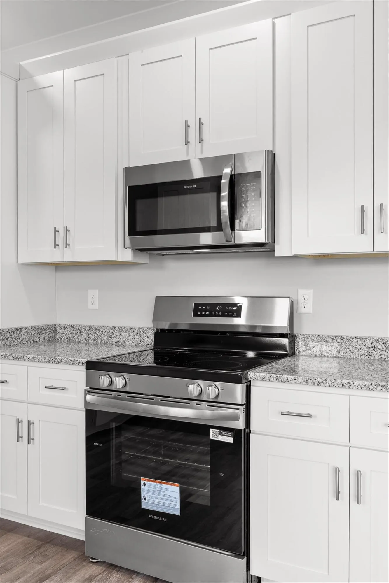 The open layout flows into a bright, inviting kitchen finished with granite countertops, white shaker cabinets, shiplap accents and a full Frigidaire stainless-and-black appliance package – range, microwave, dishwasher, and refrigerator already in place.