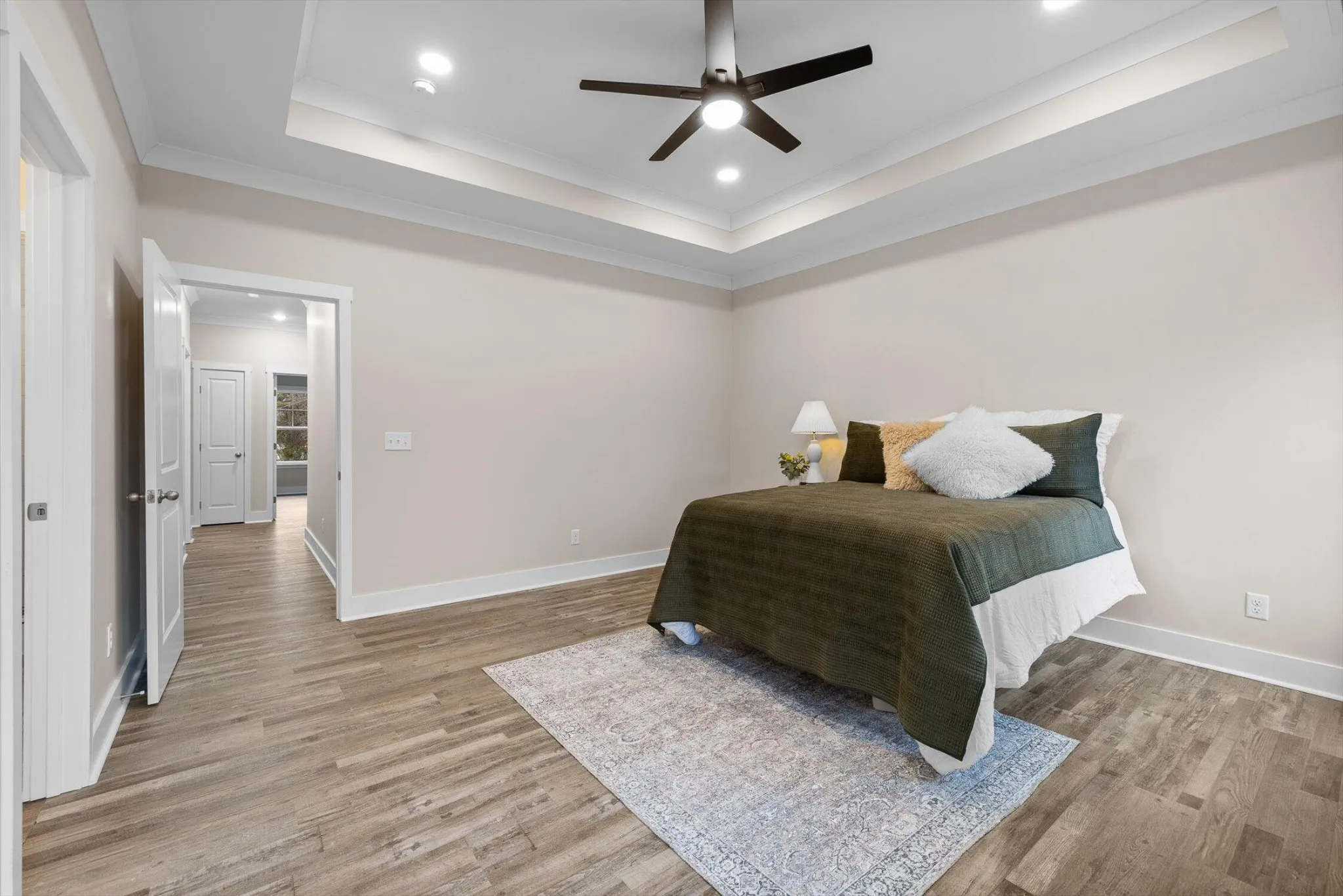 The primary suite is designed for full relaxation. With tray ceilings, a walk-in closet, and a spa-like bathroom that includes a custom tiled walk-in shower and dual granite vanities.
