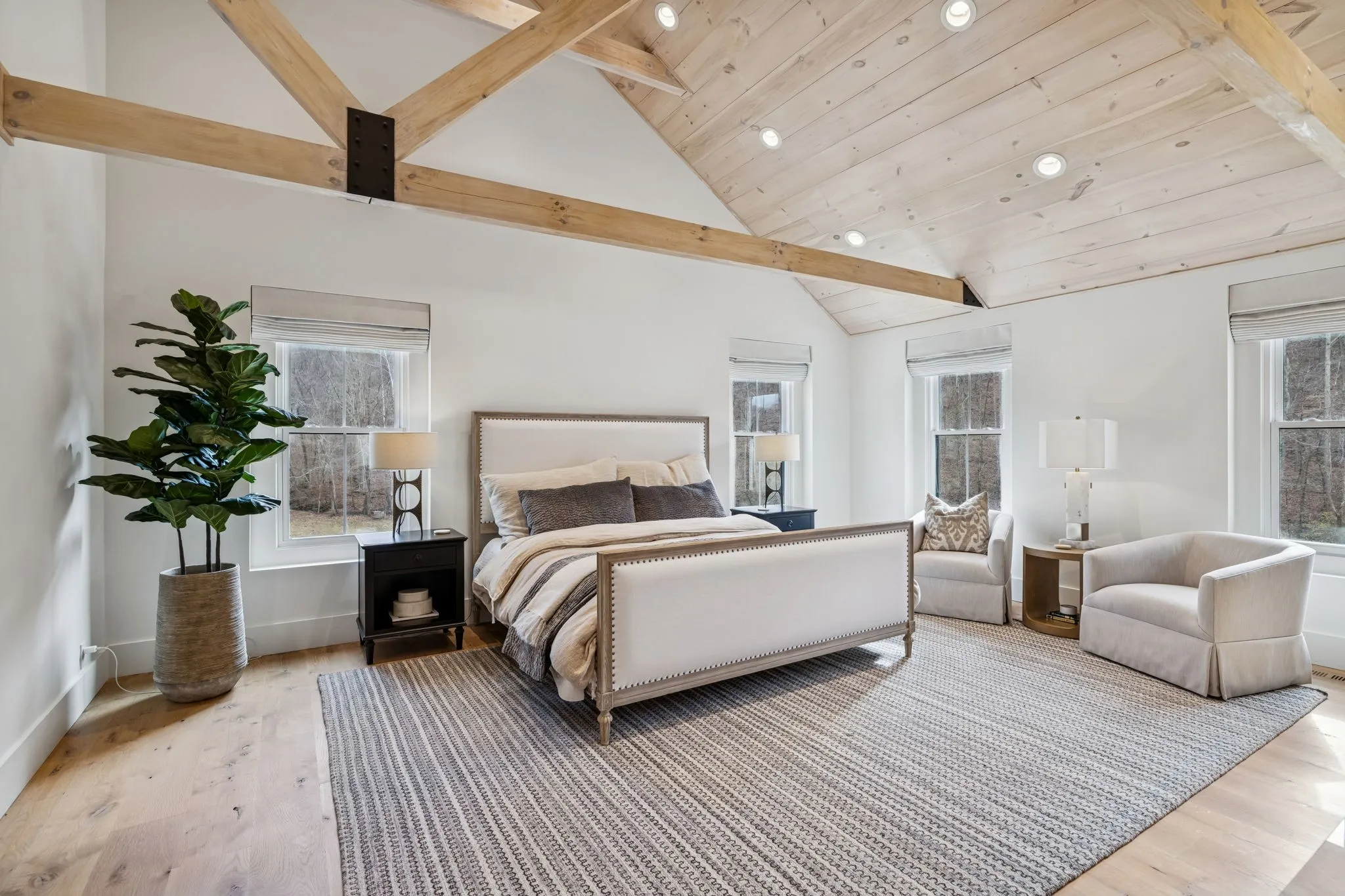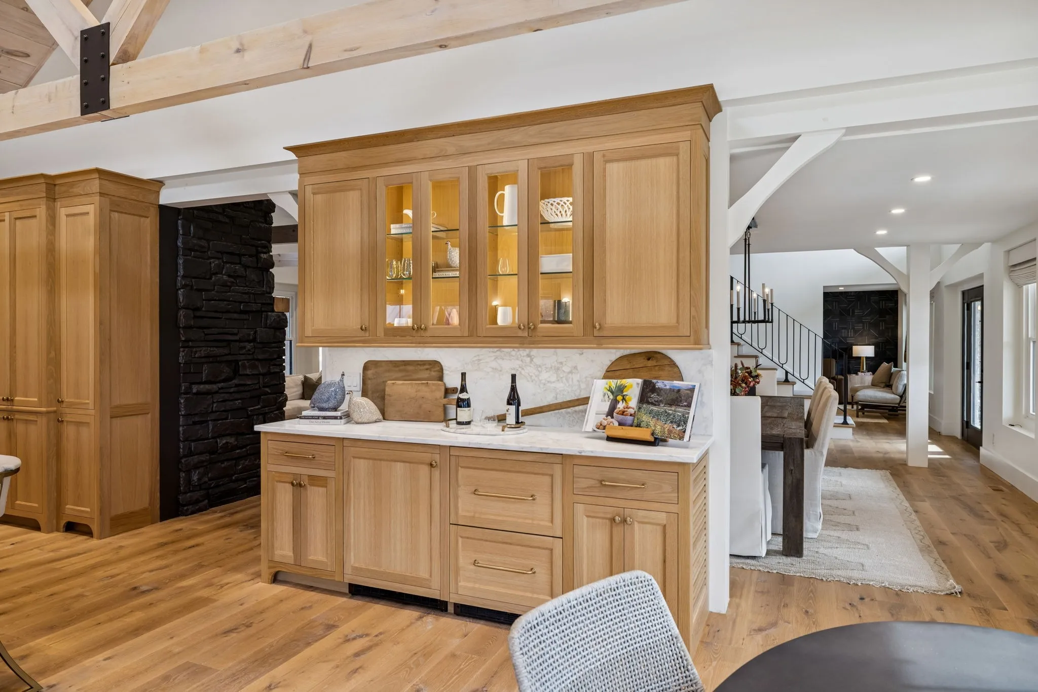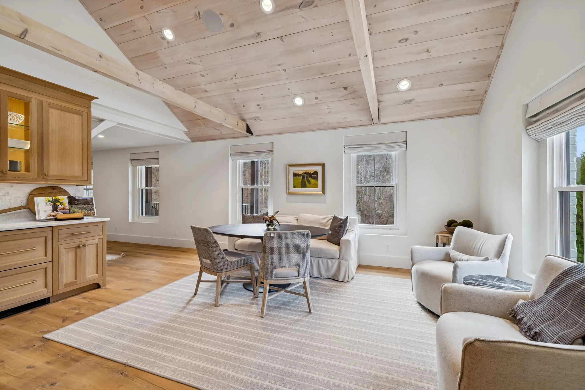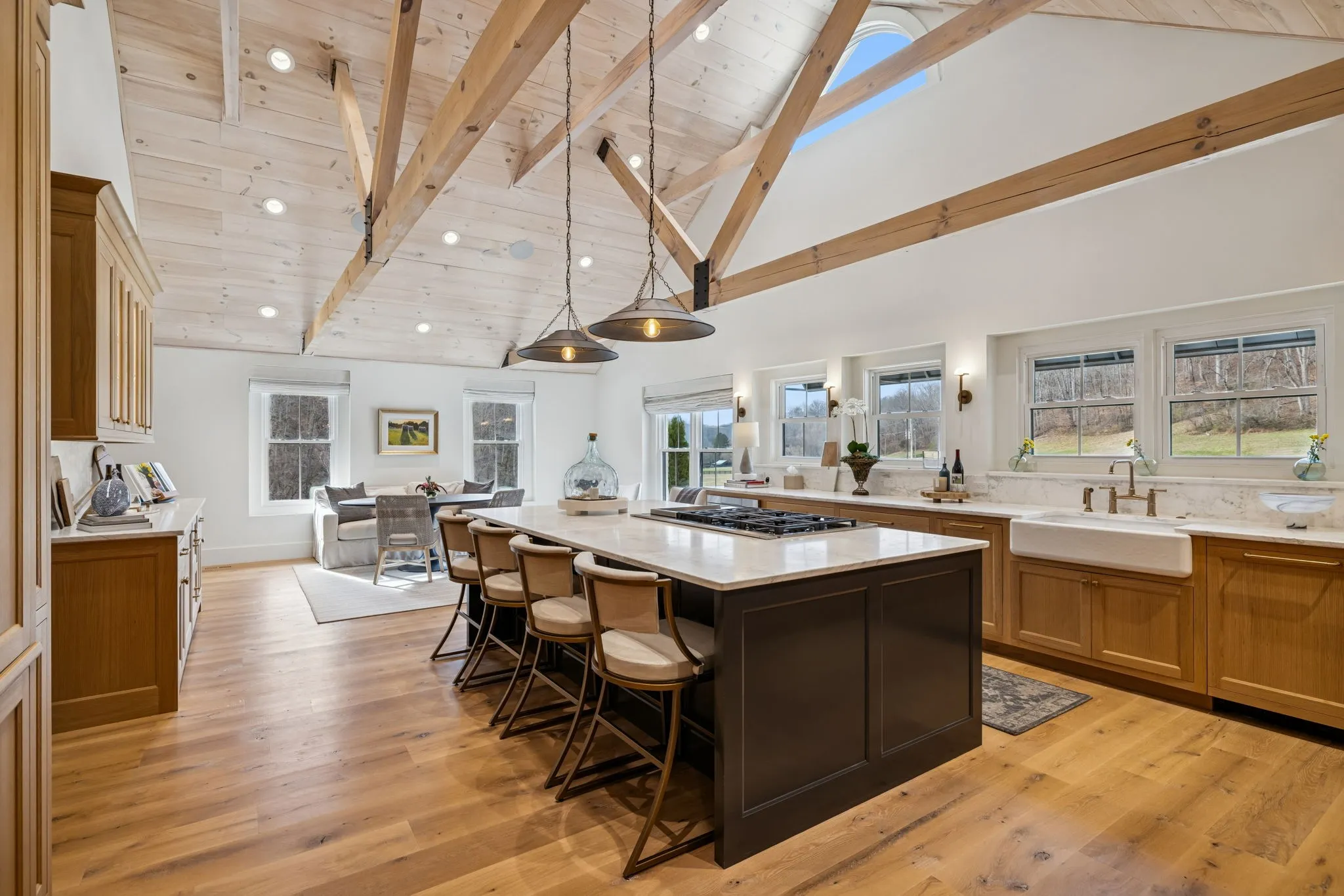 Anchoring the property, the 6,000 sq. ft. main residence is a Kathryn Zelenik Designs renovated masterpiece, offering 5 bedrooms, 5.5 baths, wide-plank white oak floors, custom cabinetry, and a light-filled master suite with sweeping views. With sleeping accommodations for up to 20, it effortlessly blends scale, sophistication, and comfort, creating the ideal setting for hosting guests or retreating with family.