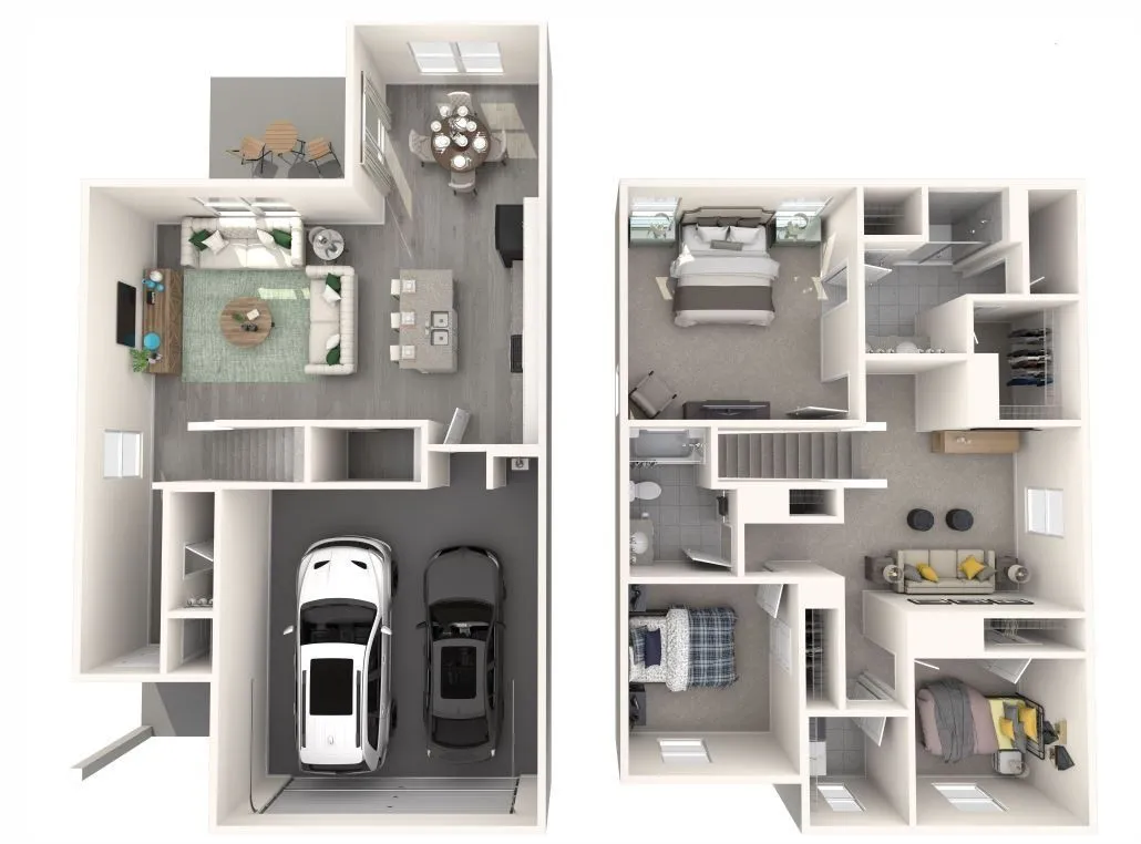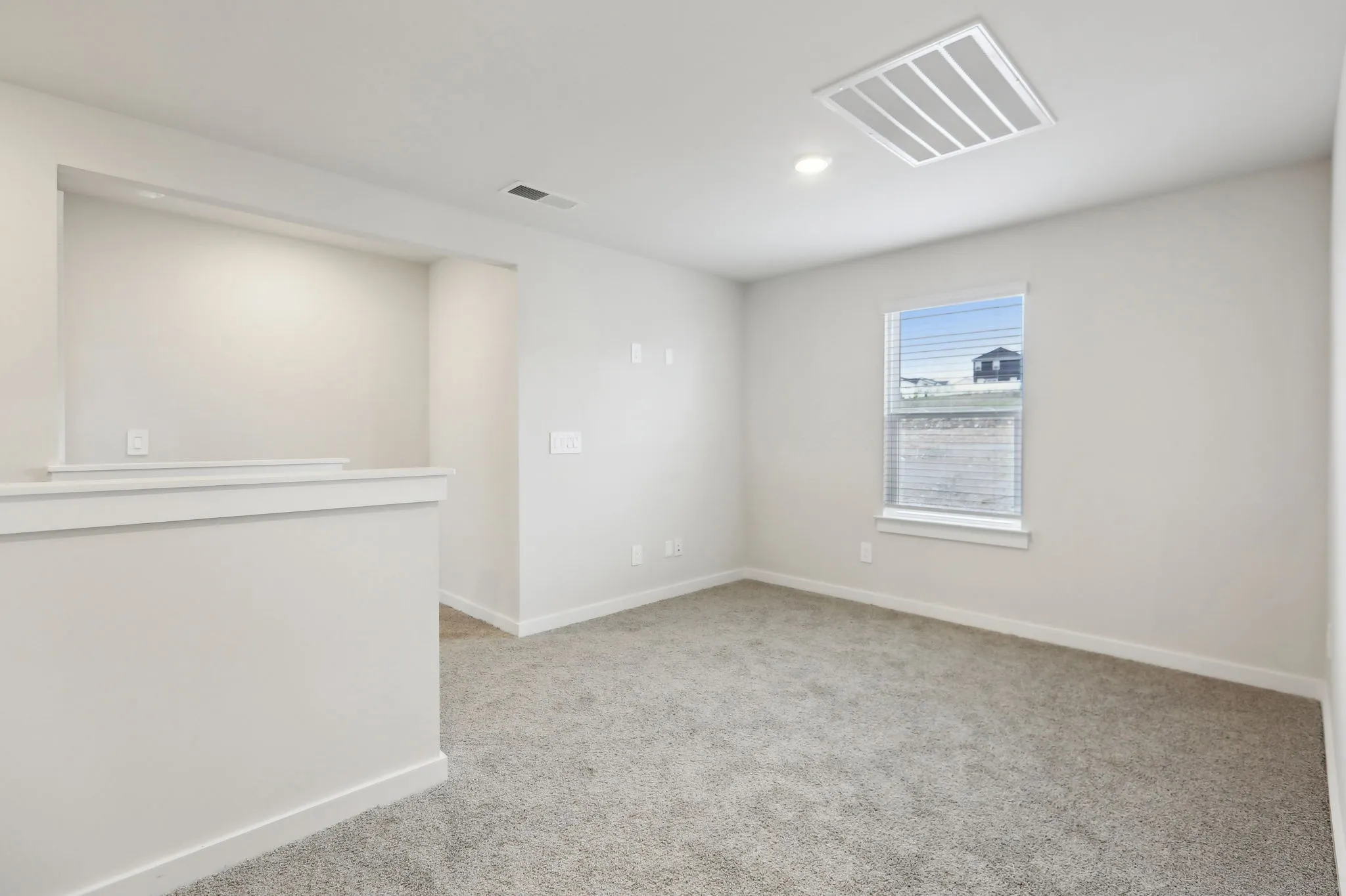 Upstairs, a spacious loft offers the ideal spot for a media room, playroom, or home office. This home features a Sleek design package, including white cabinets, white quartz countertops, EVP flooring, and multi-tone carpet for a modern, clean look.