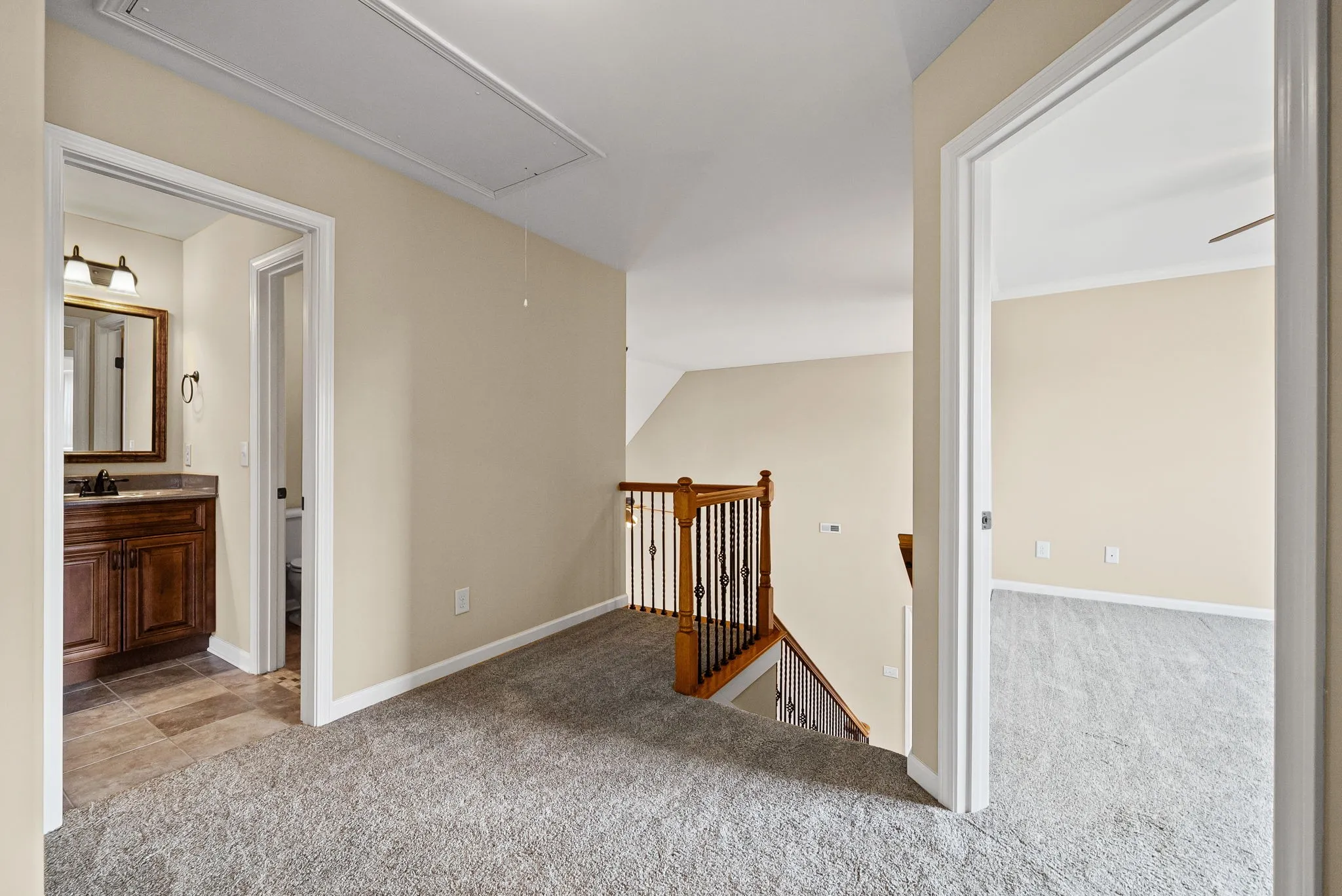 Upstairs, the home offers three additional bedrooms, a shared full bath with dual sinks, and generous attic storage. One of the bedrooms is large enough to be a bonus room if desired. A dramatic “open-to-below” feature brings natural light into both levels and adds architectural interest.\n