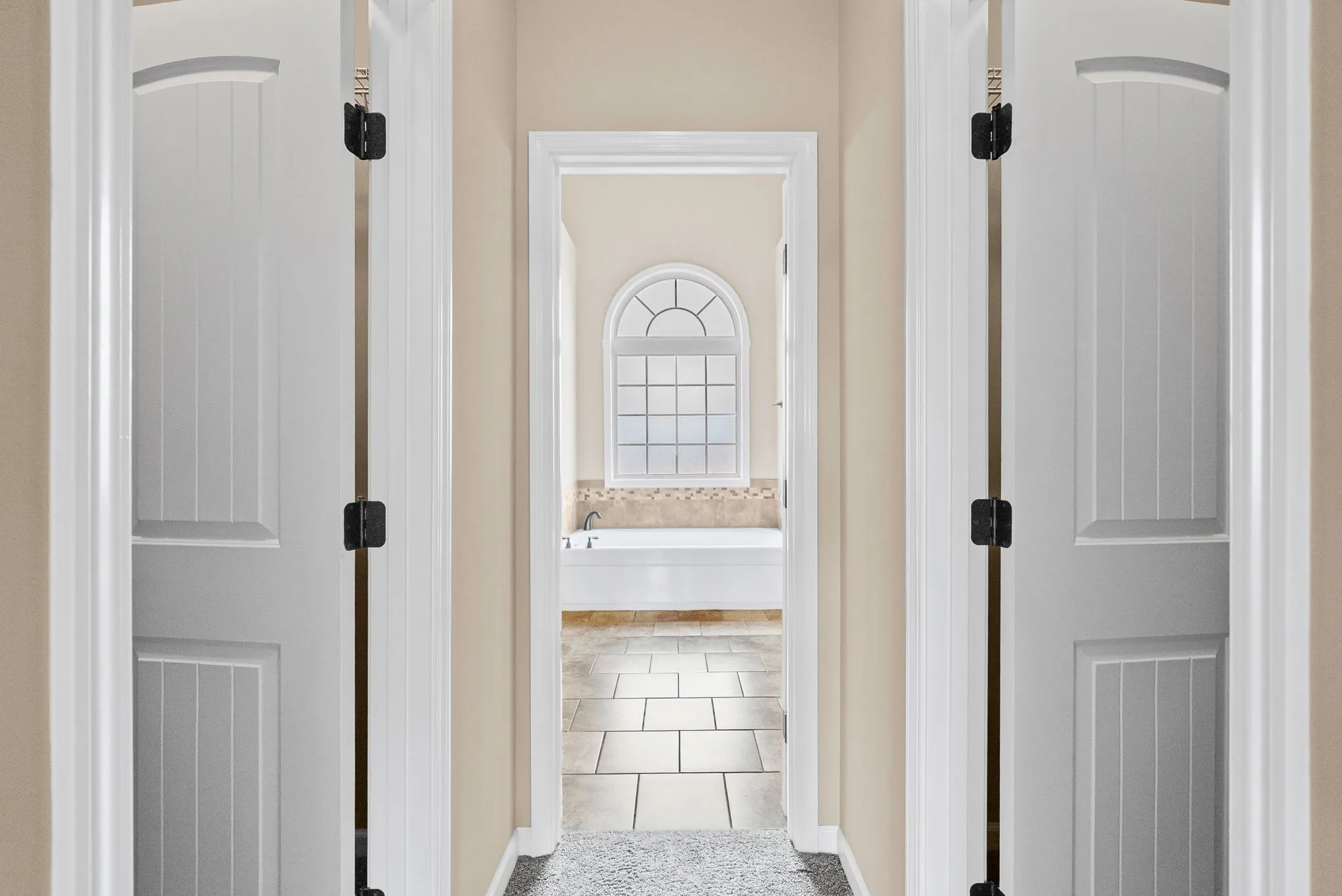 The primary suite is privately tucked on the main floor and includes dual walk-in closets and a large en-suite bathroom with separate tub, shower, and separate vanities. A secondary bedroom and full bath are also located on the main level along with a dedicated laundry room with a utility sink.\n