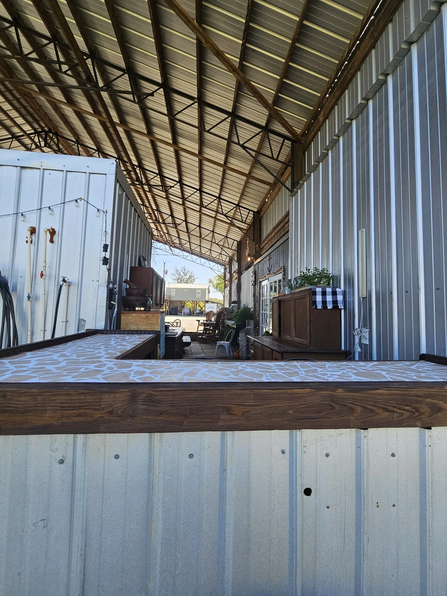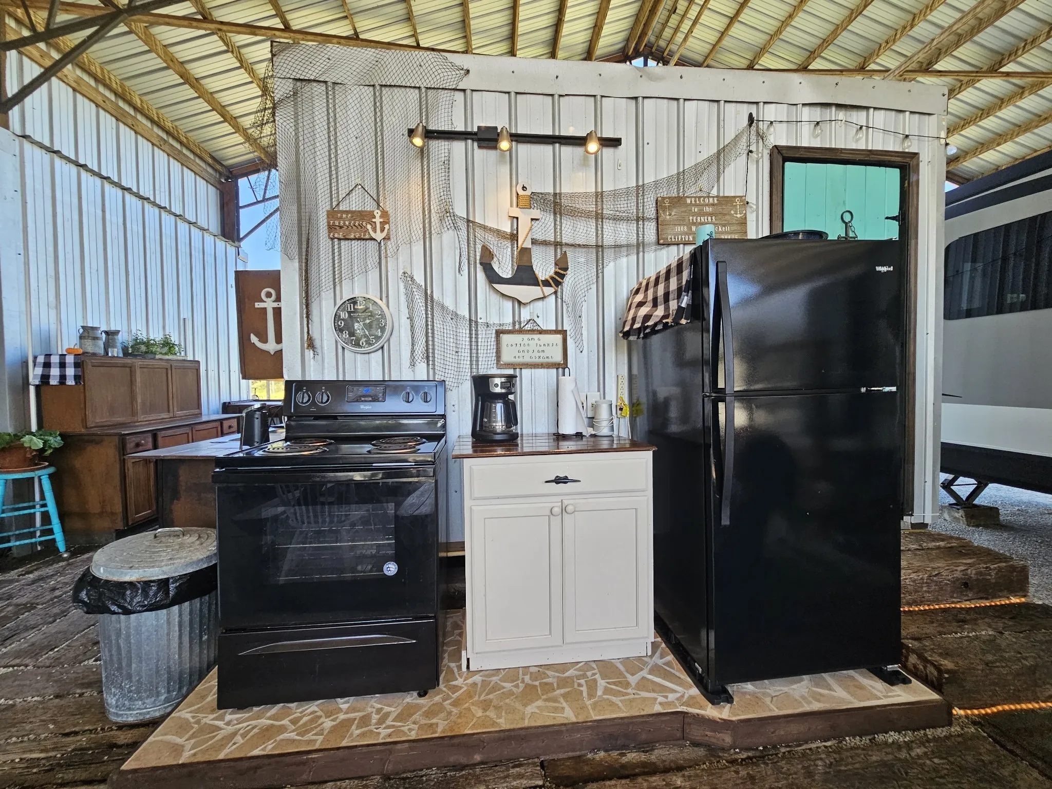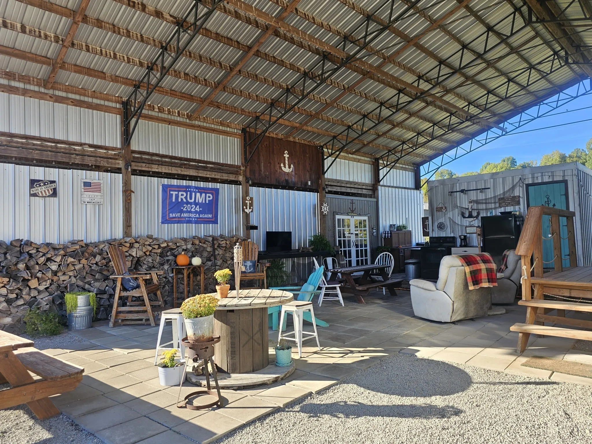 One of a kind property built on 2 lots ! Outdoor living at it’s best with 2600 sq ft under roof! House your RV with a full size outdoor kitchen plus a bar area, enclosed laundry and full bath, and a workshop/garage area with an air compressor! Additional carport cover for another vehicle. Privacy galore and tastefully decorated with a river view! The seller incorporated 100 yr old barn wood and metal plus railroad ties and French doors for a rustic style. Cook, grill, watch TV, tinker with your car, ATV or boat, hang out at the bar or host a party all under one roof! Beechview is a highly popular gated community on the TN River halfway between Nashville and Memphis. Close to golf and marinas. City water and paved roads. Furniture is included with the price. This one is move in ready! Seller will include the boat and camper into the deal for a package price of $200k!