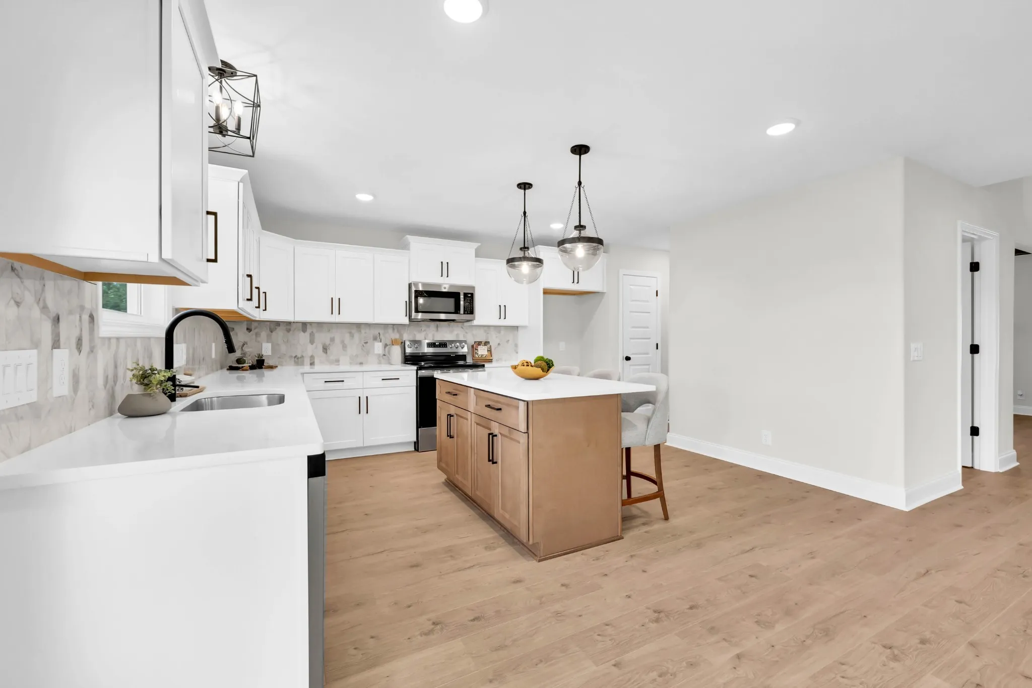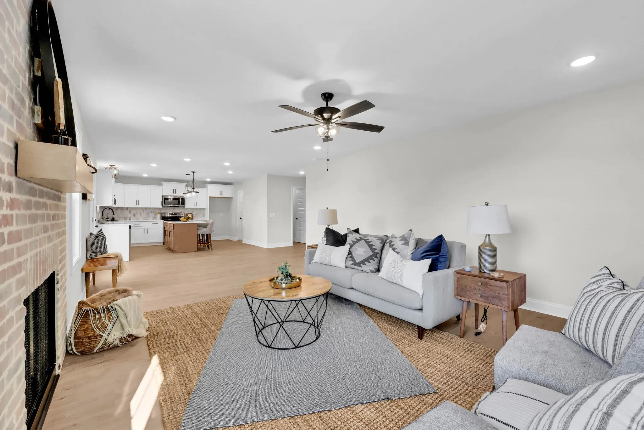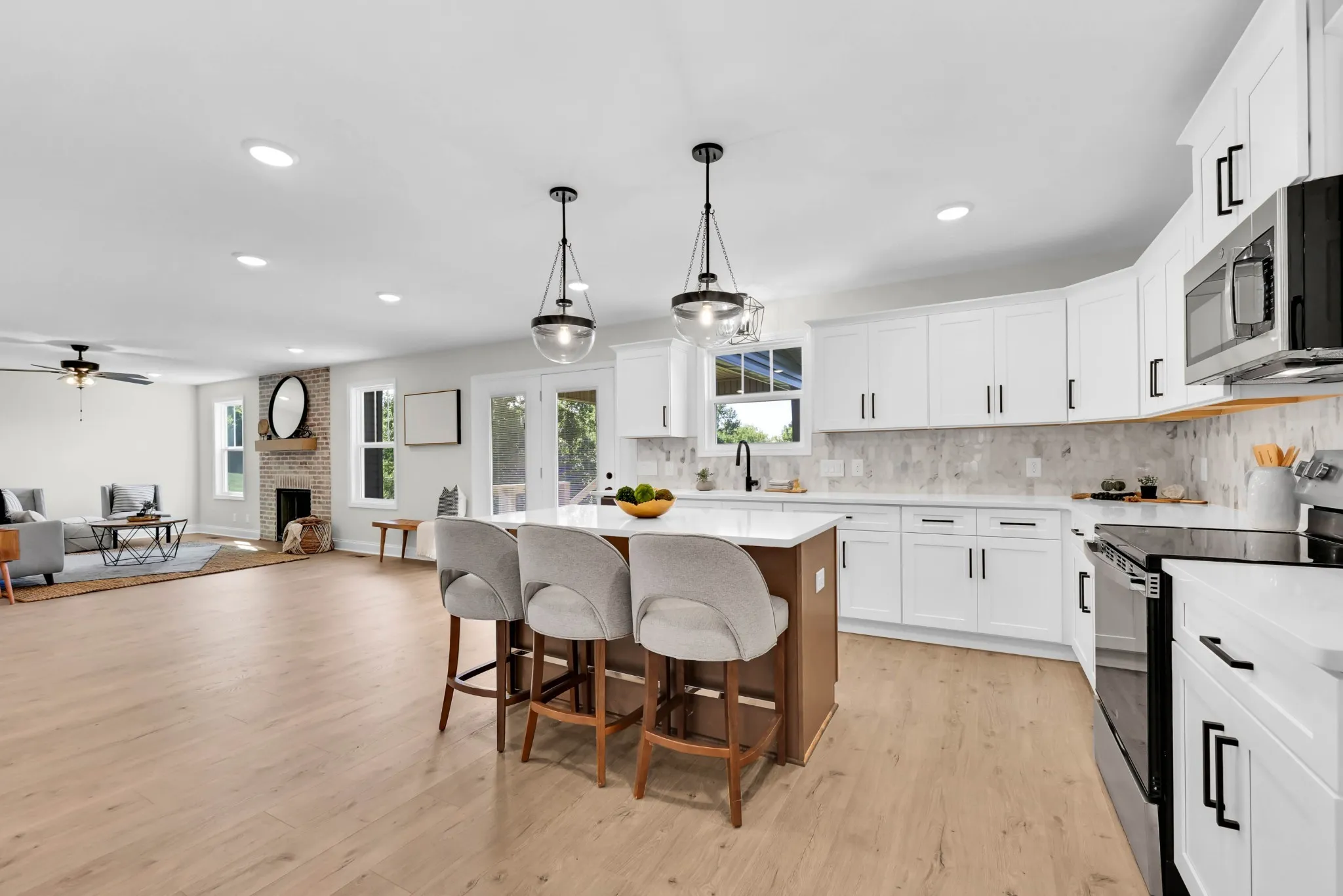 Welcome to this stunning new construction on 2.5 acres, offering the perfect blend of modern amenities and country living! Step inside to find a spacious open-concept floor plan featuring custom white cabinets and sleek stainless steel appliances in the kitchen. The inviting living room boasts a cozy fireplace with a brick surround, making it the perfect spot for relaxing evenings.