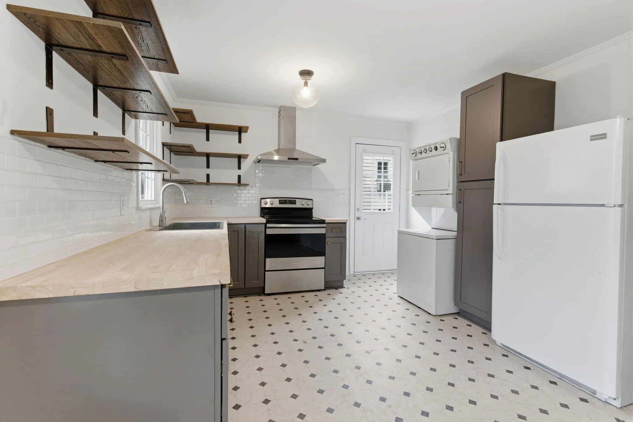 "LongDescription" => "The kitchen features convenient open shelving, framed by a white tile backsplash."