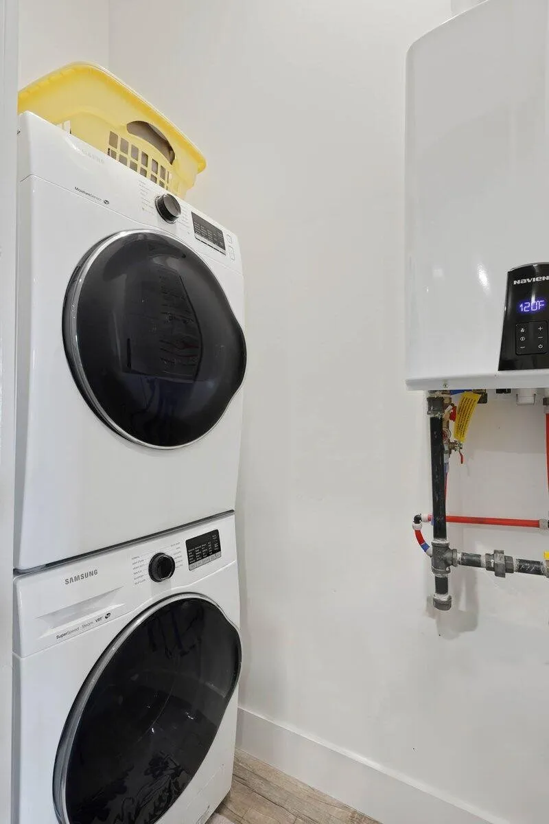 The unit is wired for both gas and electric and includes a stainless steel appliance package featuring a range, dishwasher, refrigerator, and microwave. In-unit washer and dryer hookups add valuable convenience. (All furnishings negotiable).
