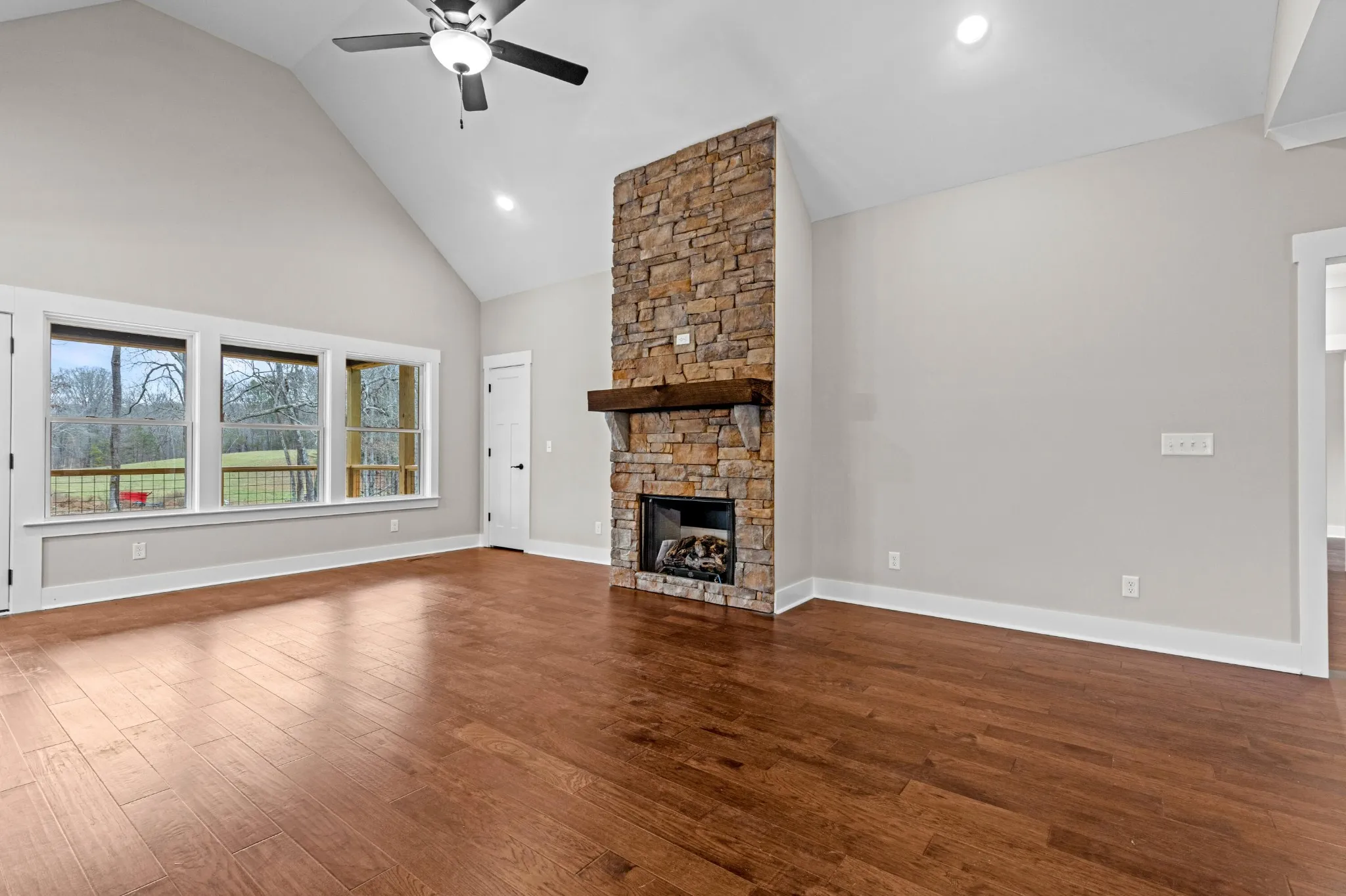 Welcome to 7395 Gamble Rd, a beautifully crafted 3-bedroom, 2-bath home with a versatile bonus loft offering additional living or work-from-home space. This inviting home features an open-concept layout where the dining area and kitchen overlook a stunning stone fireplace, creating the perfect setting for both everyday living and entertaining. Hardwood floors flow throughout, complementing the kitchen’s stainless steel appliances and modern finishes, while large windows fill the space with natural light. Step through the living area to a covered back porch with warm hardwood ceilings, ideal for enjoying peaceful views of the spacious backyard and relaxing outdoors in any season. The expansive yard offers plenty of room for gardening, play, or future enhancements, making it a wonderful option for those seeking space and privacy.