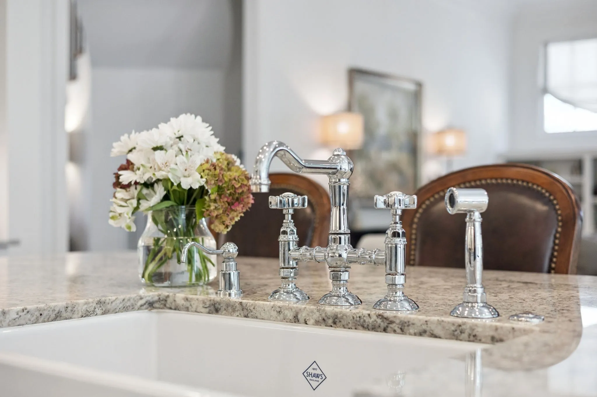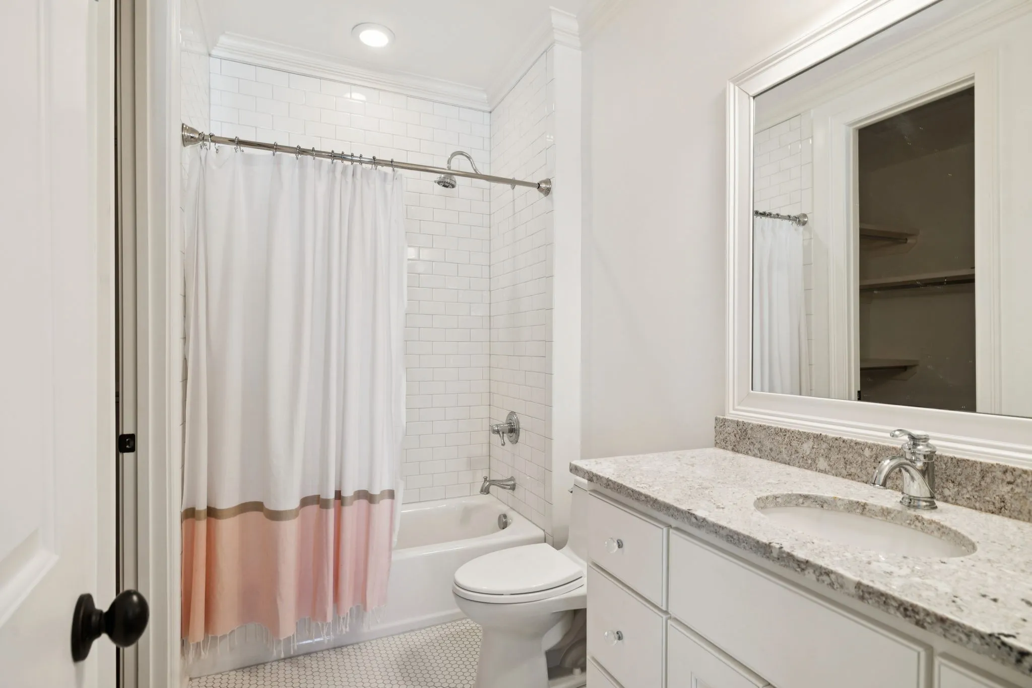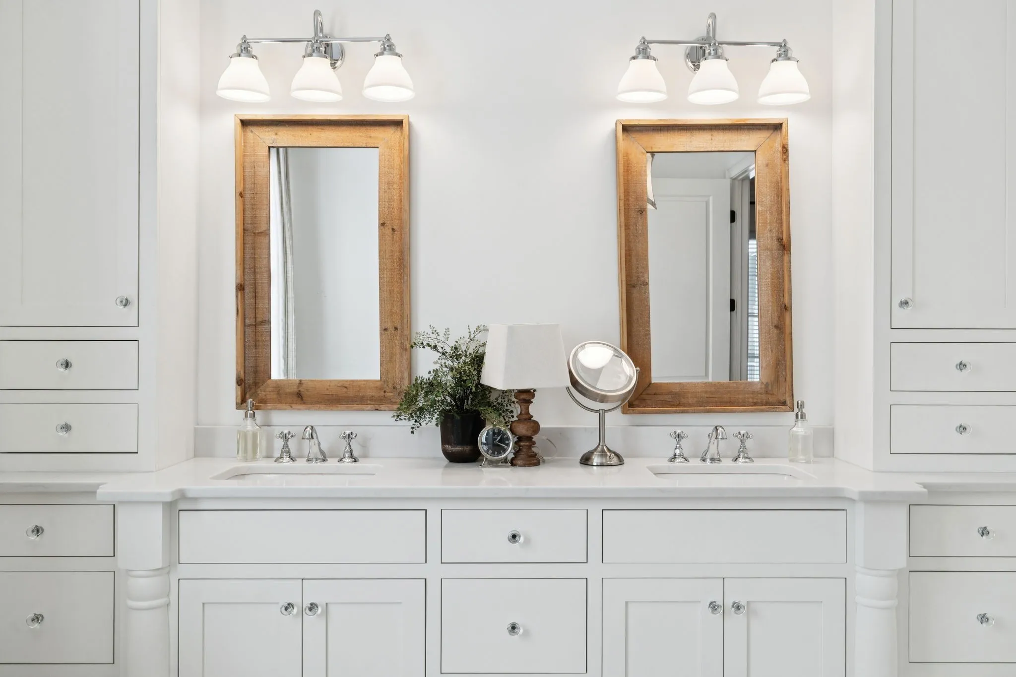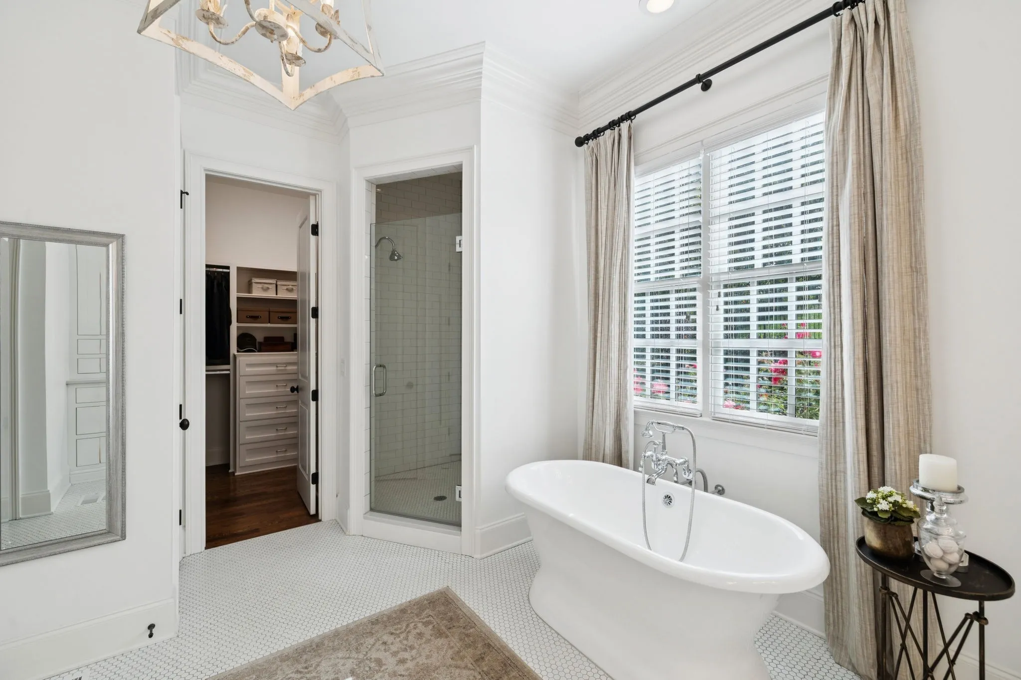 *The main-level primary suite offers his-and-hers closets, custom built-inset cabinets, & a spa-like bath with a soaking tub & separate vanities.\n