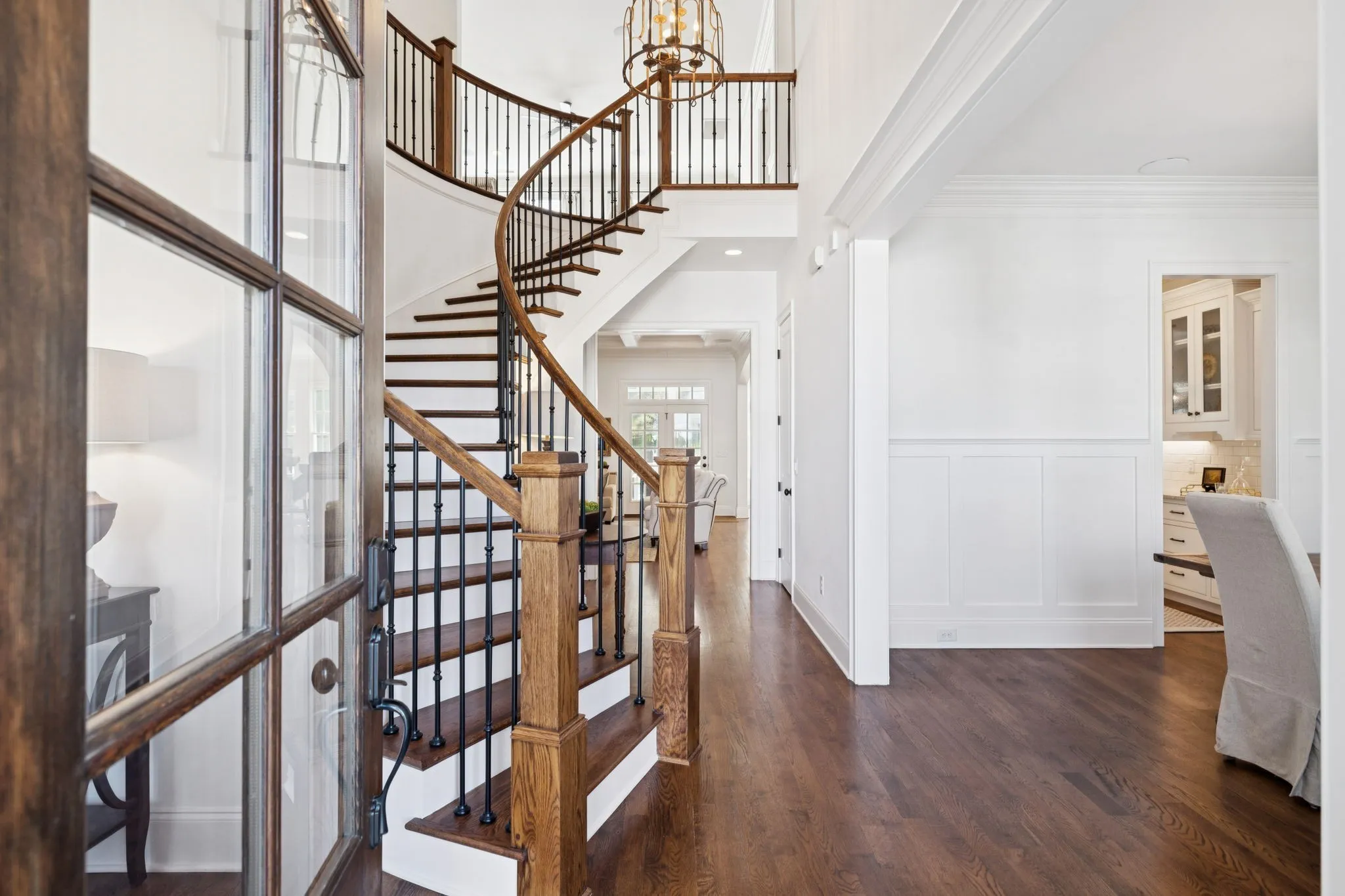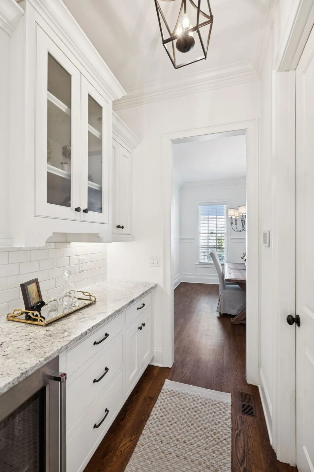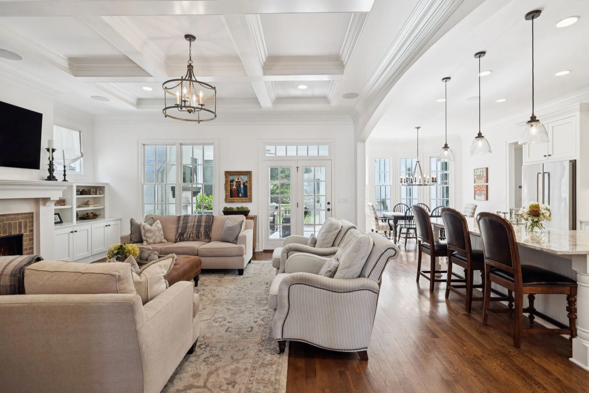 *The formal dining room offers a butler’s pantry, beverage fridge & opens to the gourmet kitchen, featuring a Thermador range with double ovens, farm sink, walk-in pantry, & custom inset cabinetry. The kitchen overlooks a large family room, highlighted by custom built-ins, cozy gas fireplace, & coffered ceilings, creating the perfect gathering space.\n