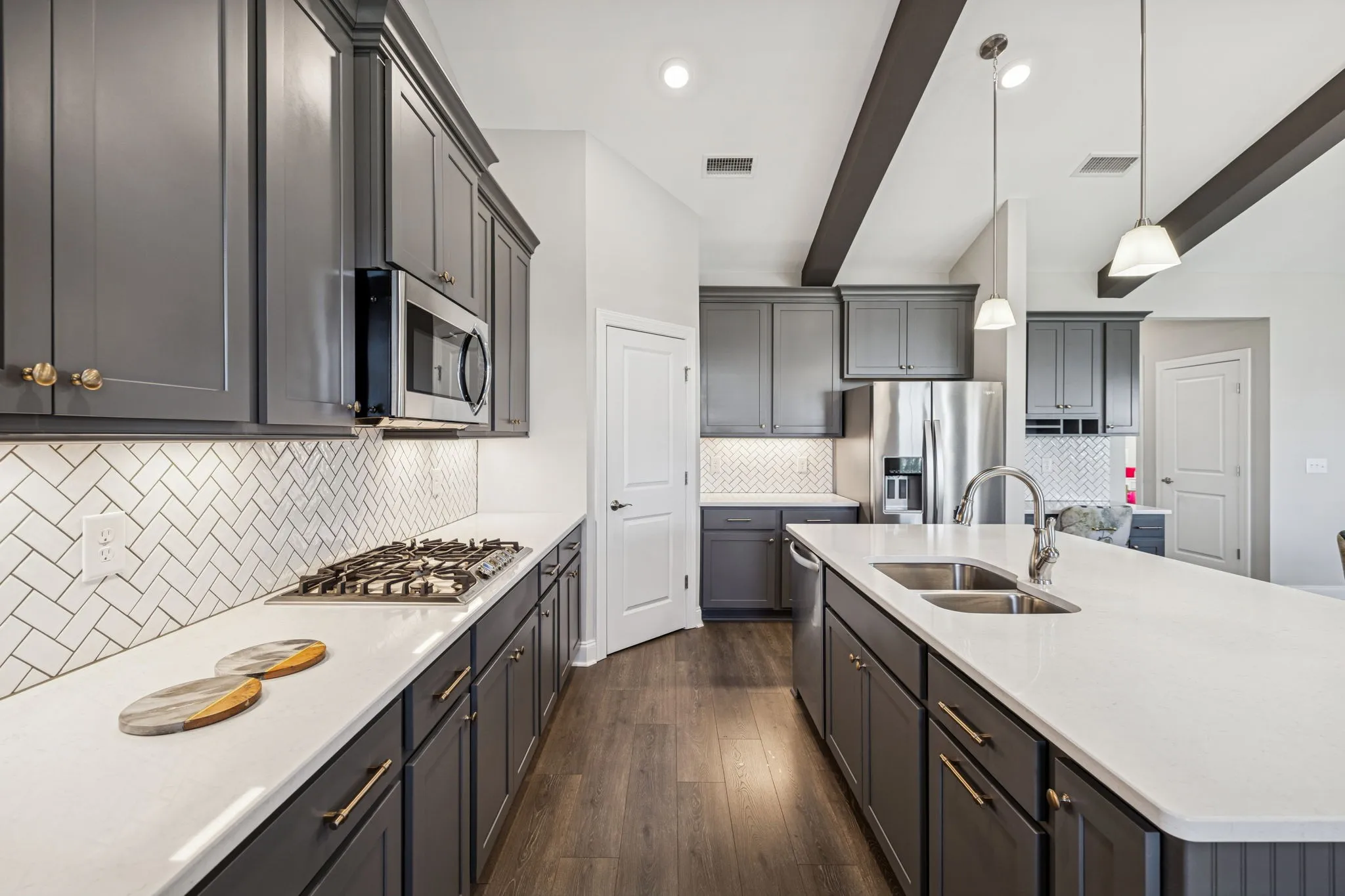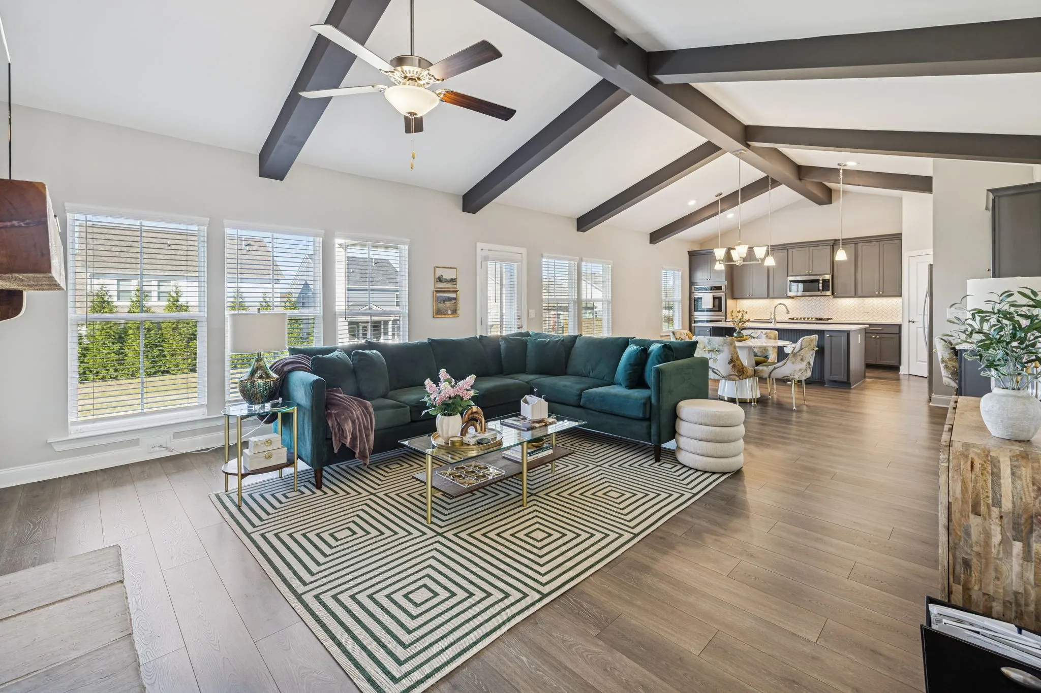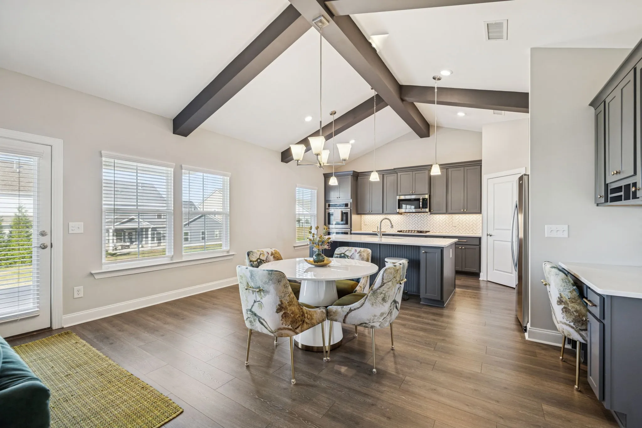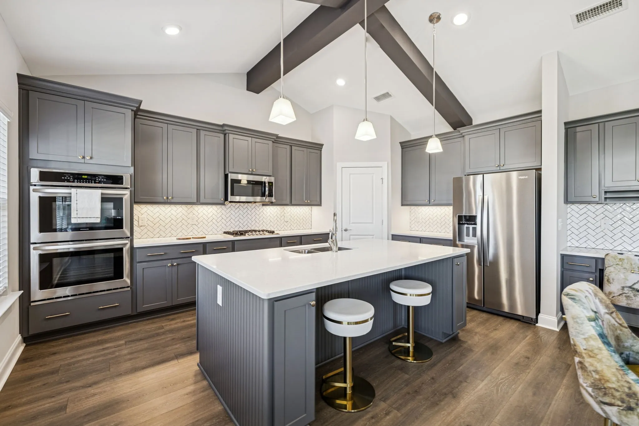 Upon entry, a versatile flex space welcomes you—perfect as a formal dining room, private home office, or cozy sitting room, offering adaptable functionality to suit your lifestyle. Natural light fills the home, highlighting wide-plank flooring, soaring ceilings, and a stunning great room with exposed beams and a dramatic floor-to-ceiling stacked-stone fireplace. The chef’s kitchen impresses with quartz countertops, custom gray cabinetry with gold hardware, stainless steel appliances including double ovens, a herringbone tile backsplash, elegant pendant lighting, and a spacious island ideal for gatherings. The open-concept design seamlessly connects the kitchen, dining, and living areas for effortless everyday living and entertaining.