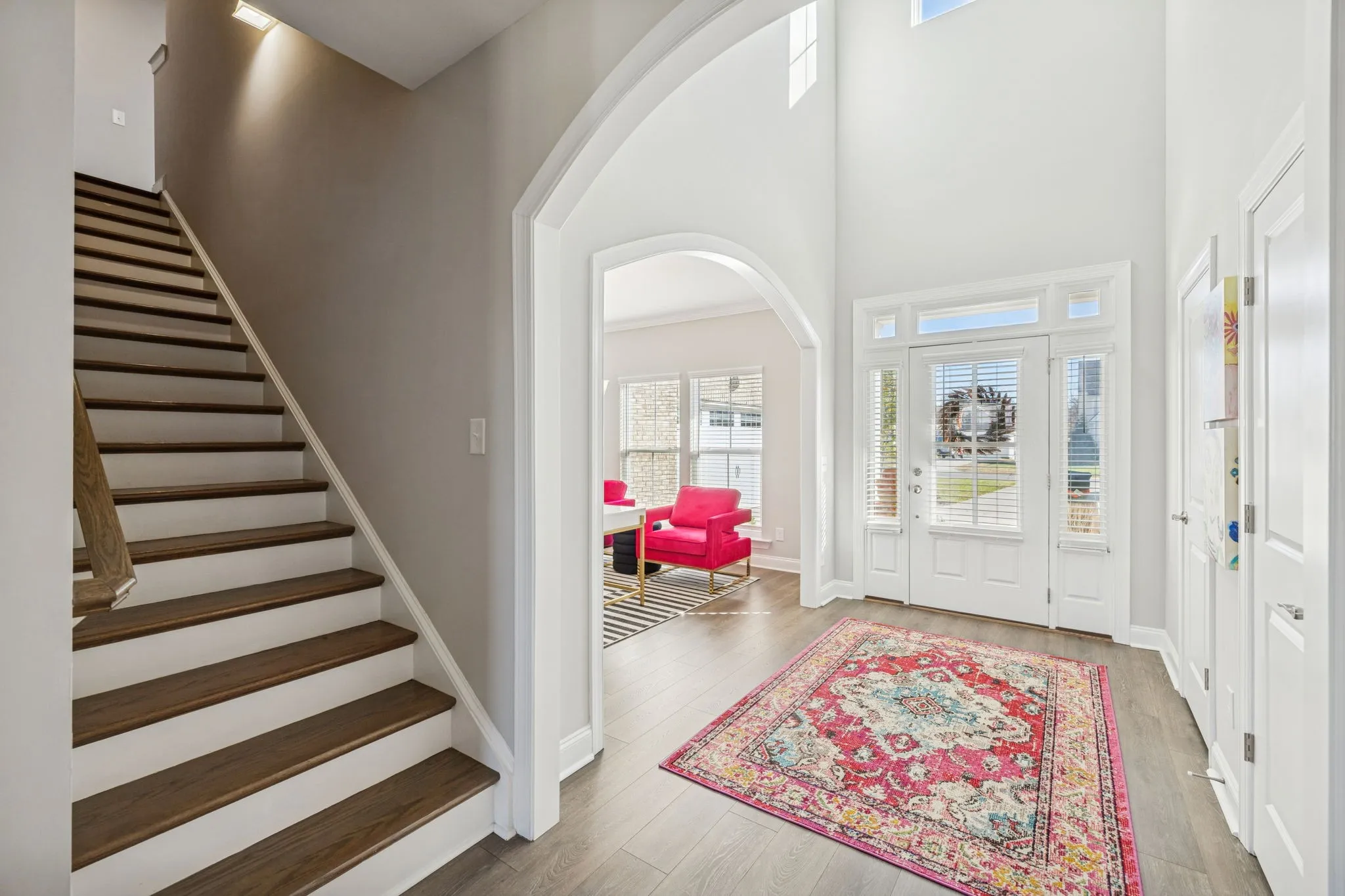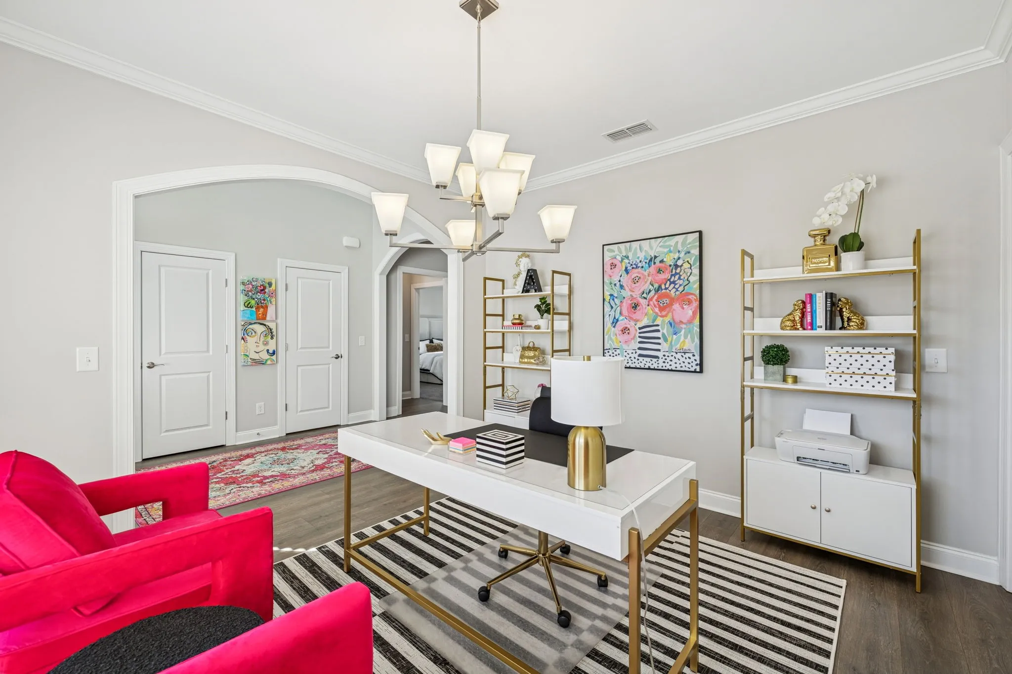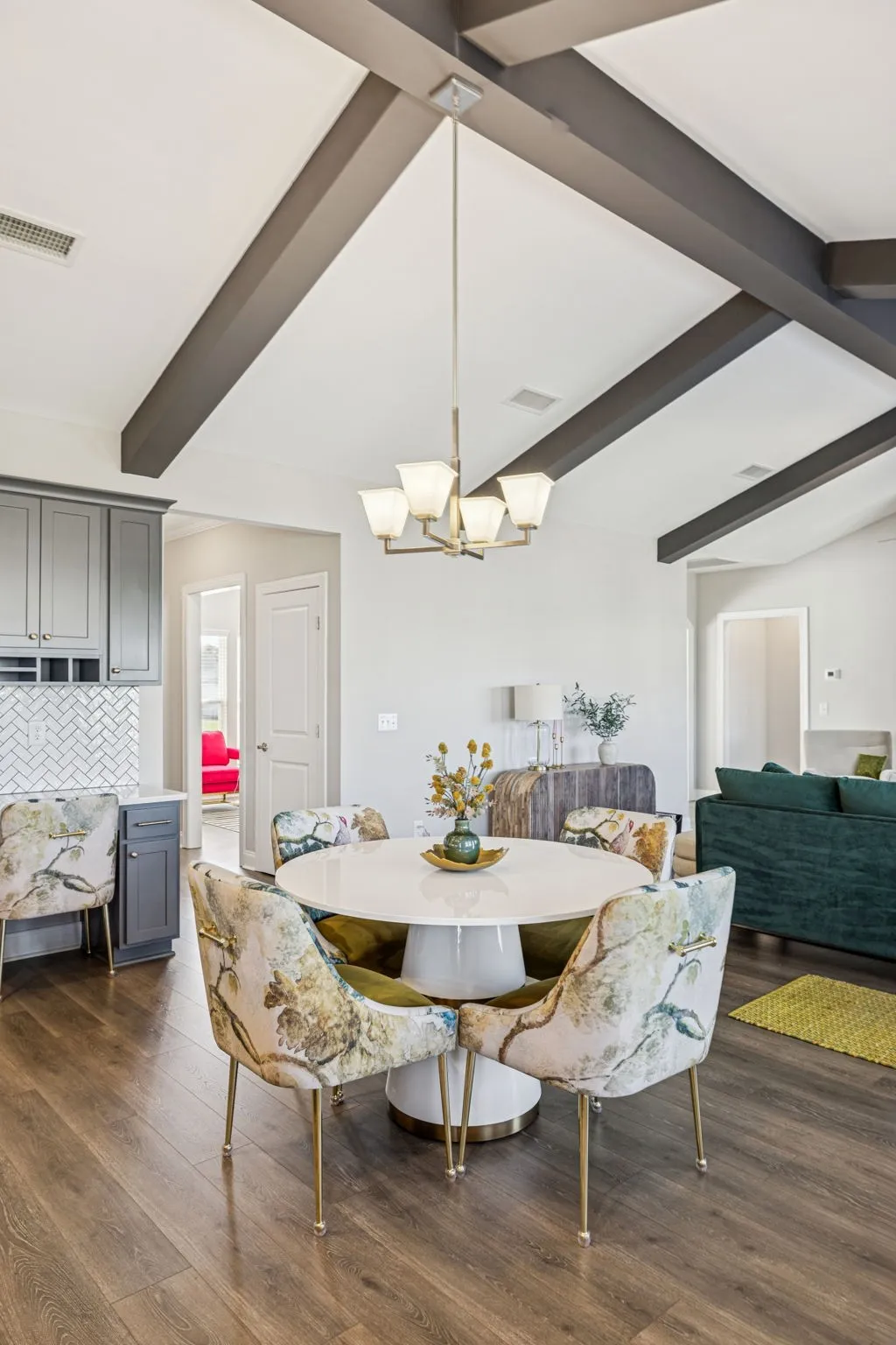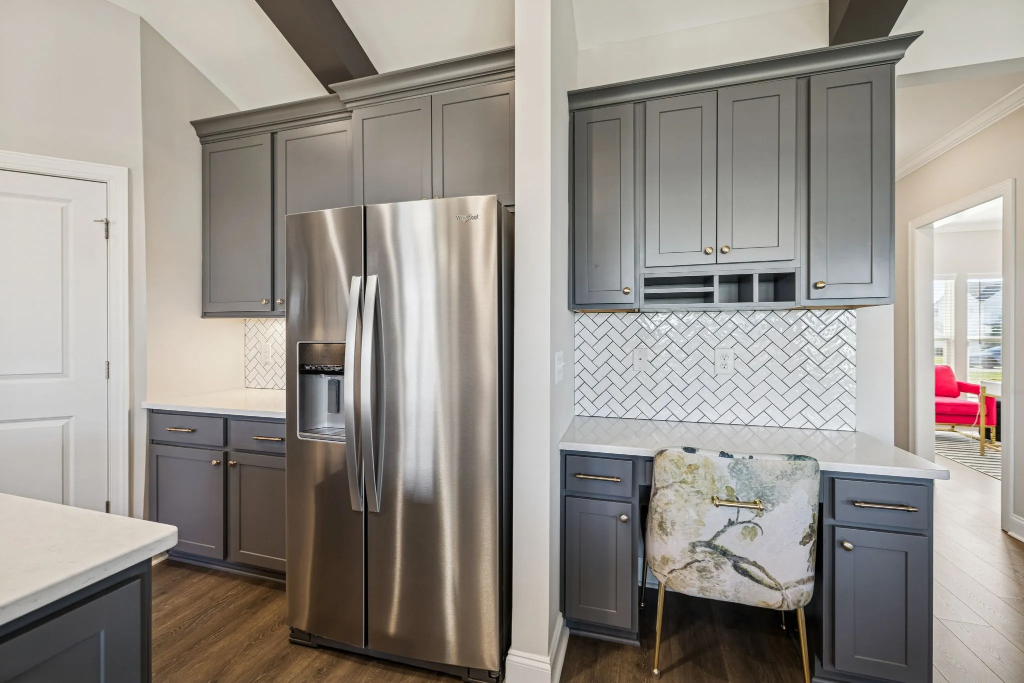 Upon entry, a versatile flex space welcomes you—perfect as a formal dining room, private home office, or cozy sitting room, offering adaptable functionality to suit your lifestyle. Natural light fills the home, highlighting wide-plank flooring, soaring ceilings, and a stunning great room with exposed beams and a dramatic floor-to-ceiling stacked-stone fireplace. The chef’s kitchen impresses with quartz countertops, custom gray cabinetry with gold hardware, stainless steel appliances including double ovens, a herringbone tile backsplash, elegant pendant lighting, and a spacious island ideal for gatherings. The open-concept design seamlessly connects the kitchen, dining, and living areas for effortless everyday living and entertaining.