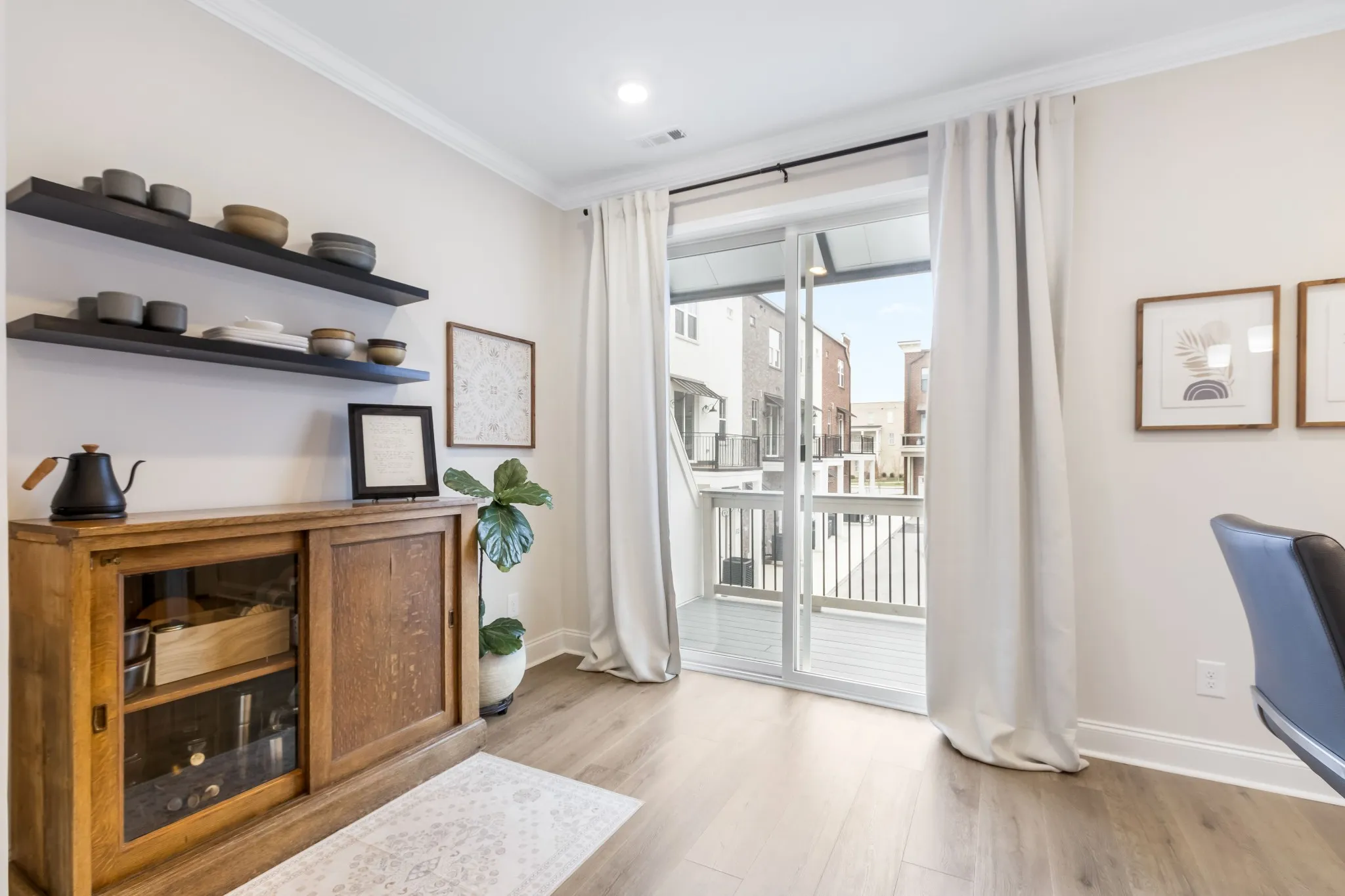The modern three-story layout features open-concept living with 9-foot ceilings, a spacious kitchen with stainless appliances, a breakfast area, and a spacious second-story deck off the kitchen. Owner-added enhancements include additional recessed lighting, custom window shades, pantry upgrades, and a professionally built-out primary closet system, providing the finishes and conveniences you often wish for after buying new construction.