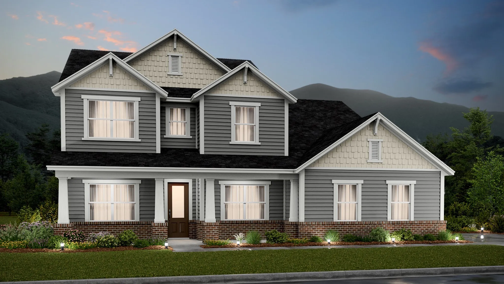 The first floor of this two-story home shares an open layout between the kitchen, nook and family room for easy entertaining and access to the patio for outdoor lounging. A more formal dining room is at the front of the home for dinner parties and a study to work from home. Two bedrooms are on the first floor, including a luxe owner’s suite and a secondary bedroom, ideal for overnight guests. Upstairs are three secondary bedrooms, a versatile game room and a media room for added living space. *Images from a furnished model of this home. Actual configuration and features may vary.