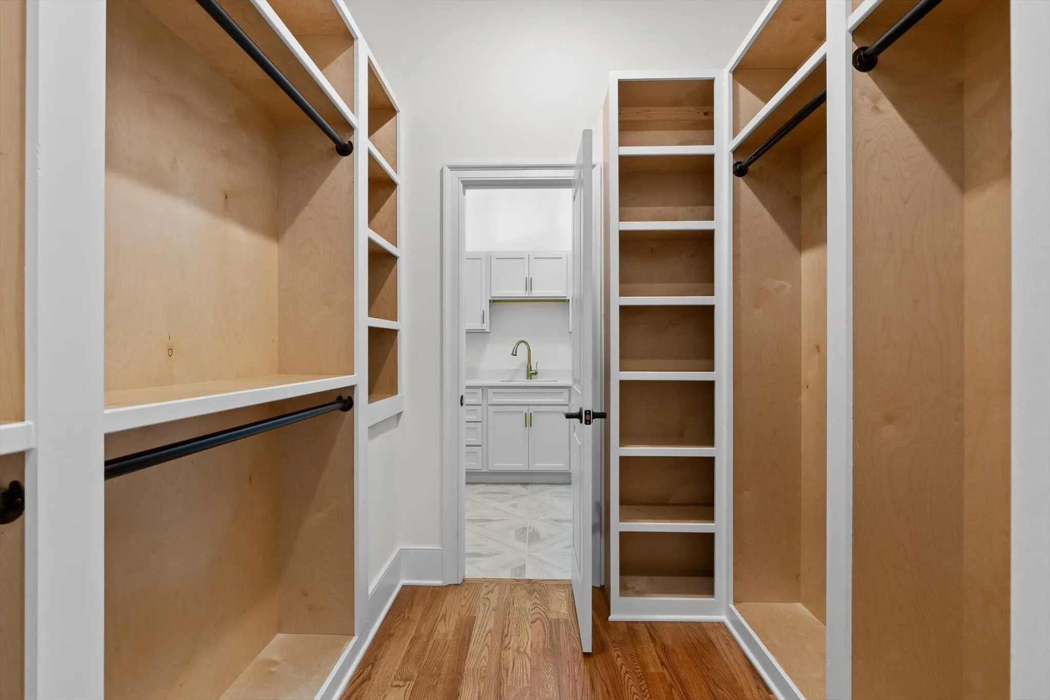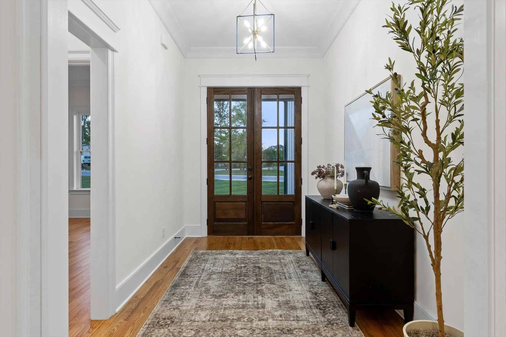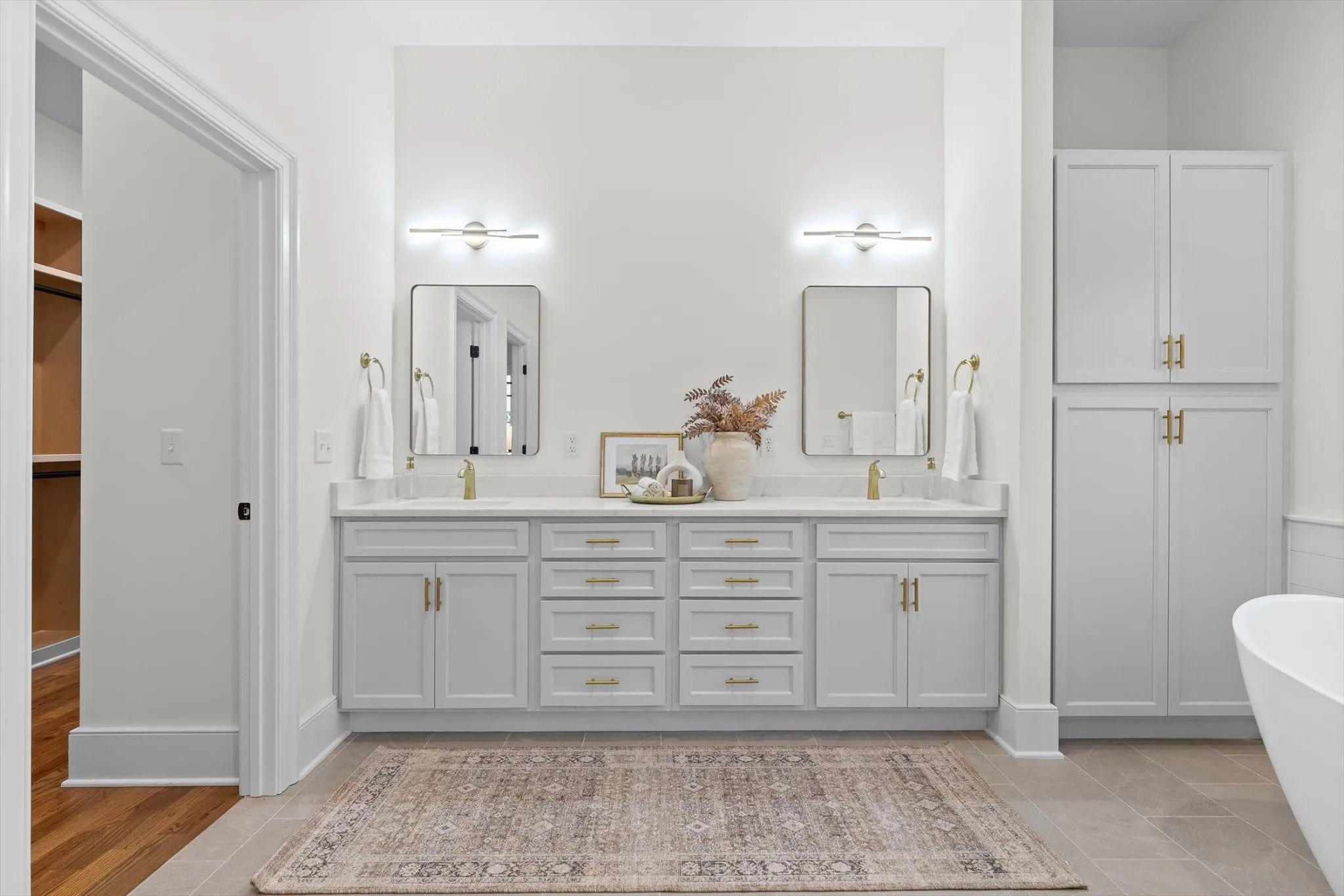 The main-level primary suite offers a spa-inspired bath with soaking tub, dual vanities, and tiled walk-in shower, plus a spacious walk-in closet connecting directly to the laundry room. The laundry is complete with a sink and full cabinetry. Adjacent, a secondary exterior entrance leads into a well-planned hall mudroom with built-in shelving, hooks, and storage.