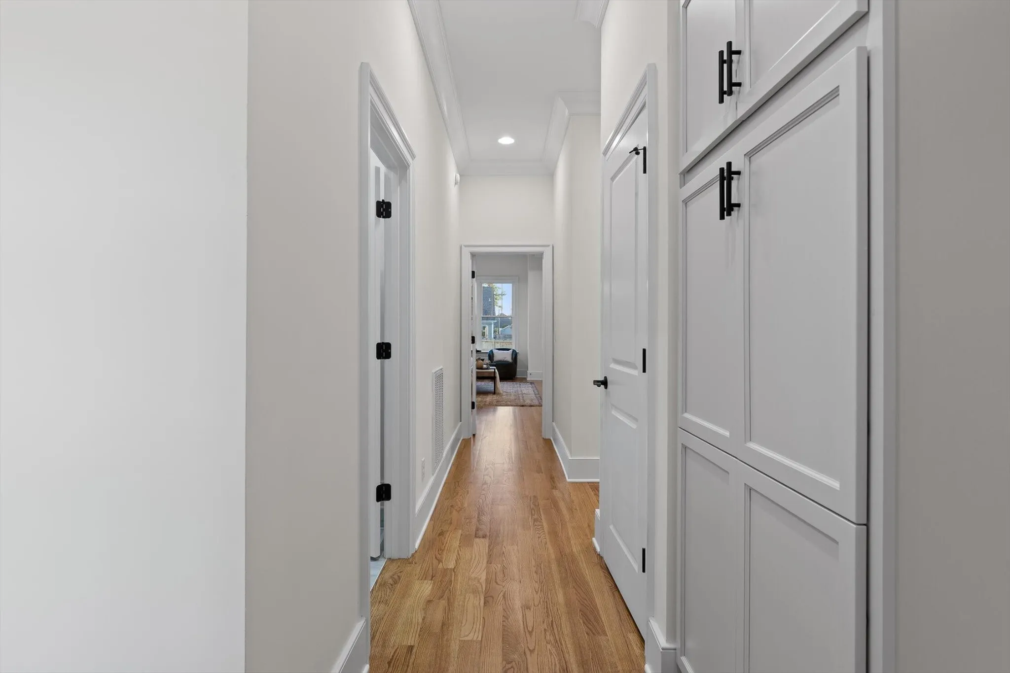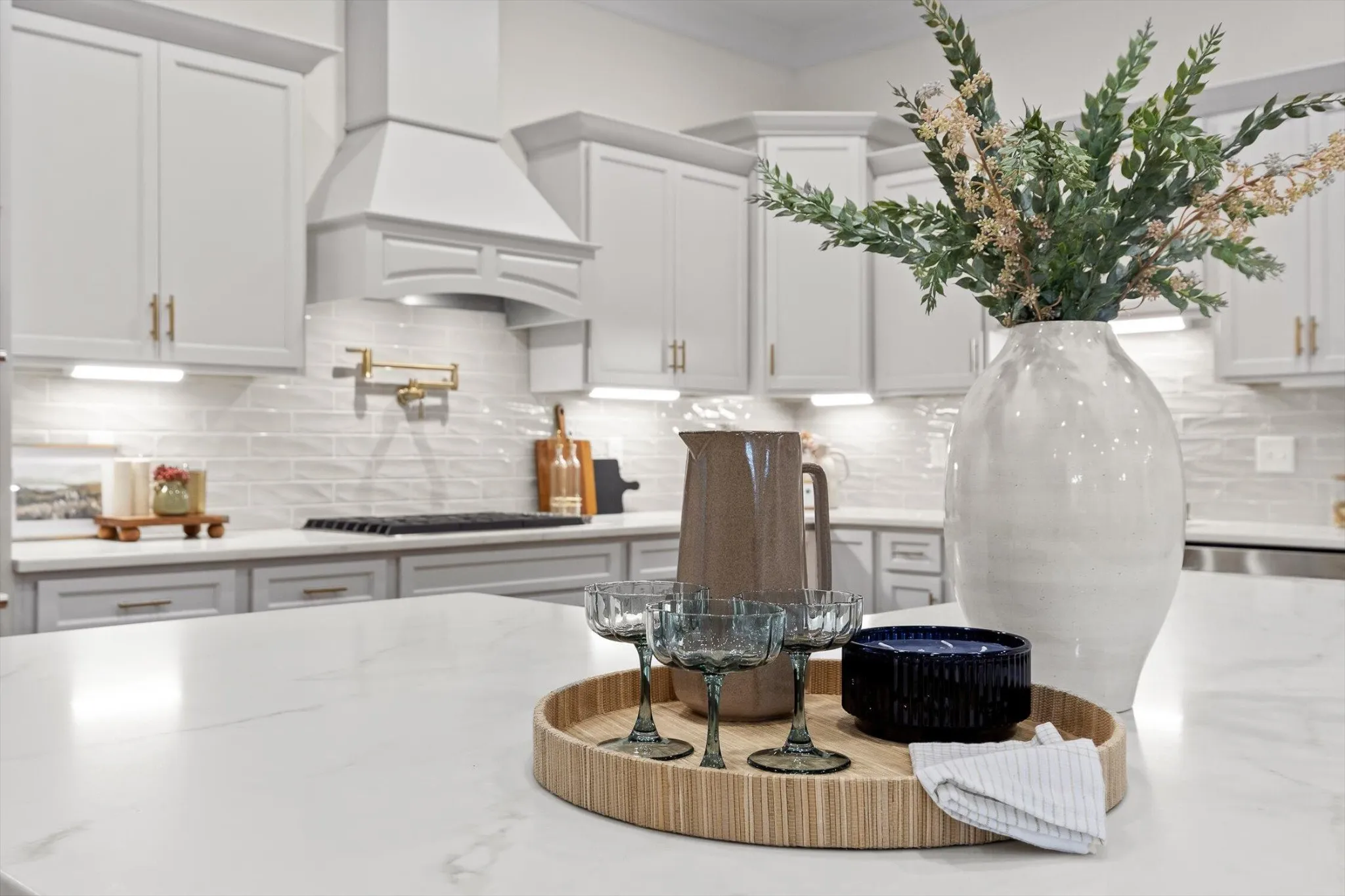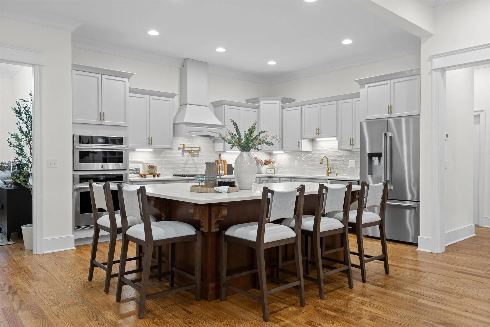 The chef’s kitchen flows seamlessly from the living area, showcasing a cherry wood island with hidden trash and extra storage, quartz countertops, luxury tiled backsplash, pot filler, custom vent hood, premium JennAir appliances, and walk in pantry.