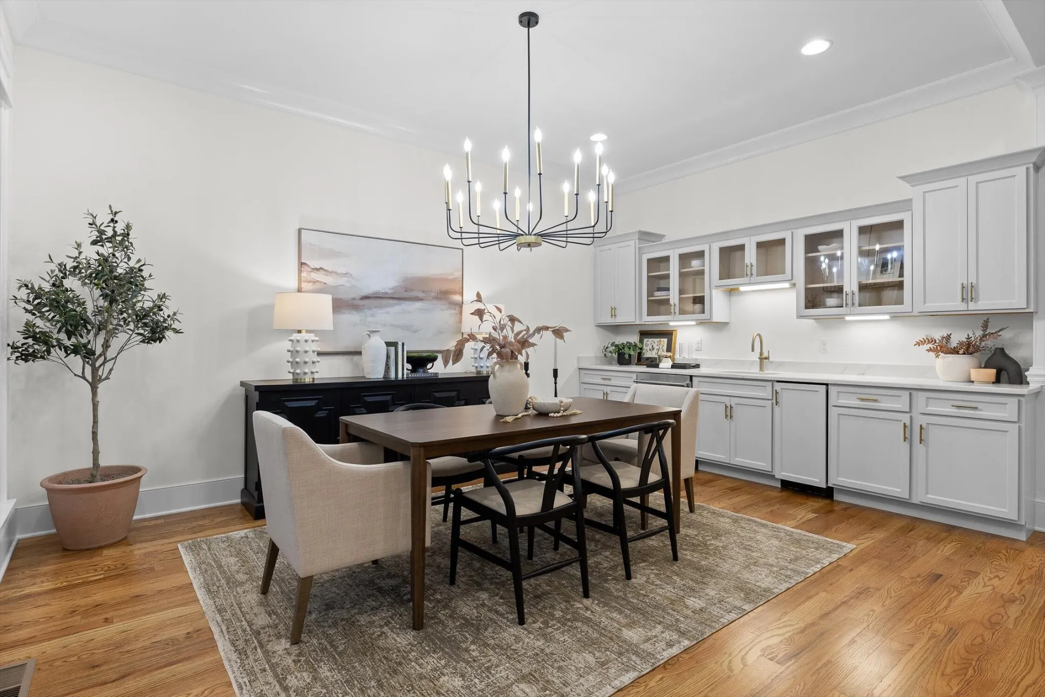 Adjacent, the open dining room is an absolute showpiece, framed by custom trim and molding and featuring a full wall of custom cabinetry with a bar and serving area complete with ice maker, sink, under-cabinet beverage fridge, glass-front display above, and storage below-ideal for stylish, next-level entertaining.