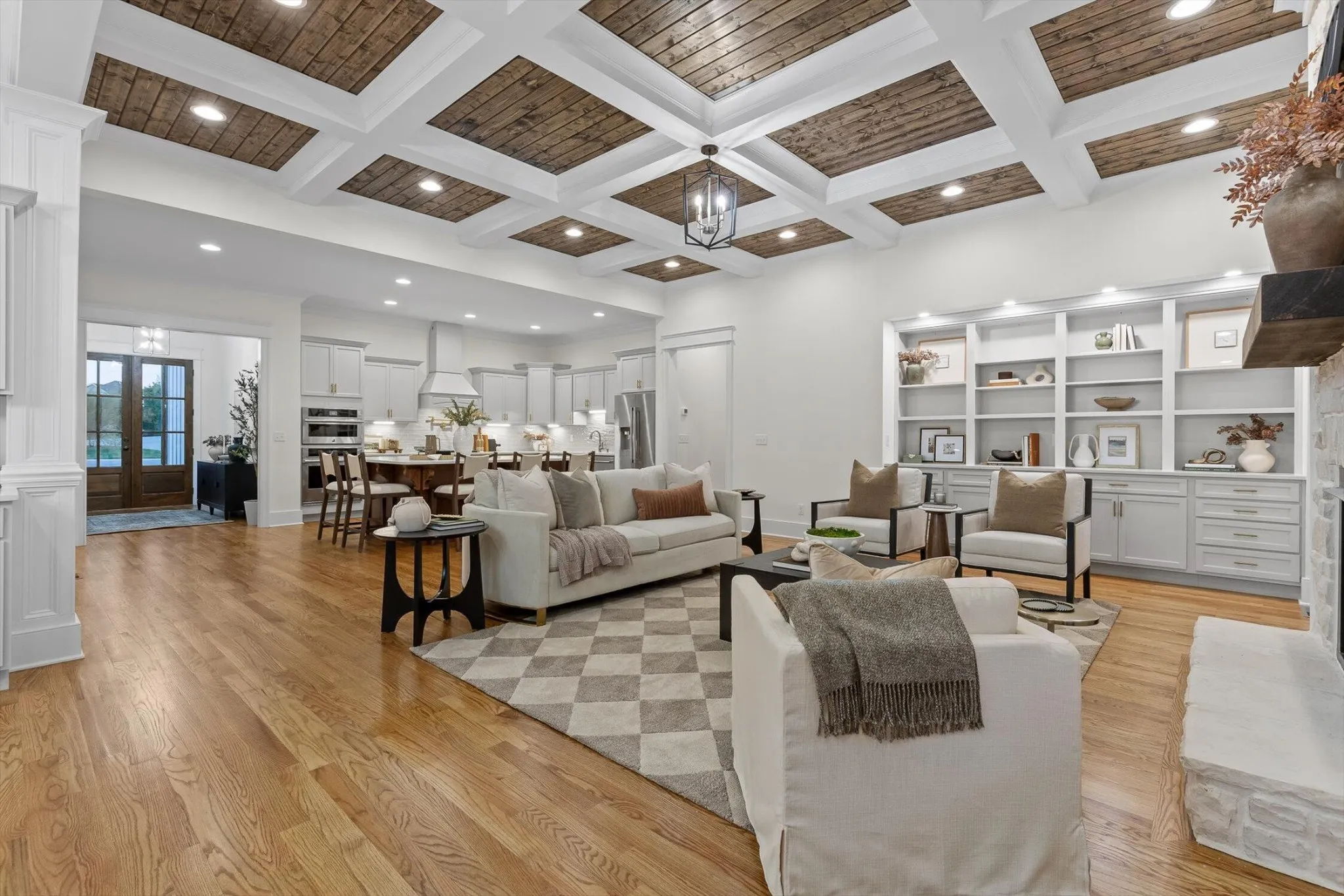 Step through the main entry into 10-foot ceilings and crown molding throughout. The expansive open-concept living room features a finished wood coffered ceiling, stone fireplace, and a wall of custom built-ins with accent lighting and lower storage-perfect for display, media, and organization.
