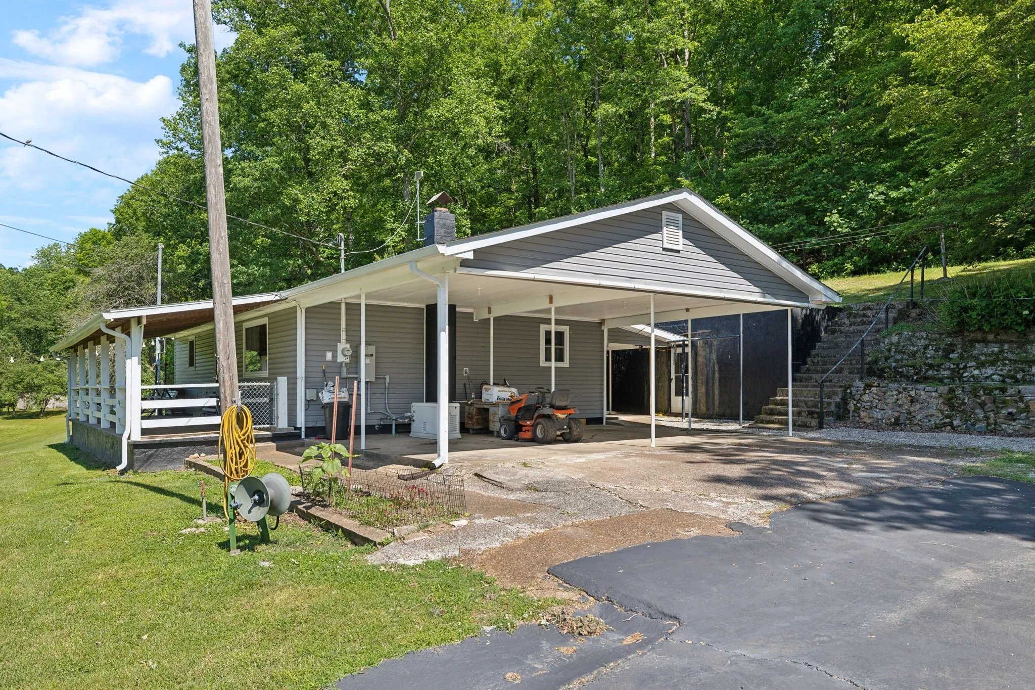 +"PublicRemarks": "23 acres surround this cozy dream-home retreat with low-cost utilities and natural gas powering a whole-house generator and dryer. City water is available, plus a strong private well. Enjoy covered front and back porches, paved driveway, and extra paved parking, along with modern updates including a tankless water heater and refreshed finishes. Property also features a 23x9 storm/storage shelter, additional outbuildings, creek access near the Hwy bridge, and marketable timber for potential income. Versatile for buyers as a first home, retirement opportunity, or a wonderful short-term rental with investment/income potential. Sellers to convey a 2004 Ford work truck (clear title), two safes, and a zero-turn tractor/mower for added convenience."