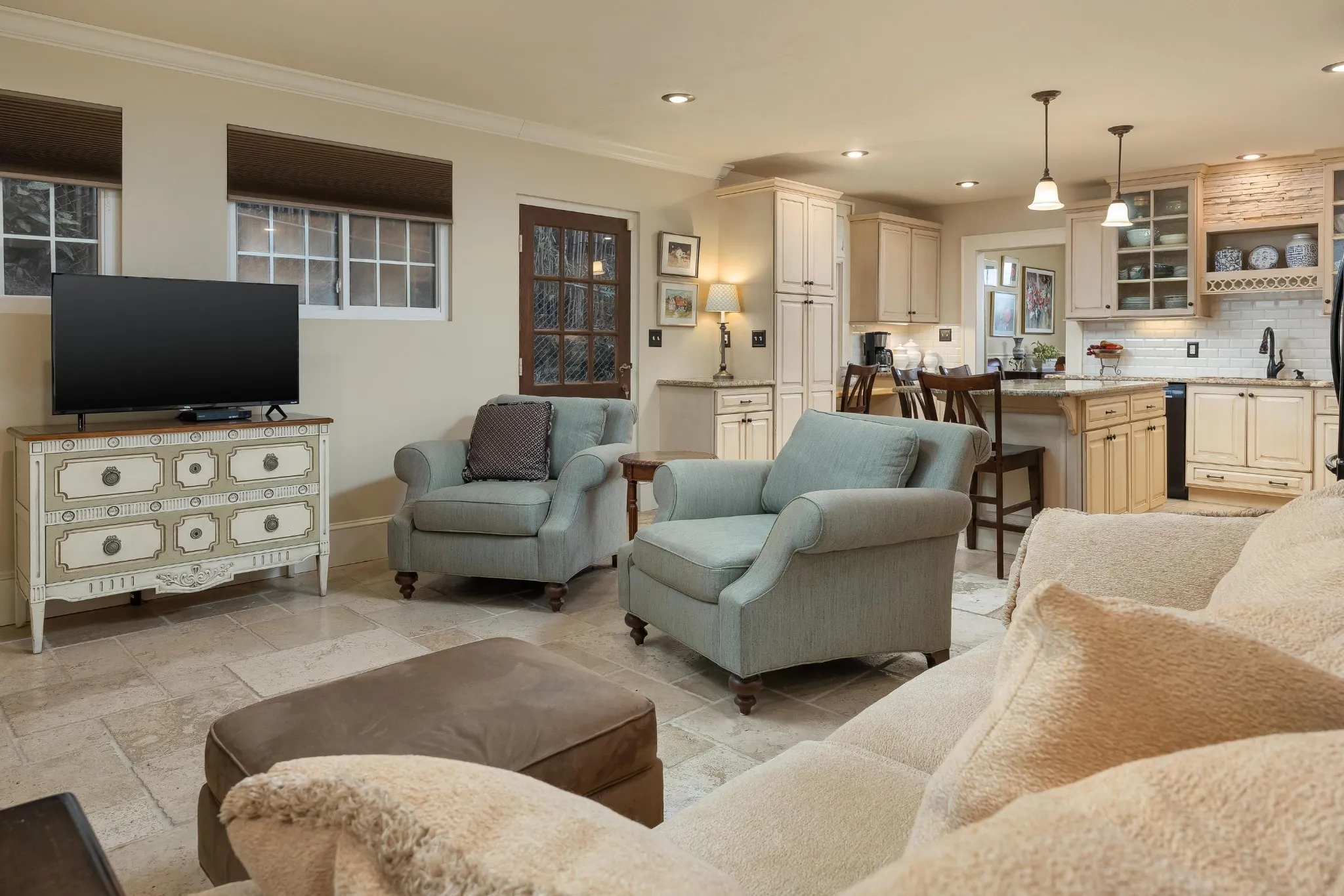 The beautiful gourmet kitchen features custom cabinetry, granite countertops, tile backsplash, and travertine slab flooring, and opens into a warm, inviting den centered around a gas fireplace with a handcrafted hearth and mantle. Off the den is a large bedroom with flexibility to be utilized as a home office, gym, or mother-in-law suite. A gorgeous, tiled sunroom spans the side of the home, providing a spot to relax. The partially finished basement offers additional space, storage, and a dedicated laundry space (laundry hookups are available on every floor).