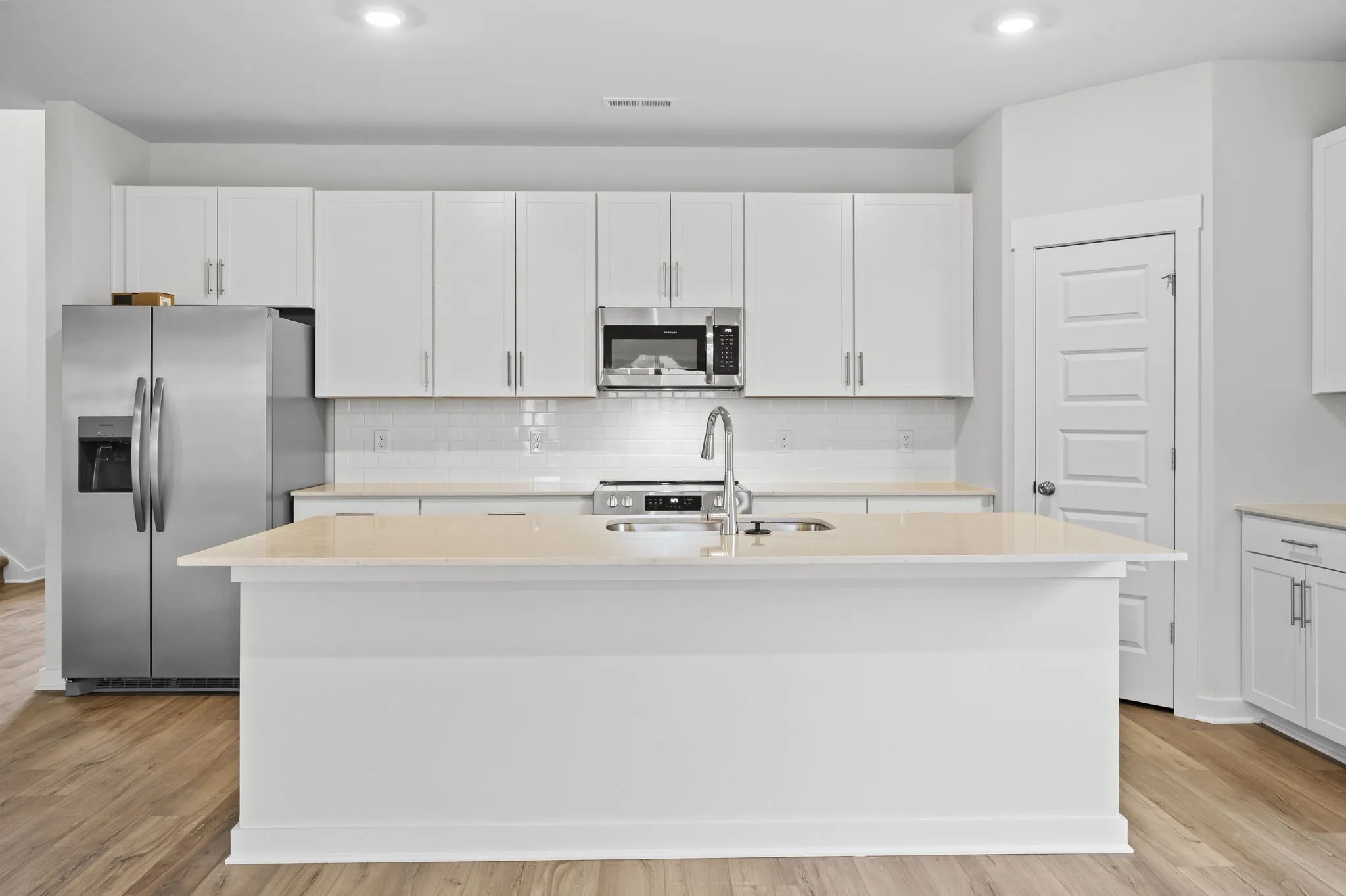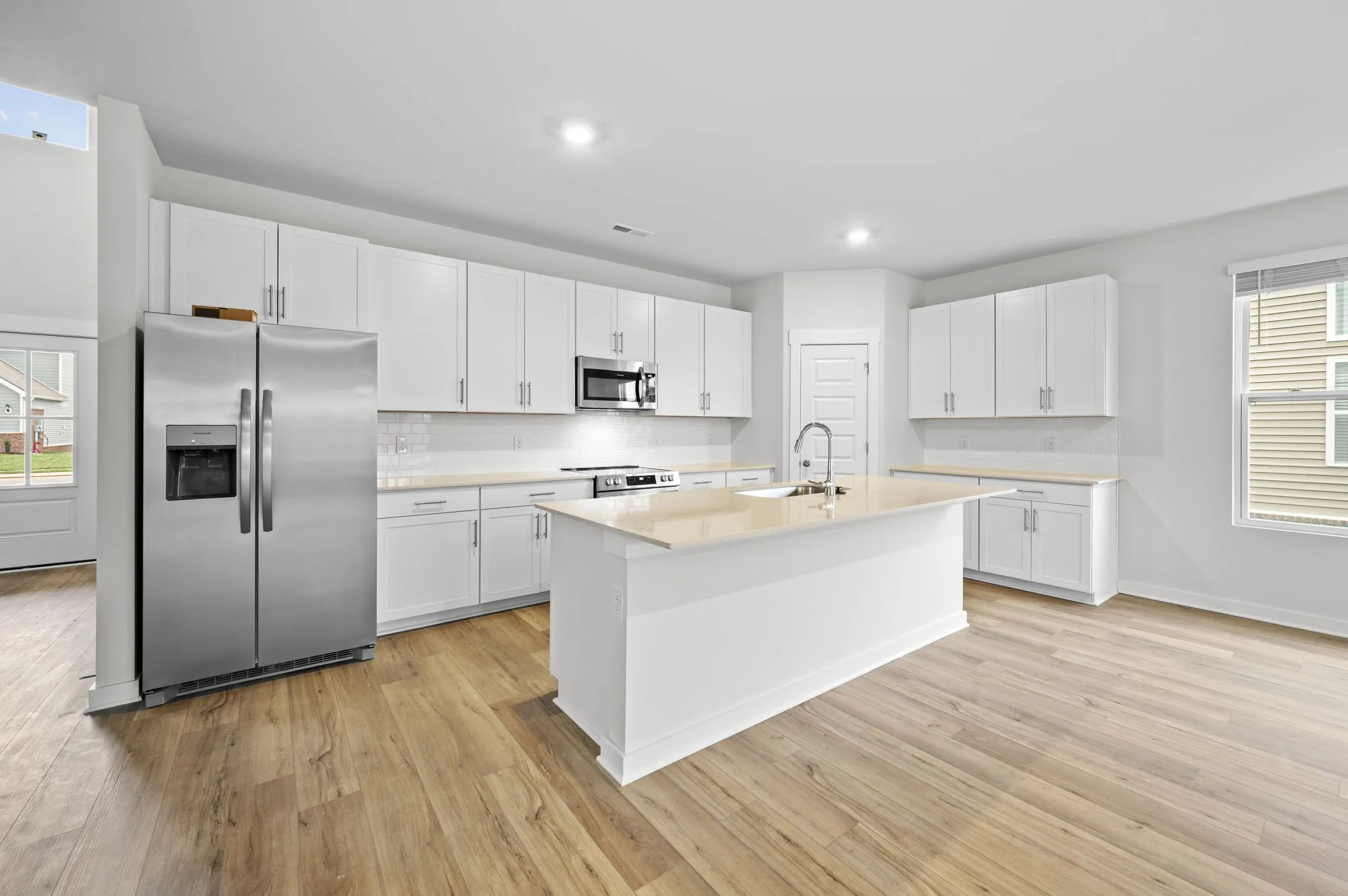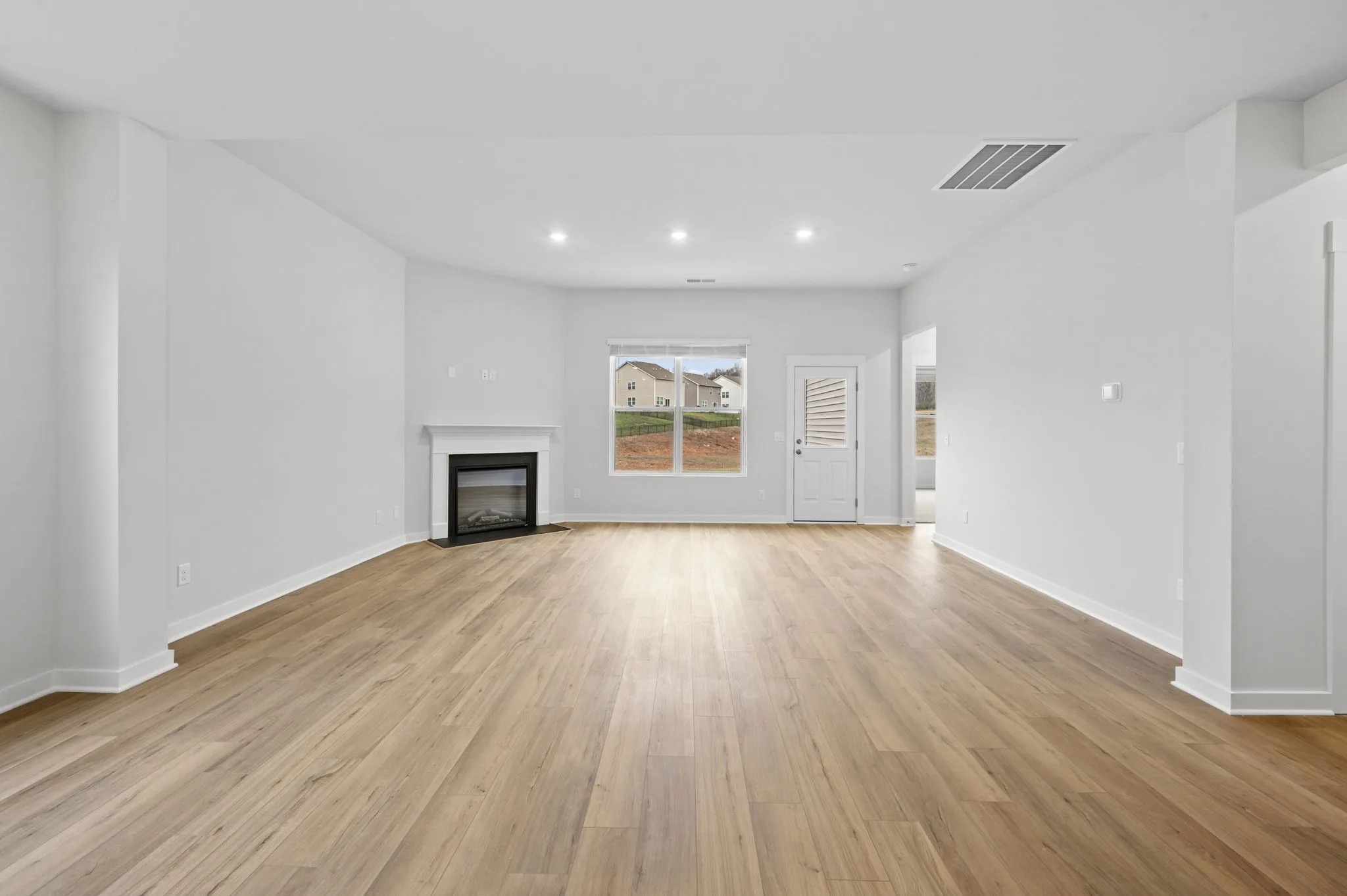 The dream kitchen steals the show, featuring a spacious island, beautiful countertops, crisp white cabinetry, stainless steel appliances, and an oversized pantry. Whether you’re hosting a crowd or enjoying a quiet dinner at home, this kitchen offers the perfect blend of style and function. It opens directly into the living area, where a remote-controlled electric fireplace creates the ultimate cozy atmosphere.