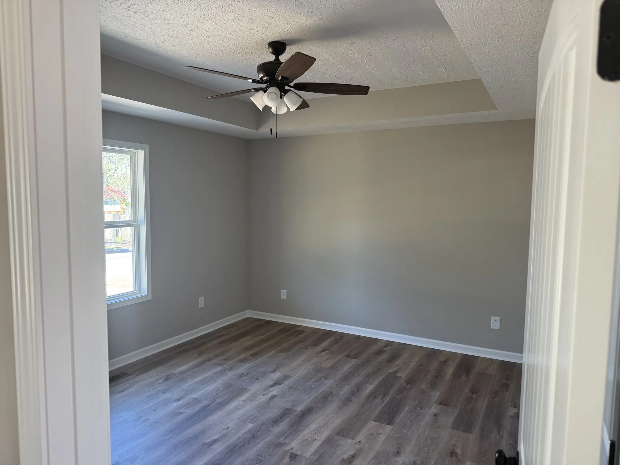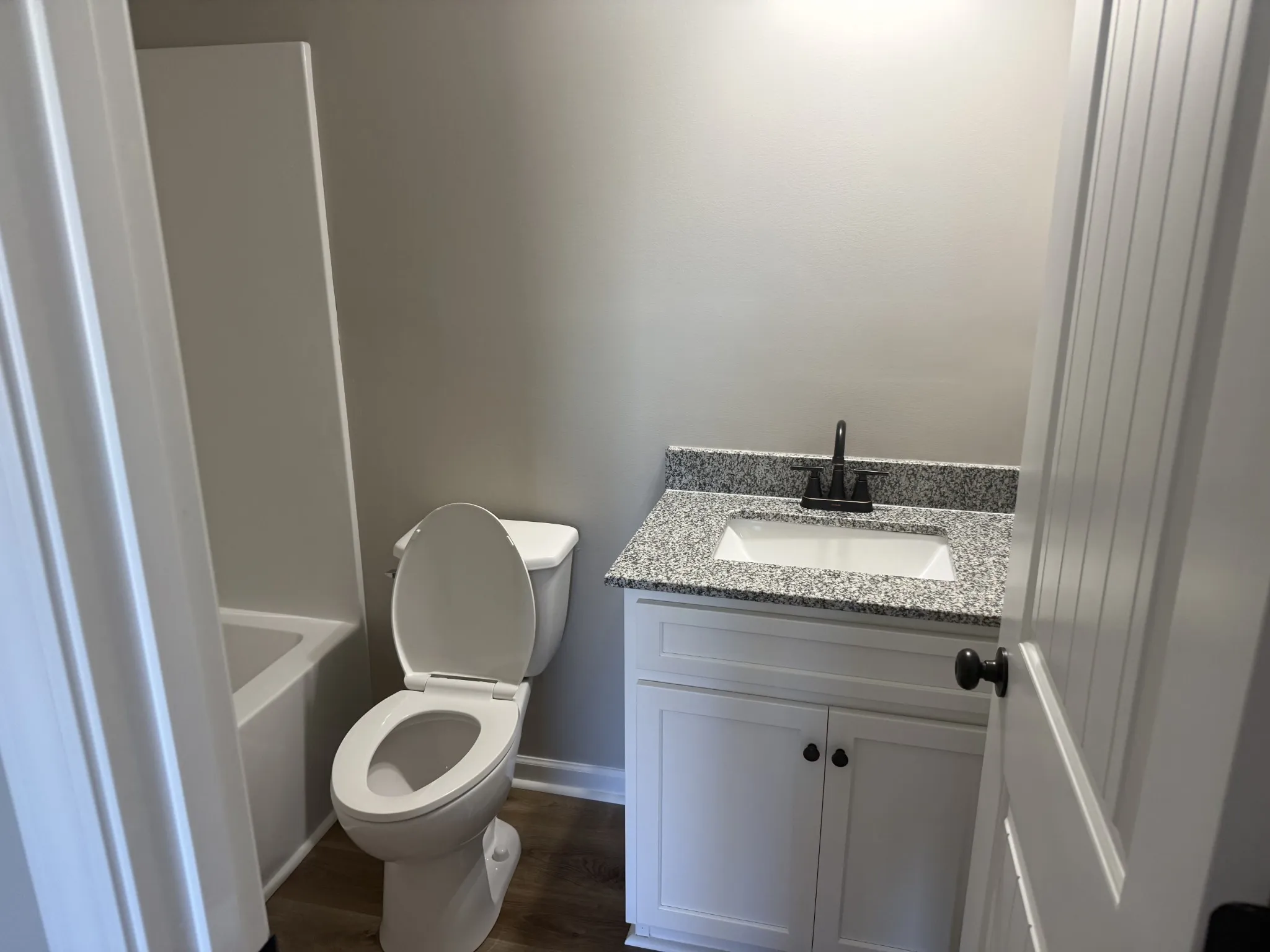 New construction featuring open floor plan with vaulted and trey ceilings, vinyl plank flooring throughout, stove, dishwasher, microwave, covered porch and rear deck.
