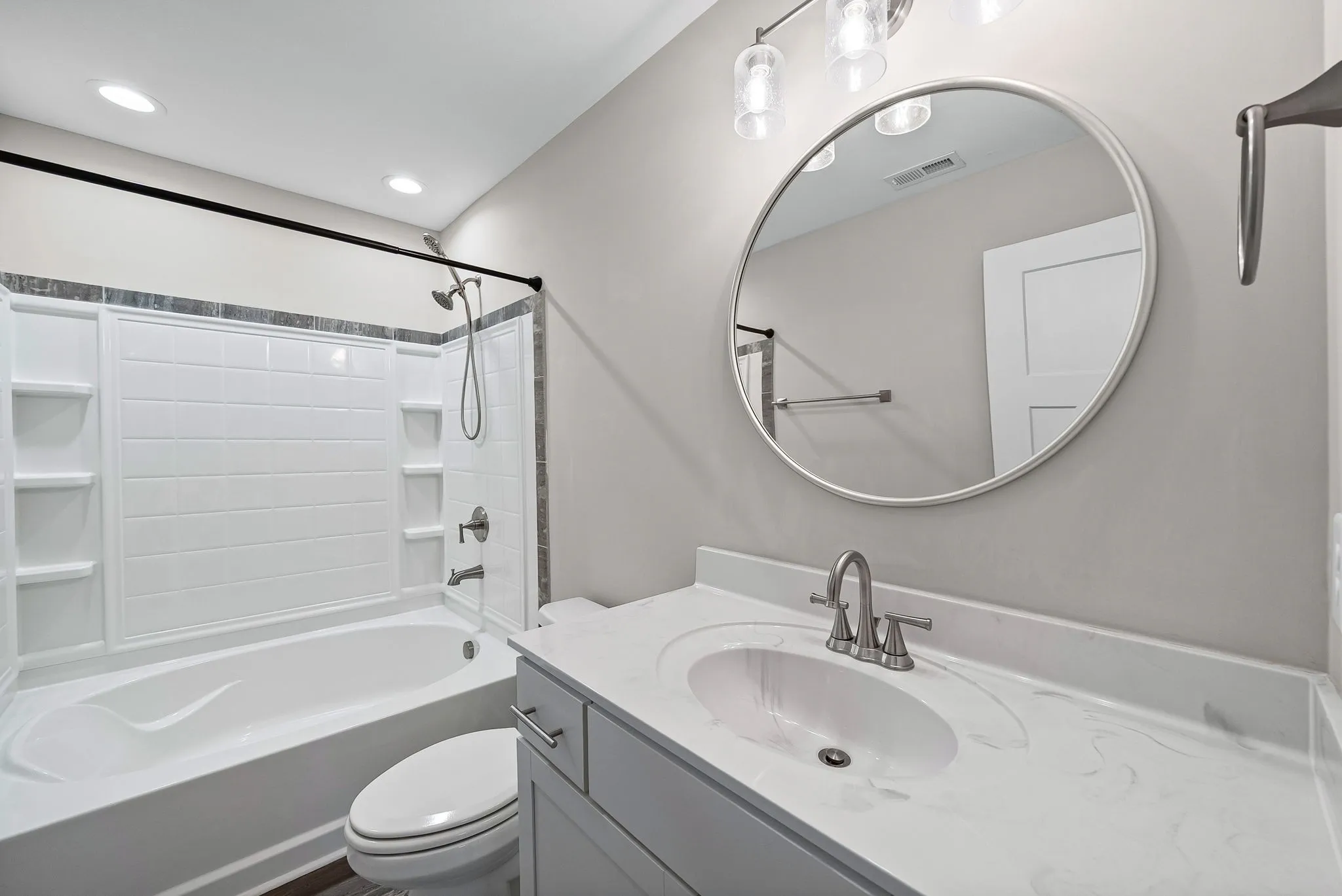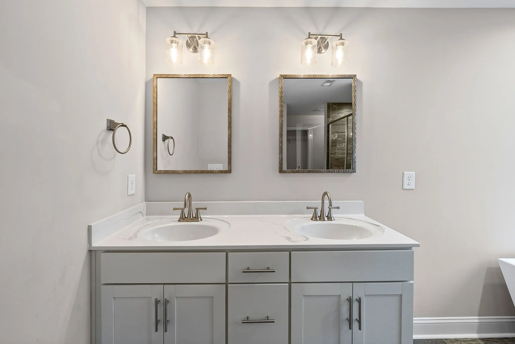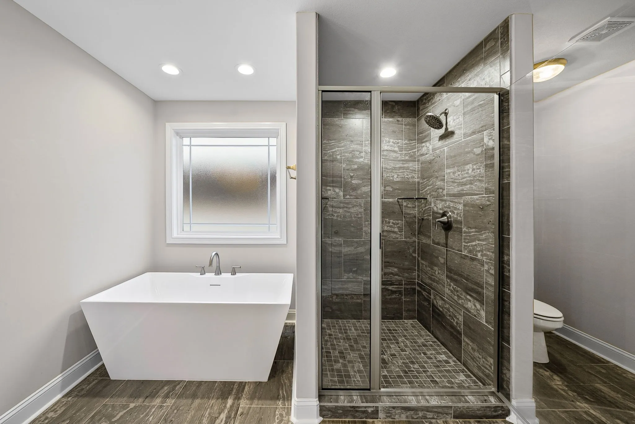 Enjoy cozy nights by the gas fireplace (tenants responsible for setting up propane). The oversized primary suite boasts elegant tray ceilings and a luxurious ensuite bathroom with dual vanities, a large walk-in tile shower, and a relaxing soaking tub.