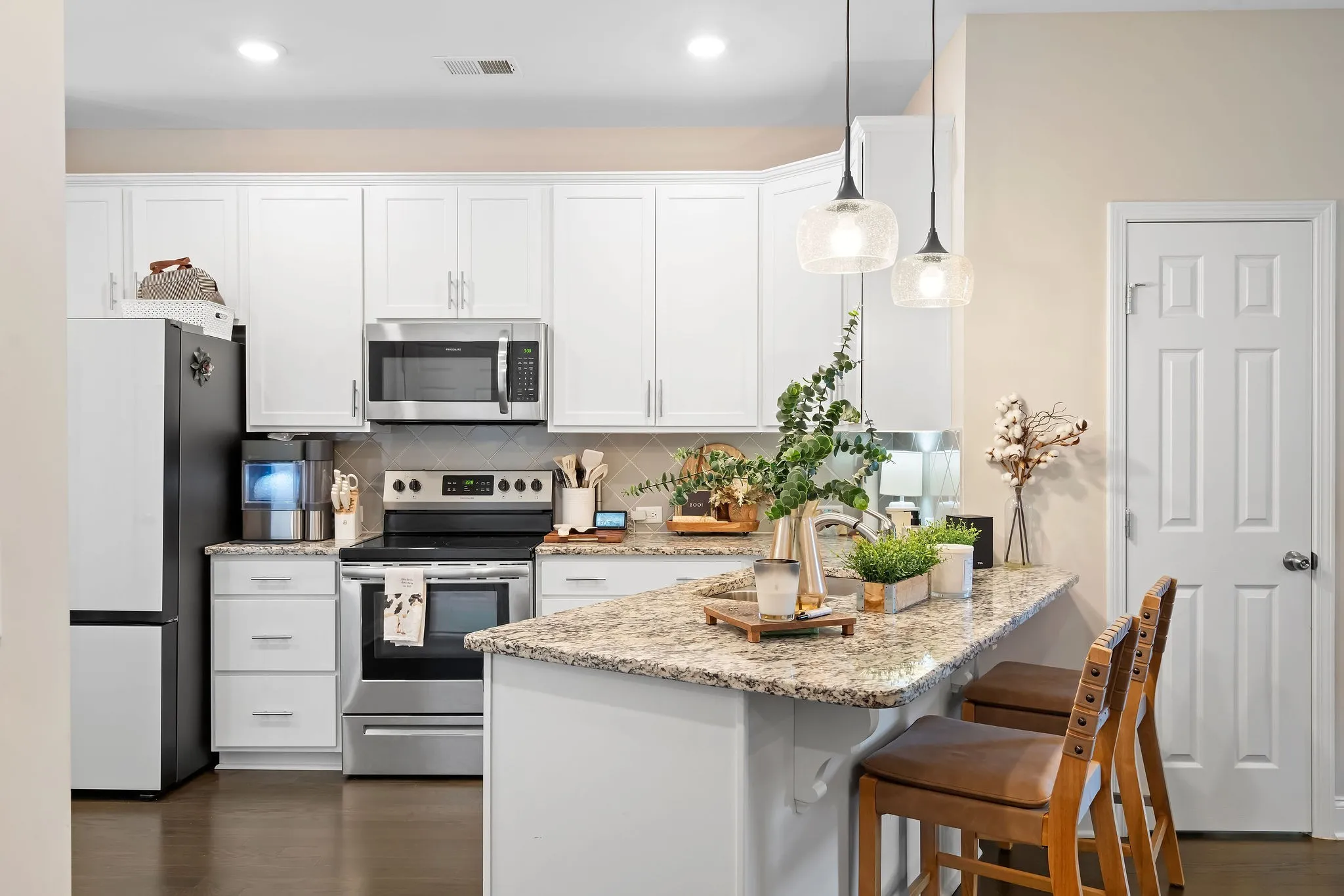 Discover modern comfort and effortless living in this beautifully maintained 4-bedroom, 2.5-bath END-UNIT townhome. Tall ceilings, abundant natural light, and an open-concept layout create a bright, inviting space from the moment you step inside. The spacious living area flows into a modern kitchen featuring sleek countertops, a large island, ample cabinetry, and a dedicated pantry—perfect for everyday cooking or entertaining guests. A full laundry room adds extra convenience on the main level.