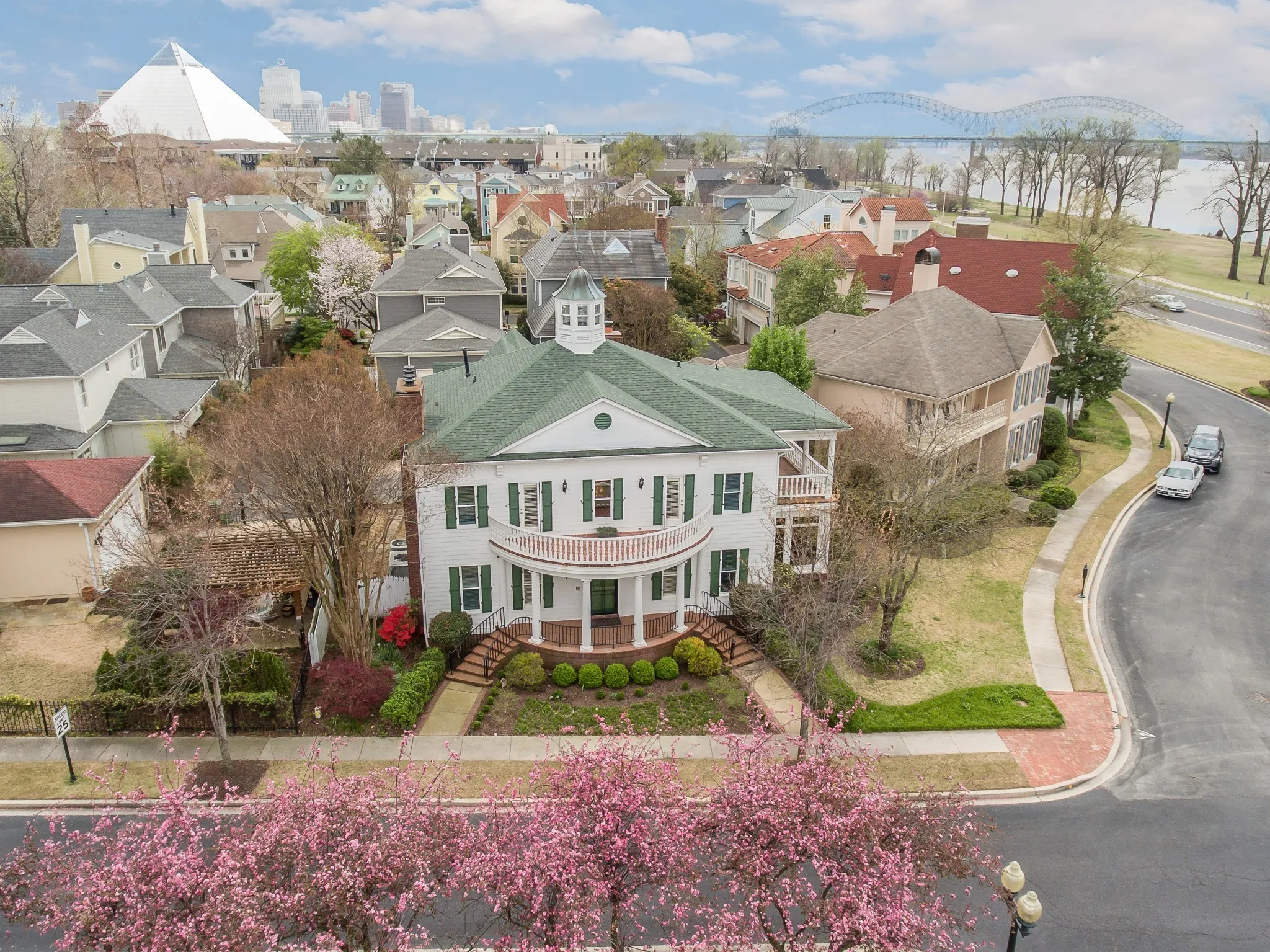 This stunning riverfront residence exudes Southern charm! Inside, you’ll find gorgeous hardwood floors gracing spacious, sunlit rooms. The kitchen has been tastefully updated with stainless steel appliances, elegant granite countertops, and a cozy breakfast nook, complemented by a generously sized dining room. Step outside onto the inviting patio, green grass, perfect for relaxation. With two expansive master suites, this home offers flexibility and luxury. Enjoy picturesque views of the Mississippi River from the charming sunroom downstairs or from the expansive balconies upstairs. Don’t miss this opportunity to own one of Harbor Town’s most distinguished homes!