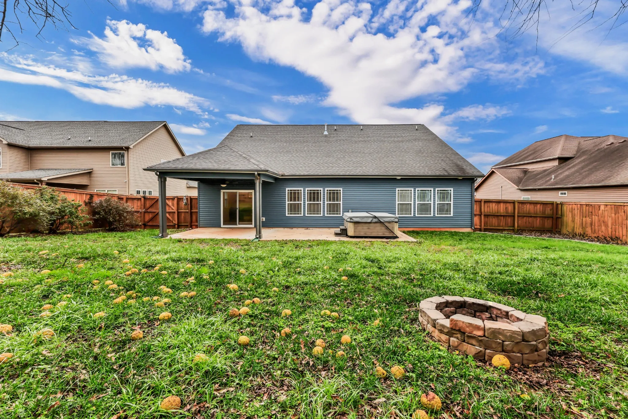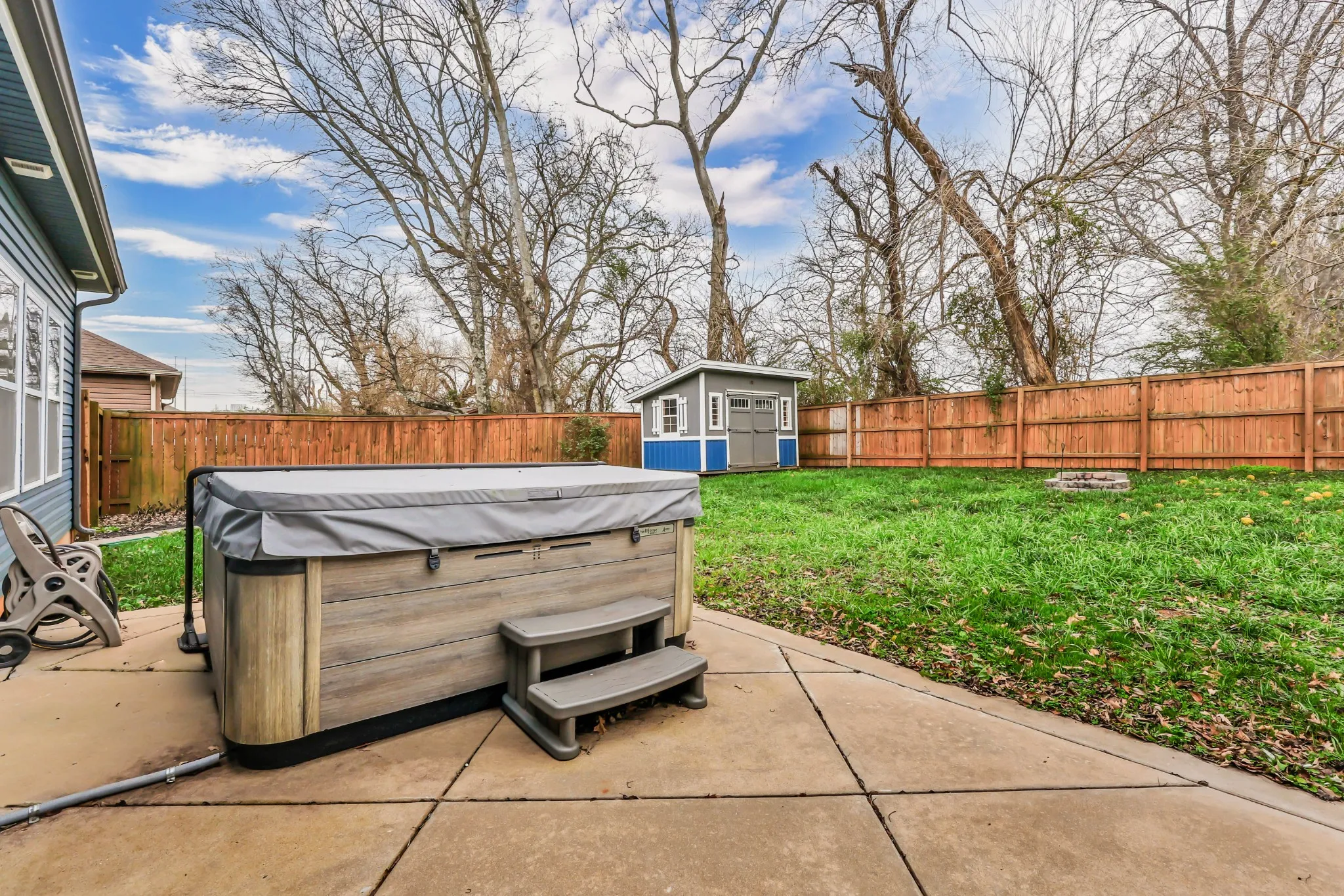 Outdoor living is a standout feature. The large partially covered patio is home to a premium 5-person Bullfrog hot tub with interchangeable jets—an exceptional upgrade that conveys at no additional cost to the buyer. Enjoy year-round relaxation in your own private oasis, complete with a wood privacy fence and a storage shed.
