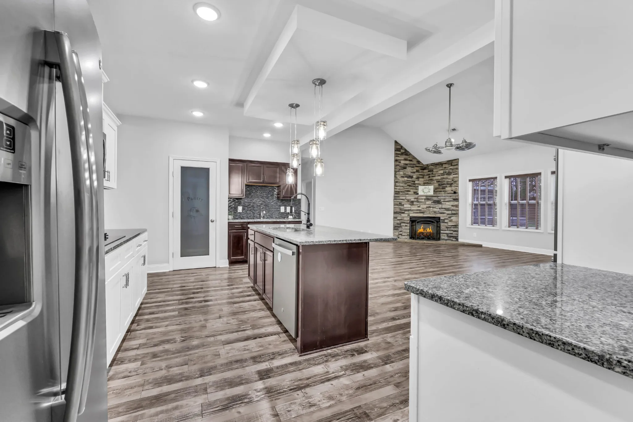 This stunning 4 bedroom, 3.5 bath ranch-style home offers elevated style and exceptional livability in a highly sought-after, well-established neighborhood. An inviting open-concept floor plan showcases hardwood flooring throughout, leading to a spacious living room anchored by a stone gas fireplace. The gourmet kitchen features two-tone cabinetry, a tile backsplash, granite countertops, stainless steel appliances, a side bar area, and a separate pantry. A dining room with custom built-ins provides the perfect space for gatherings.