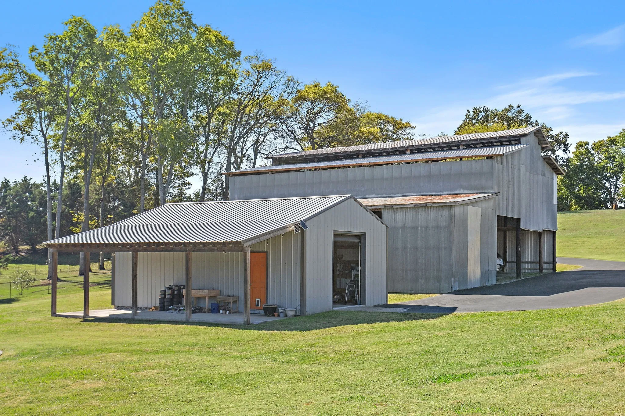 "LongDescription" => "Cement floor in Metal Barn with new rolling garage door. Built-in shelves on left side convey."