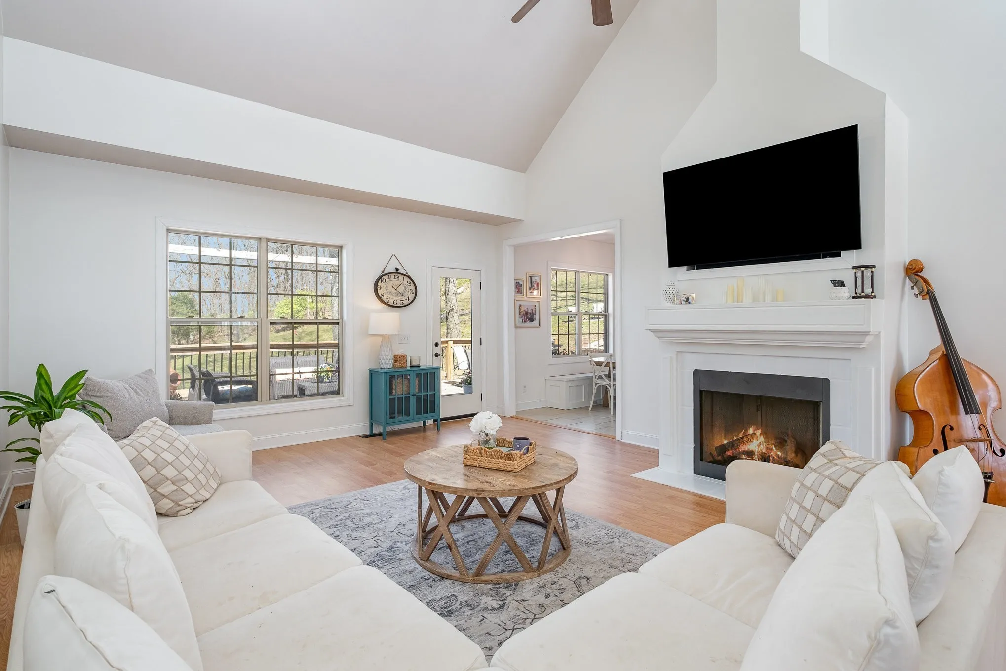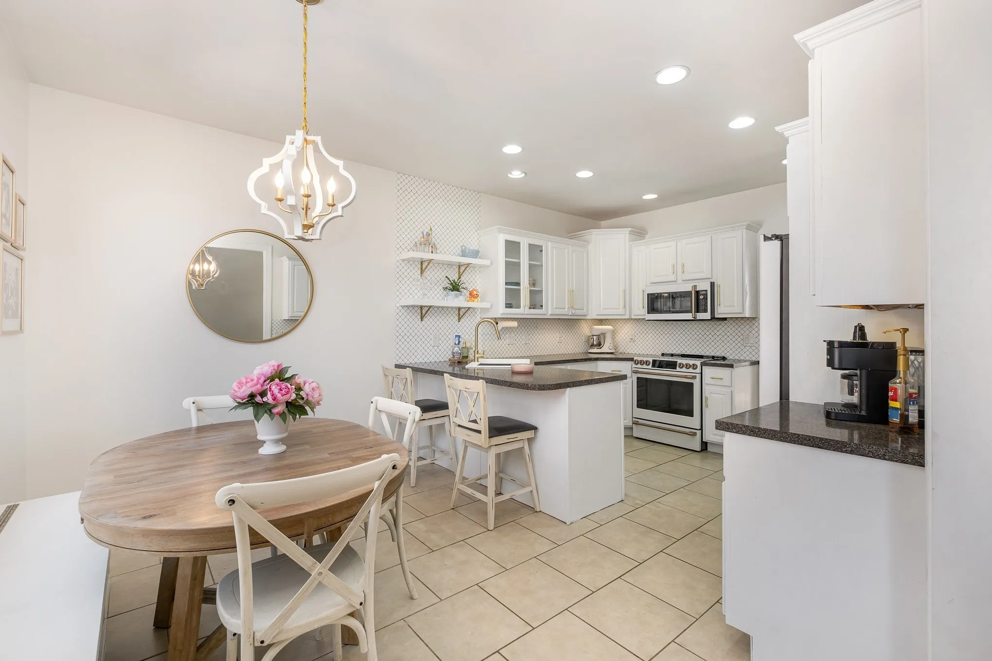 The main level features 3 bedrooms, 2 full baths, a vaulted living room with fireplace, formal dining, laundry, and an updated kitchen with 2024 appliances (white with gold finishes) and a custom built-in banquette.