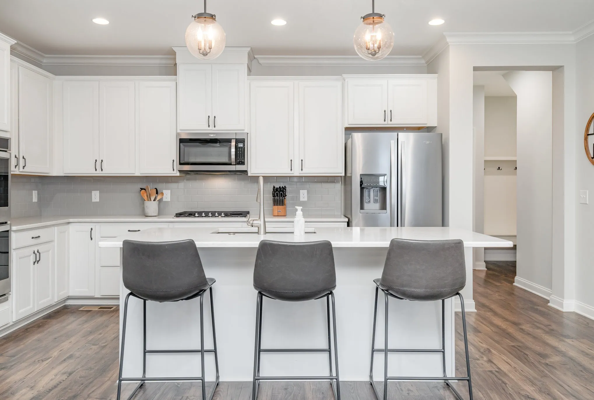 Step inside to a welcoming foyer with wainscoting, wood floors, and recessed lighting that basically says, “Yes, I’m classy.” The open layout features a spacious living room and a bright kitchen with stainless steel appliances, a tile backsplash, and so much cabinet space you might actually lose things. The center island with breakfast bar seating is ideal for morning coffee, homework sessions, or pretending you’re on a cooking show.