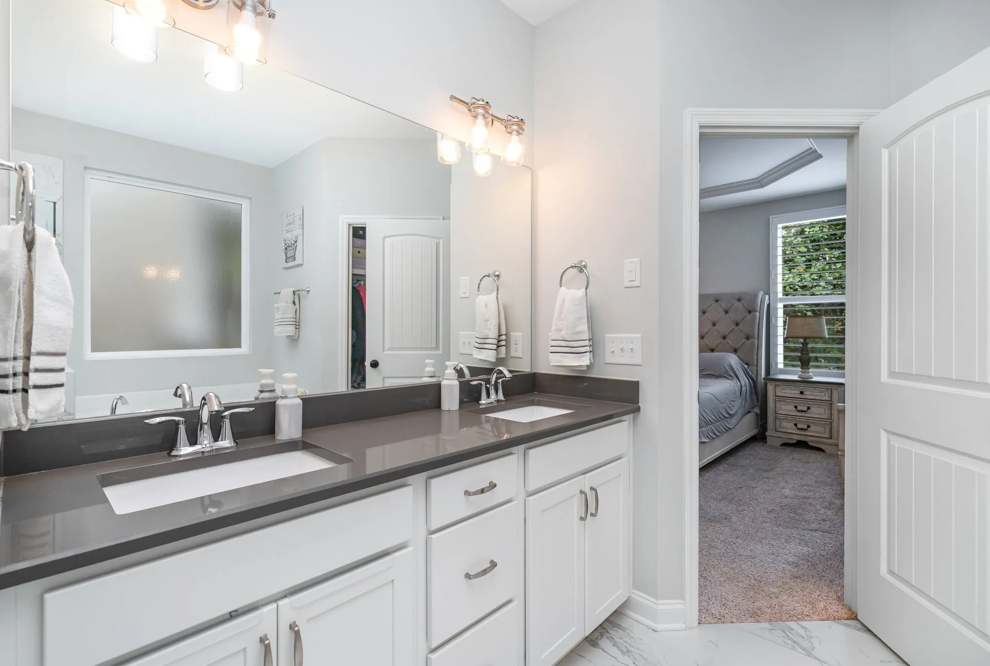 The main-floor primary suite features a tray ceiling, a large walk-in closet that happily swallows your entire wardrobe, and a beautiful bath with double vanities, a soaking tub, and a separate shower—because sharing is overrated.