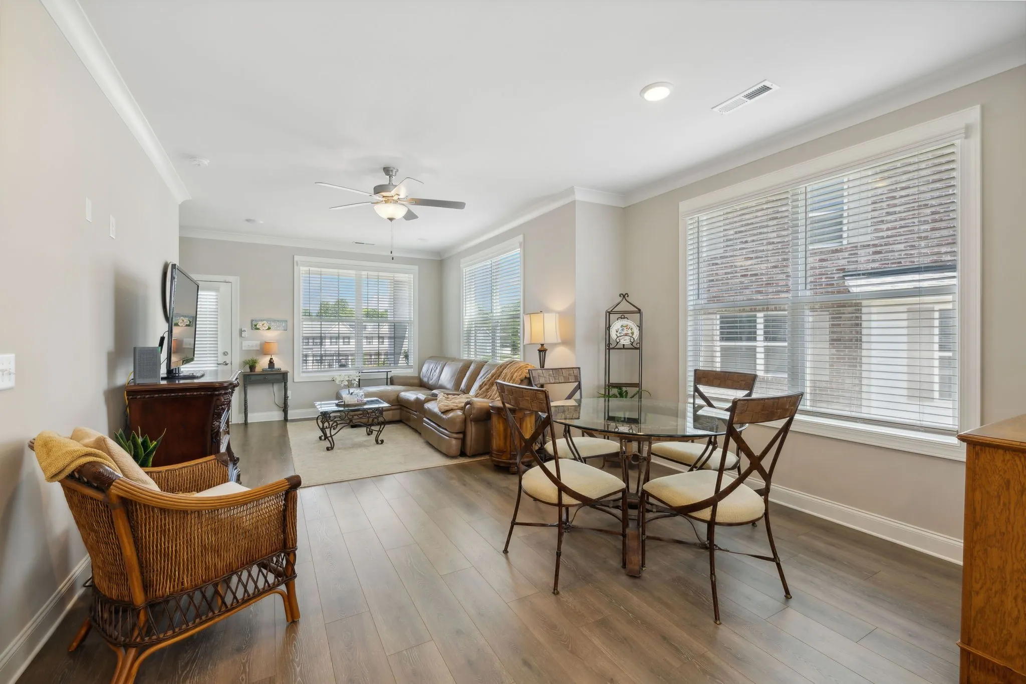 The modern kitchen includes quartz countertops, a tile backsplash, pendant lighting, and a walk-in pantry—perfect for buyers seeking an upgraded Brentwood townhome. The kitchen refrigerator, washer and dryer can remain. Hardwood floors extend through the first two levels, and abundant natural light enhances the spacious feel of this end-unit design.