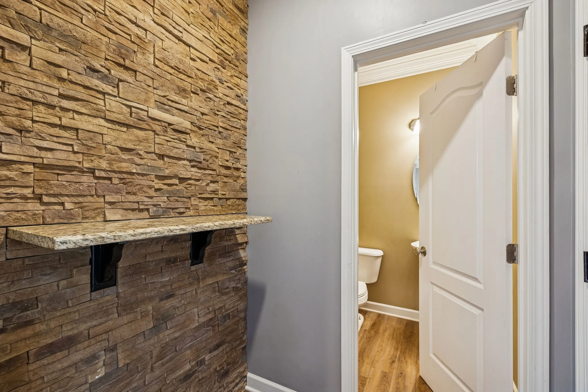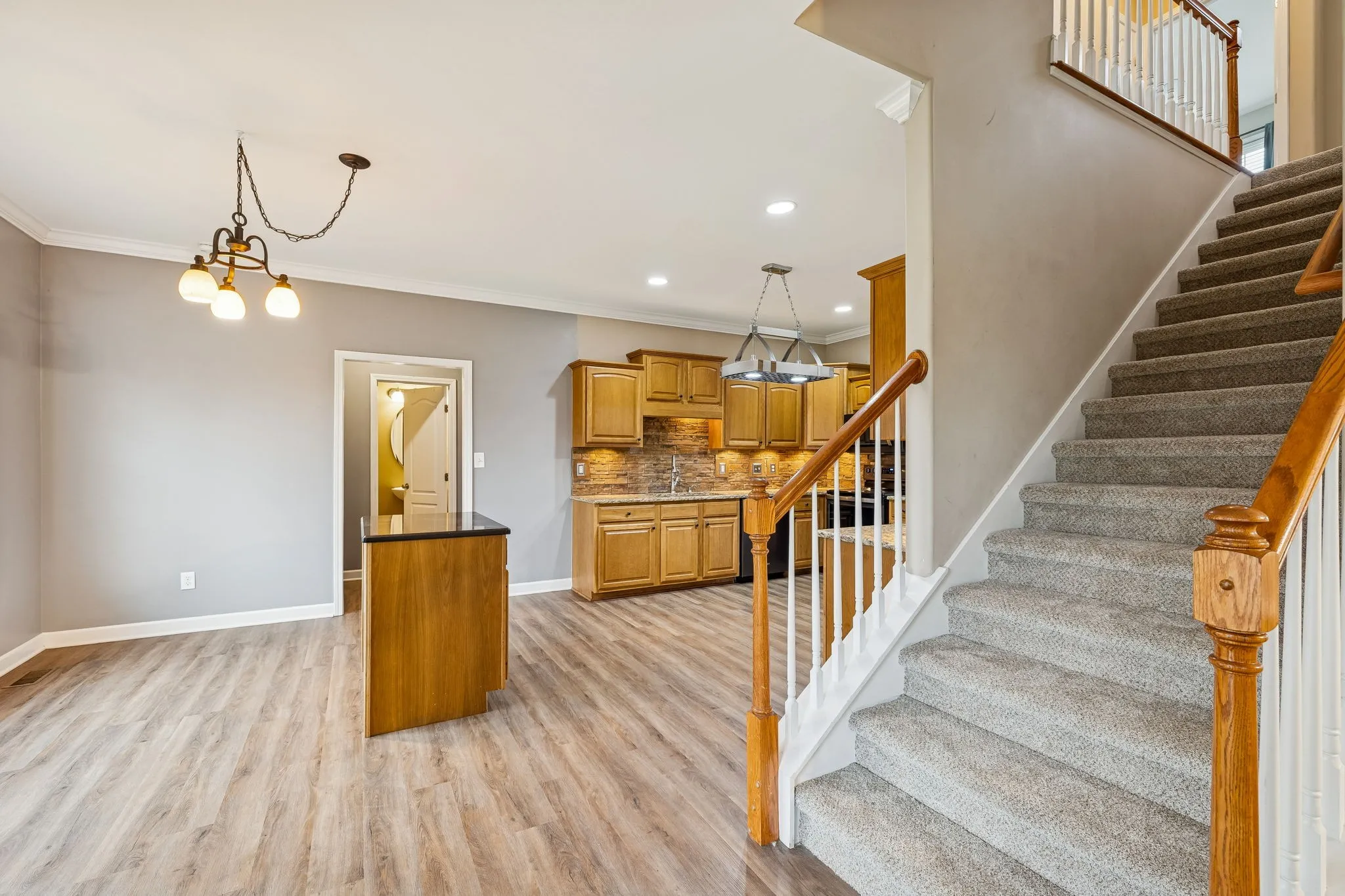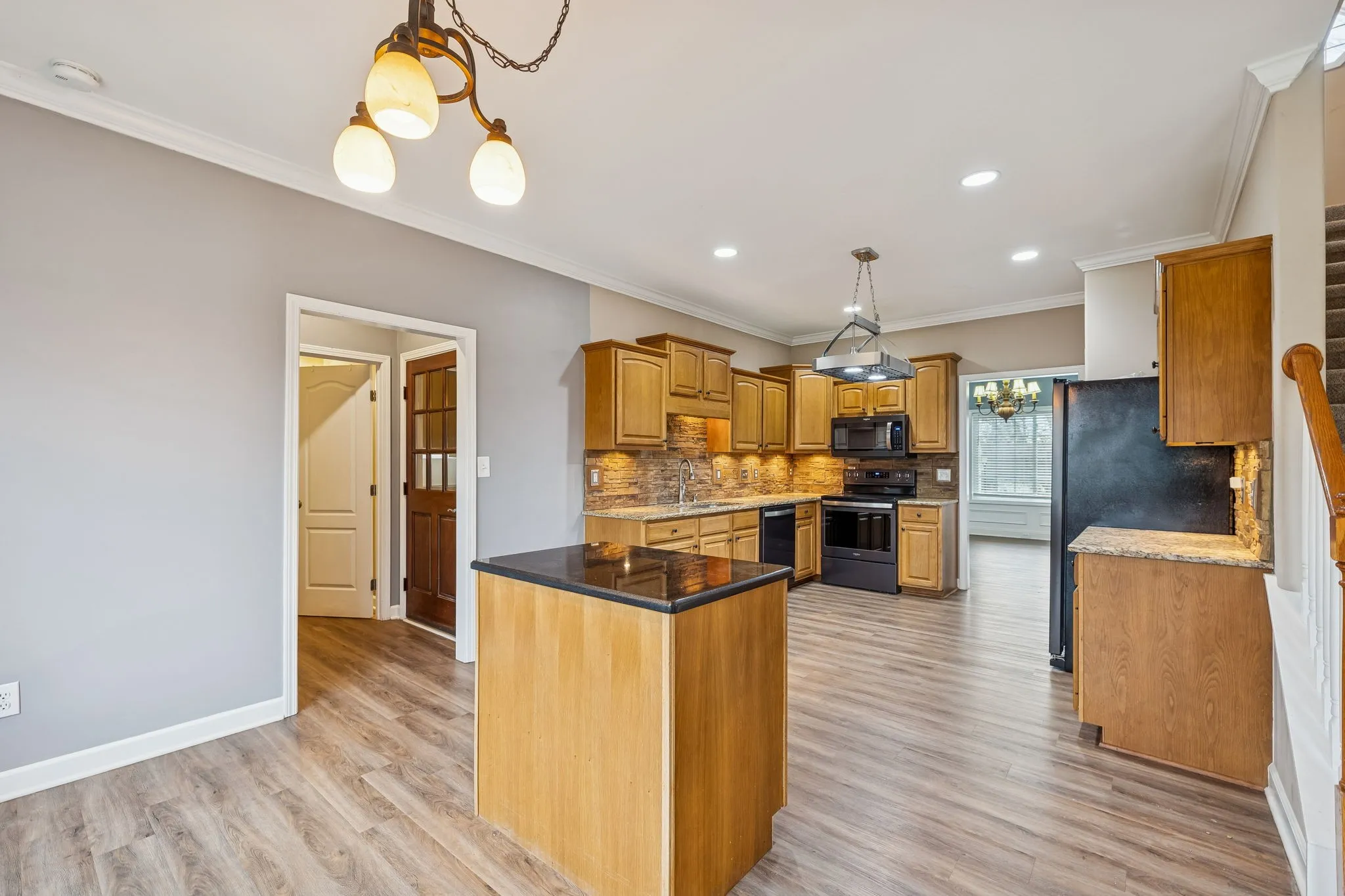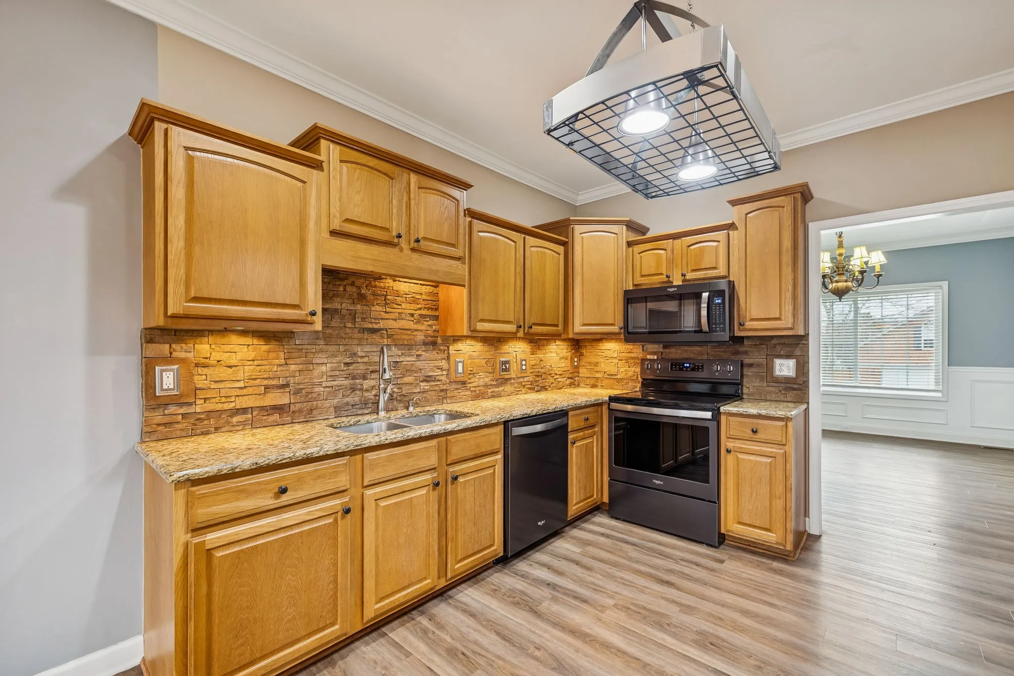There’s a certain magic to this home—an easy comfort that greets you the moment you step inside. Sunlight filters through the large windows, warming the living room and its inviting wood-burning fireplace, setting the stage for cozy nights in and everyday moments that feel a little extra special. Just beyond, the eat-in kitchen steals the spotlight with granite countertops, a stone backsplash, and a layout that makes cooking, gathering, and lingering over meals feel effortless.