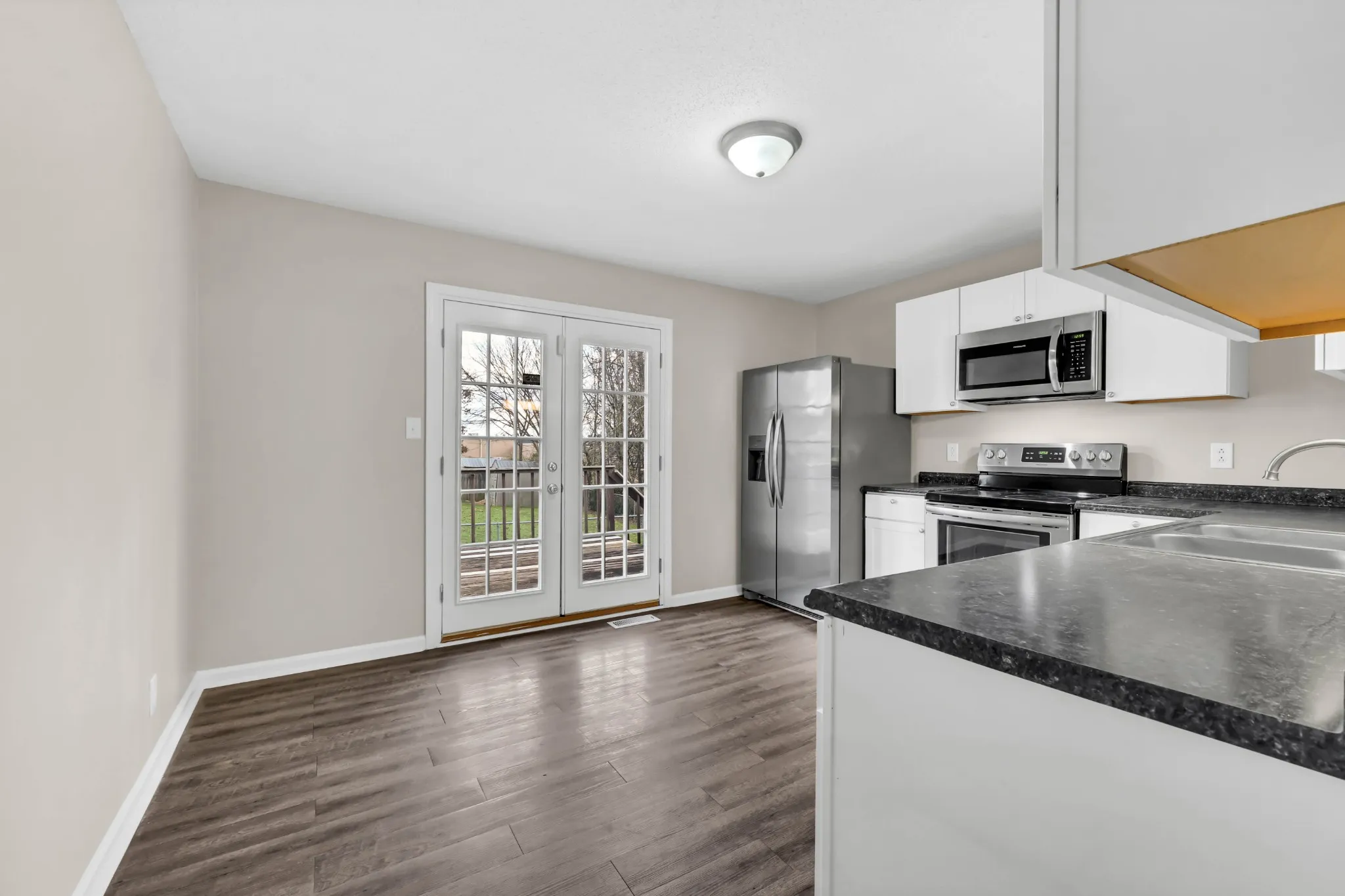 This charming home awaits you, featuring numerous upgrades such as brand-new stainless steel appliances in the eat in kitchen with access to your private backyard. Other upgrades include fresh paint, ceiling fans throughout, plush carpeting, and luxury vinyl plank flooring throughout. It boasts three bedrooms and two full baths, with the primary suite offering double vanities separate from the shower-tub combination. The backyard is fenced and adjoins a tree line for added privacy, complete with a back deck and a shed for extra storage. Conveniently located in the heart of Clarksville, schedule your private showing today!