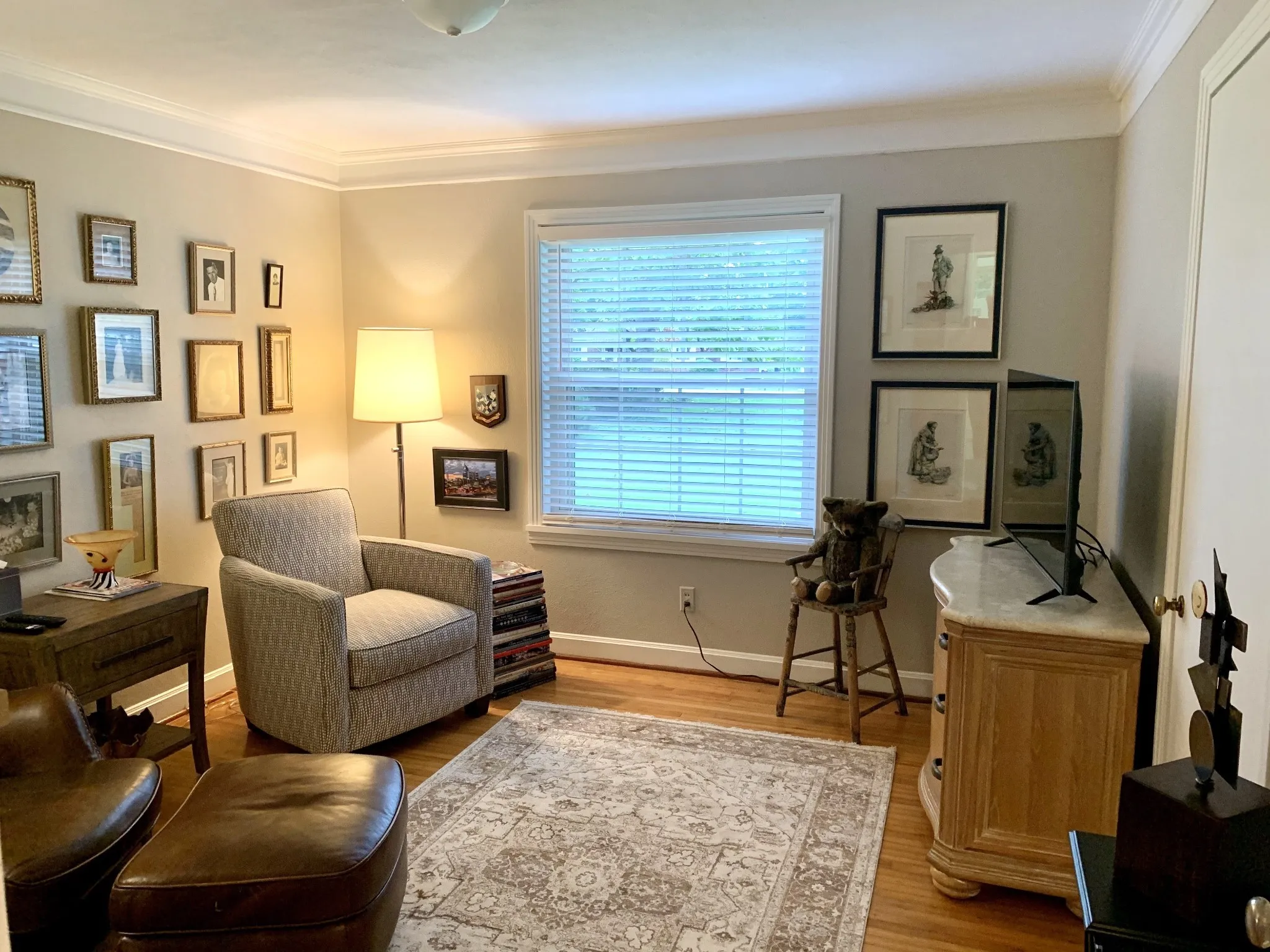 Sitting on a beautifully landscaped half acre lot this home has been extremely well maintained and updated while maintaining original features like oak hardwood flooring, ceramic tile, hardwood cabinets, hardware, plaster walls and crown moulding. Interior improvements include new HVAC, hot water heater, kitchen sink, stove, dishwasher, all interior lighting, LVP flooring in kitchen and den, brand new carpet in two bedrooms, window blinds and paint throughout. The bathroom has a new vanity with hardware, toilet and reglazed bathtub.