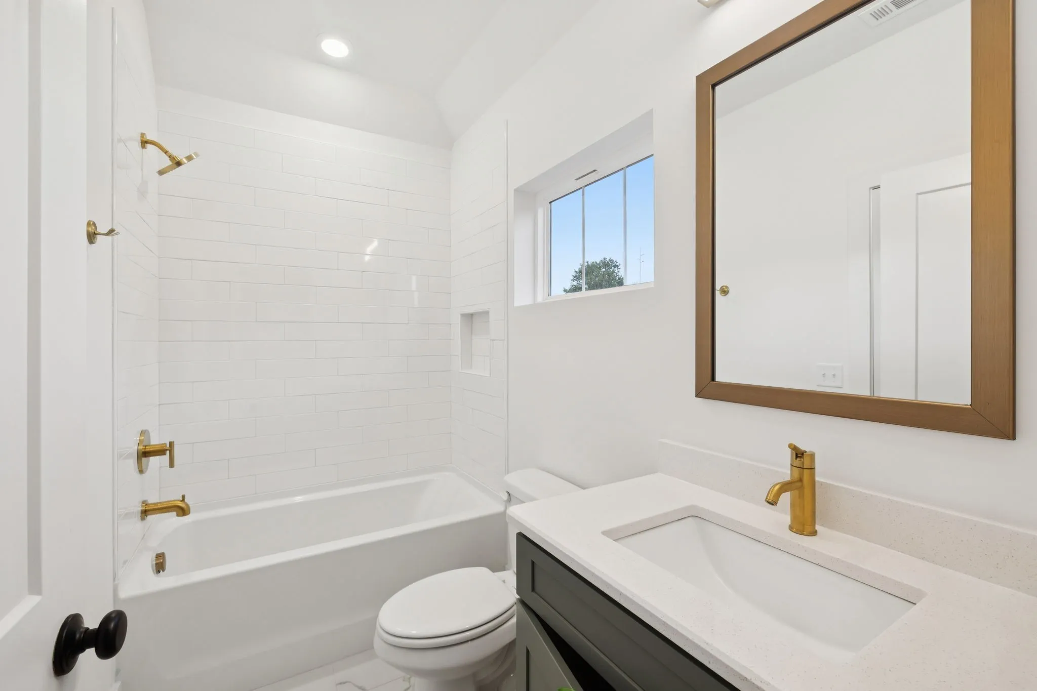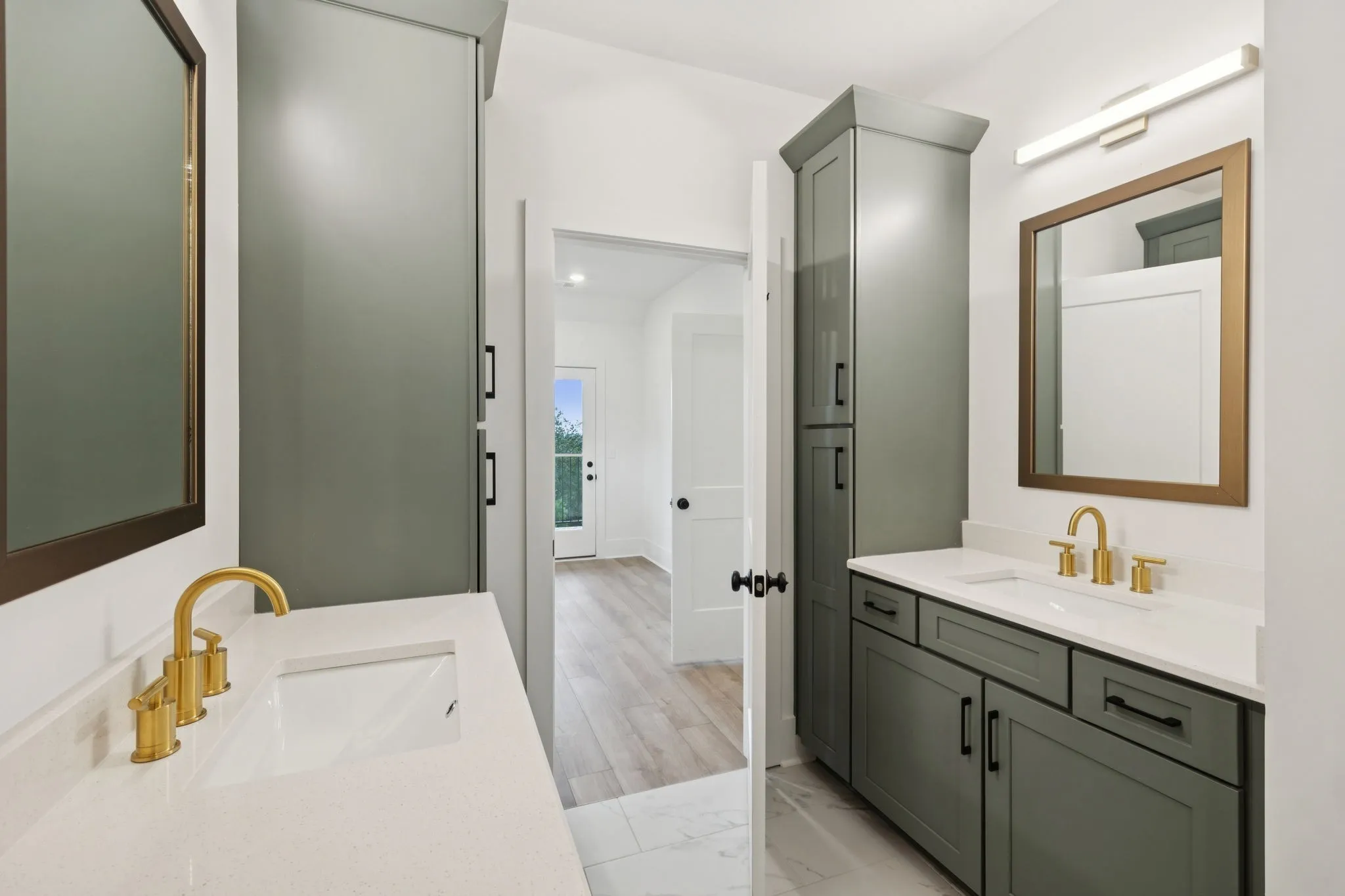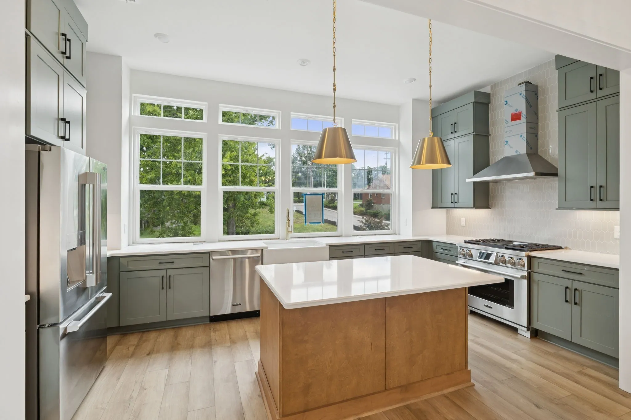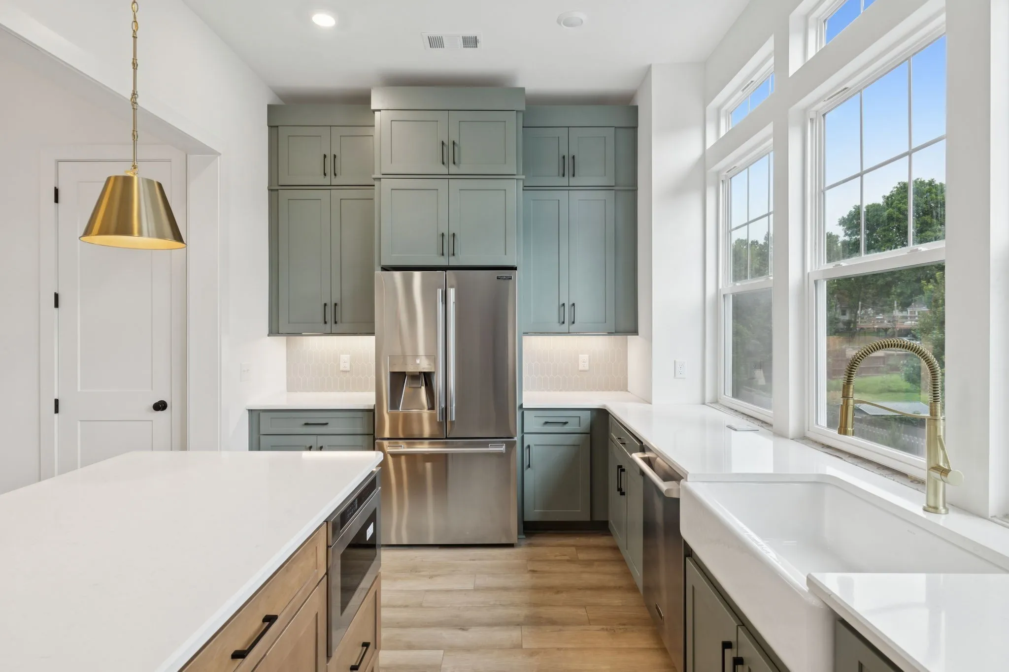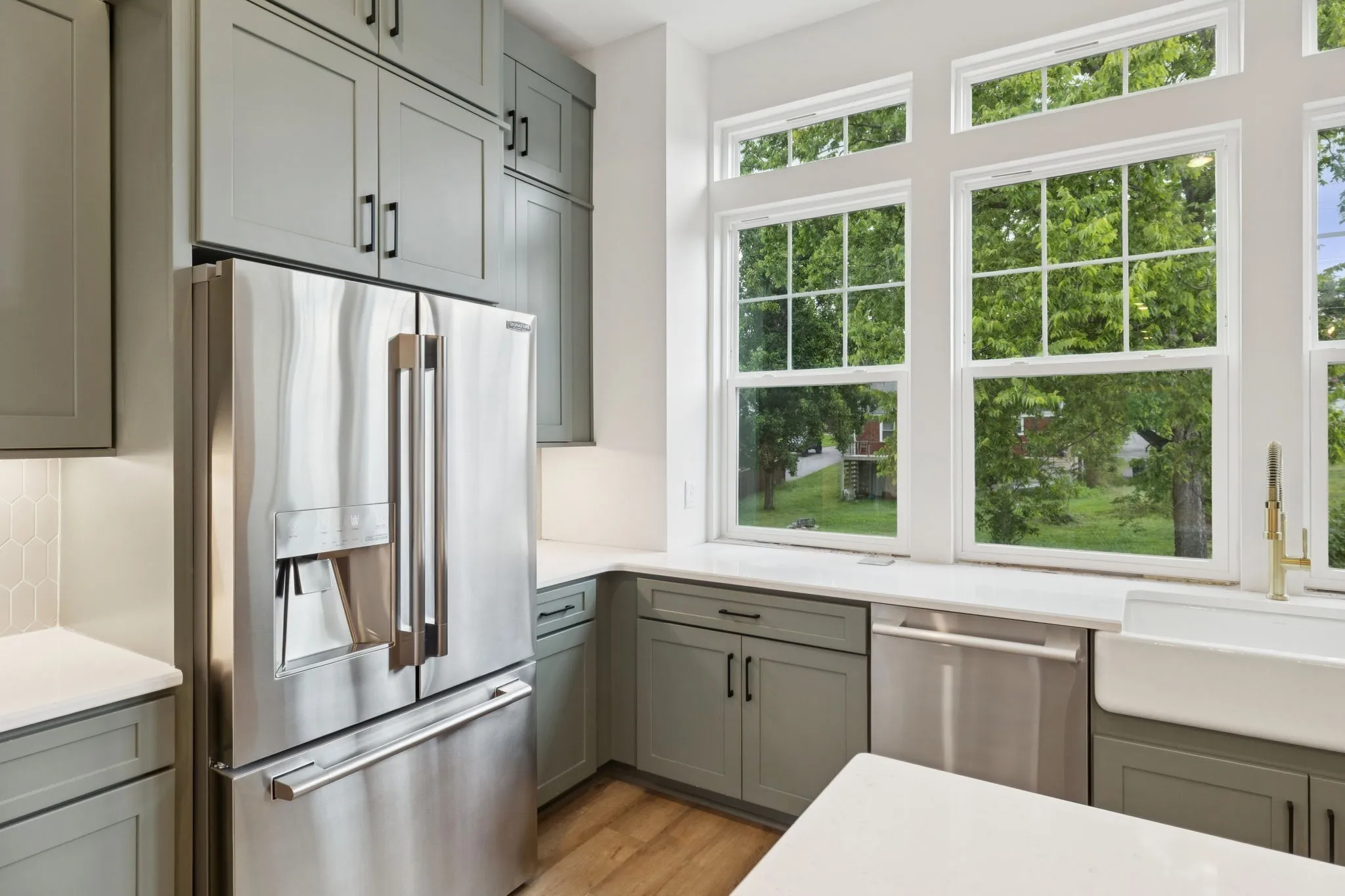 The gourmet chef’s kitchen is equipped with Signature appliances including a Bluetooth-enabled 36 inch gas range, stainless vent hood, microwave drawer, and French-door refrigerator with beverage door. Level 3 quartz countertops, custom shaker cabinetry to the ceiling, an oversized farmhouse sink, and modern accent details elevate both style and function.