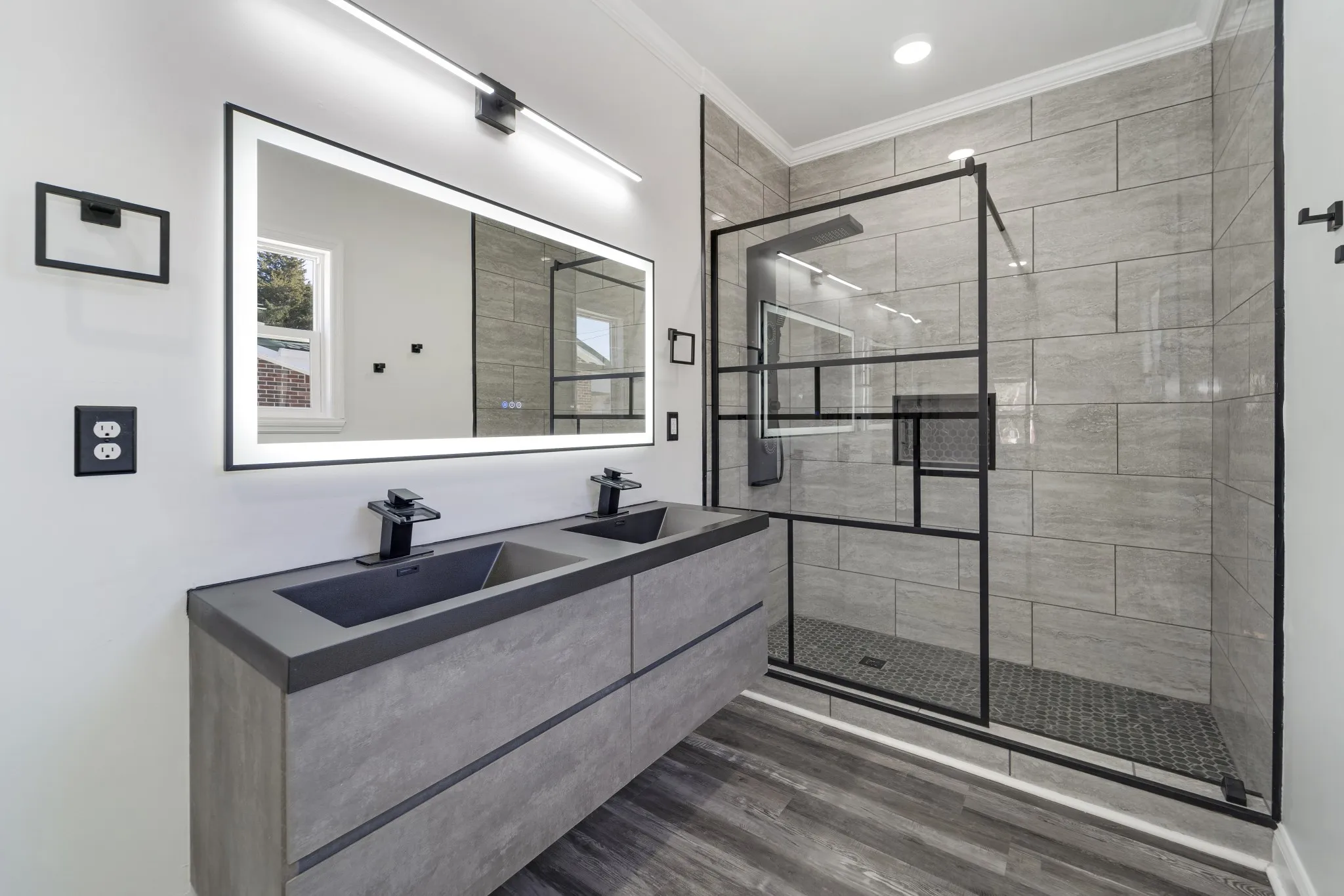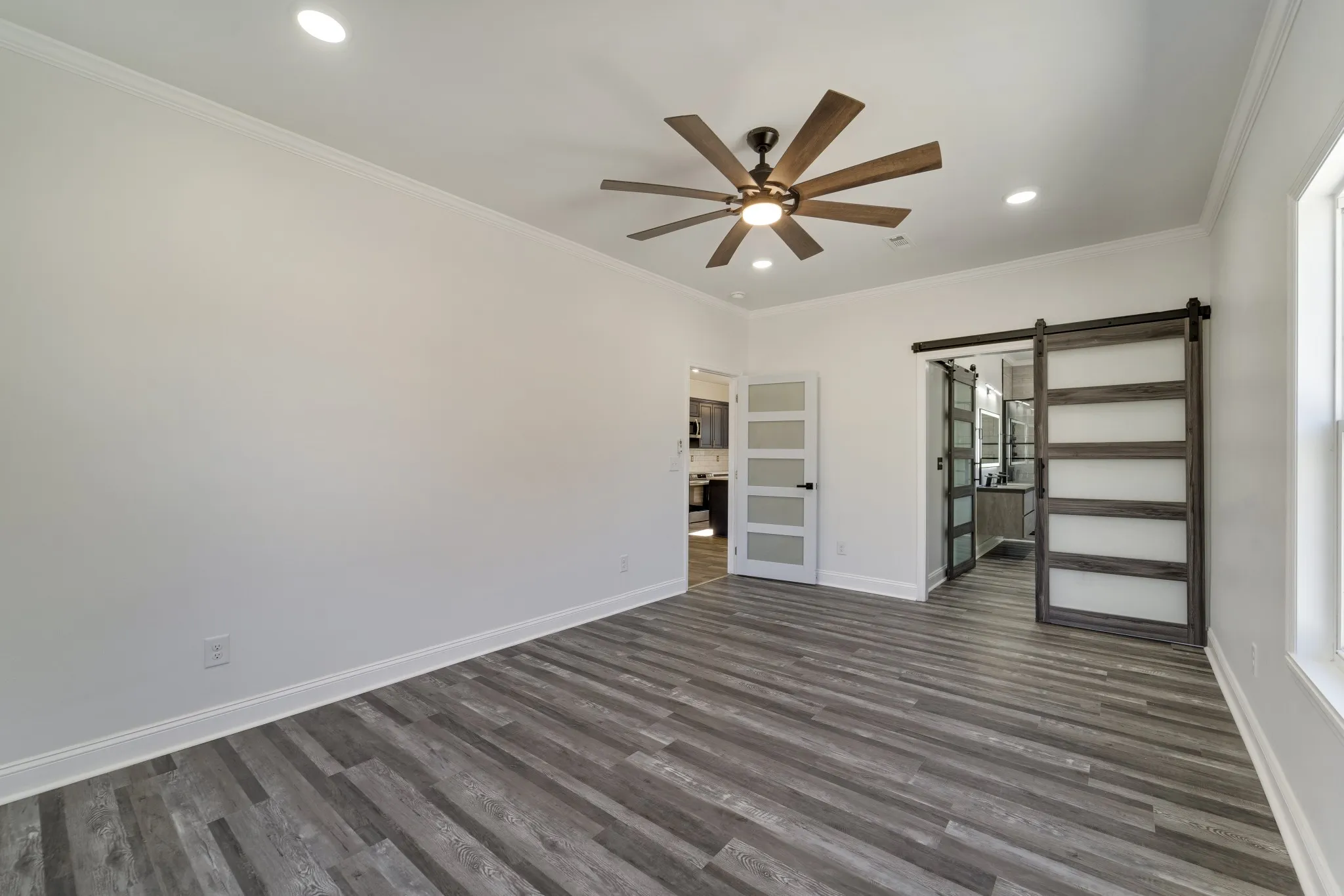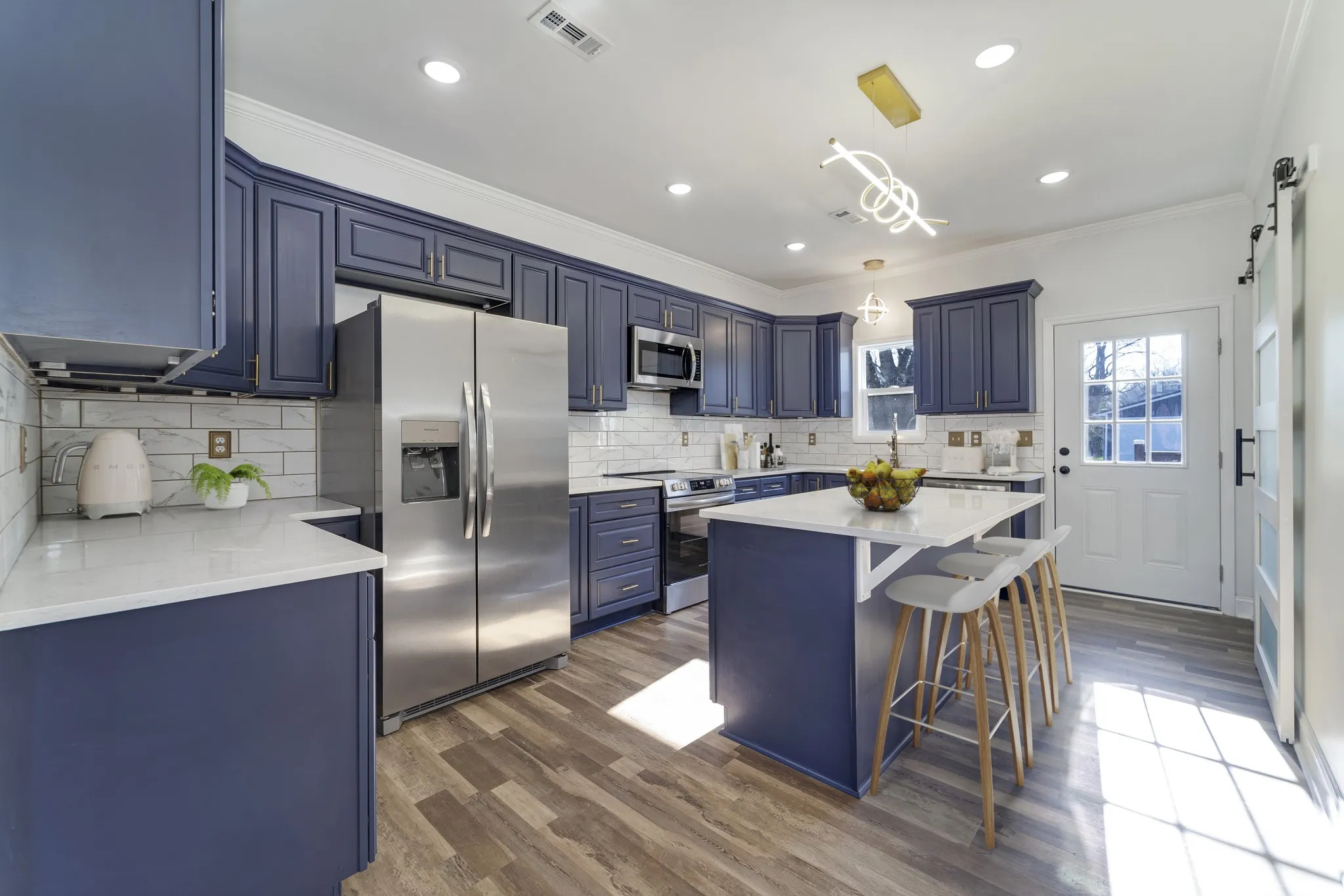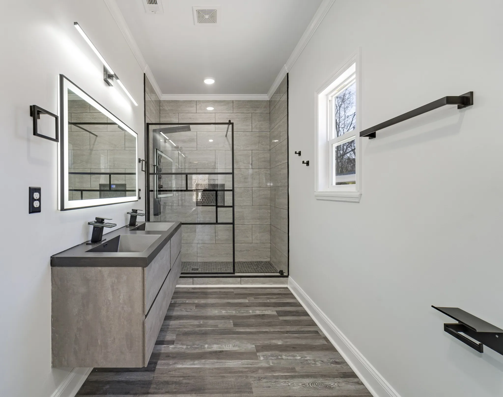 Listed below appraisal! Everything brand new from the ground up! Beautiful contemporary design, 3 bedroom/2 bath, stainless steel appliances, quartz countertops, commercial grade faucet with sprayer and pot filler, lots of counter and cabinet space, all gold trim. LVP flooring throughout. Primary bedroom has full bath and walk-in closet behind frosted glass barn door.Tiled shower with panel system, adjustable jets for powered massage, mirror defogger, double floating sinks with led lighting. Frosted glass barn door to walk-in closet with shelves. Remote ceiling fans and lights. Guest bedrooms have frosted glass bypass doors. 9 x 5 laundry room, 12 x 10 stained back deck, 29 x 23 heated and cooled garage with 2 garage door openers. House and garage heat and air units can be controlled remotely with phone as well as garage door openers. New concrete driveway. Covered front porch for your swing or rocking chairs. All it needs is you!