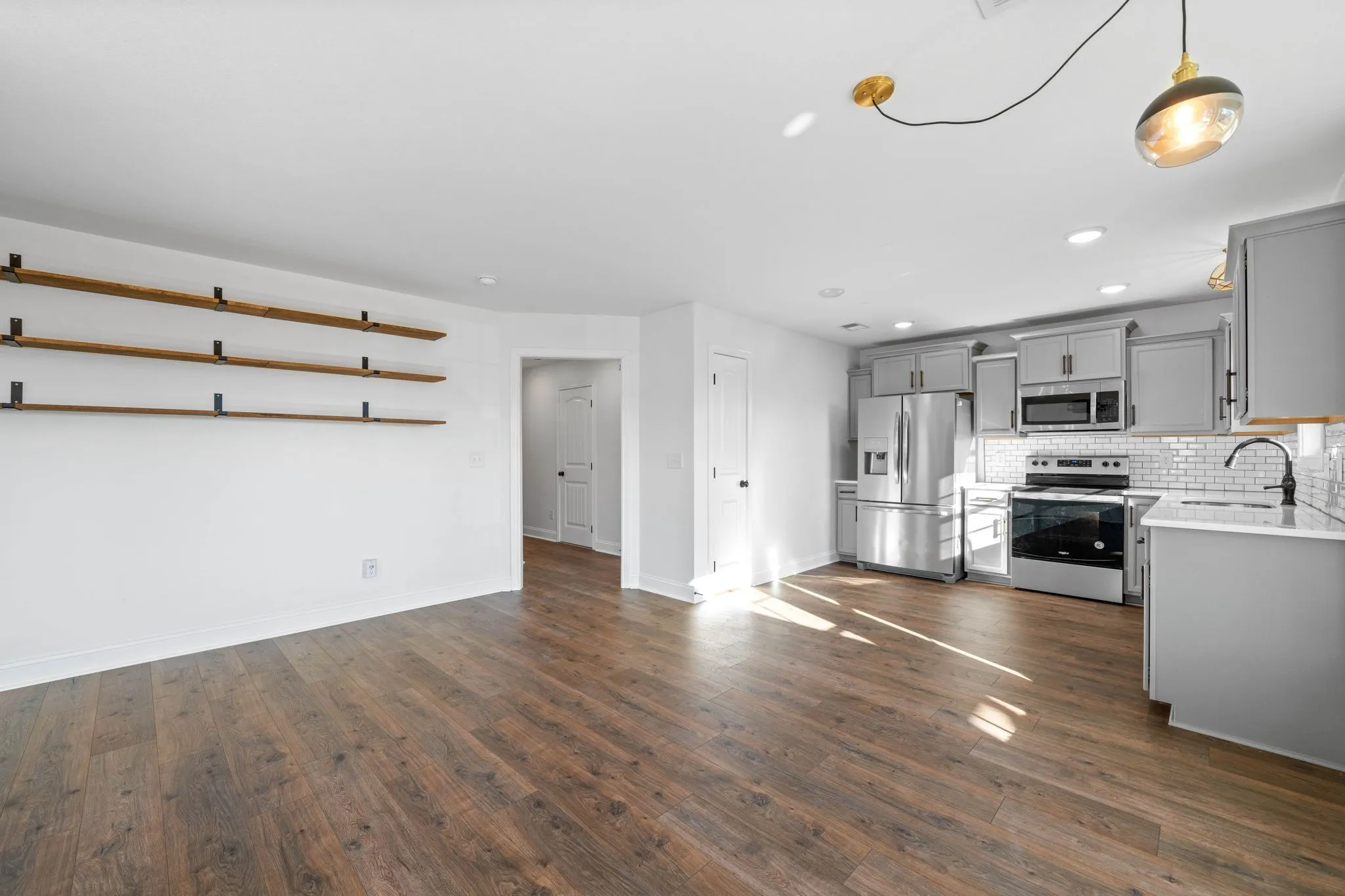 Beautiful like new home, gorgeous door when you enter the home, open concept living room and kitchen area, can also fit a dining room table, shiplap around electric fireplace, SS appliances, updated cabinets, updated countertops, and beautiful backsplash. Updated light fixtures, shelving in living room to hang decor, pantry in kitchen, beautiful half bath downstairs, separate laundry room with plenty of space to fold laundry, huge primary bedroom upstairs with a stunning bathroom, beautiful fixtures and stand up shower, spare bedroom with an accent wall, an updated full bath upstairs, the vanity is a one of a kind! All bedrooms are upstairs and bedrooms are spacious! Enjoy the backyard with the covered back deck! Privacy fence around the backyard! Covered front porch. This modern home is waiting for its new owner!