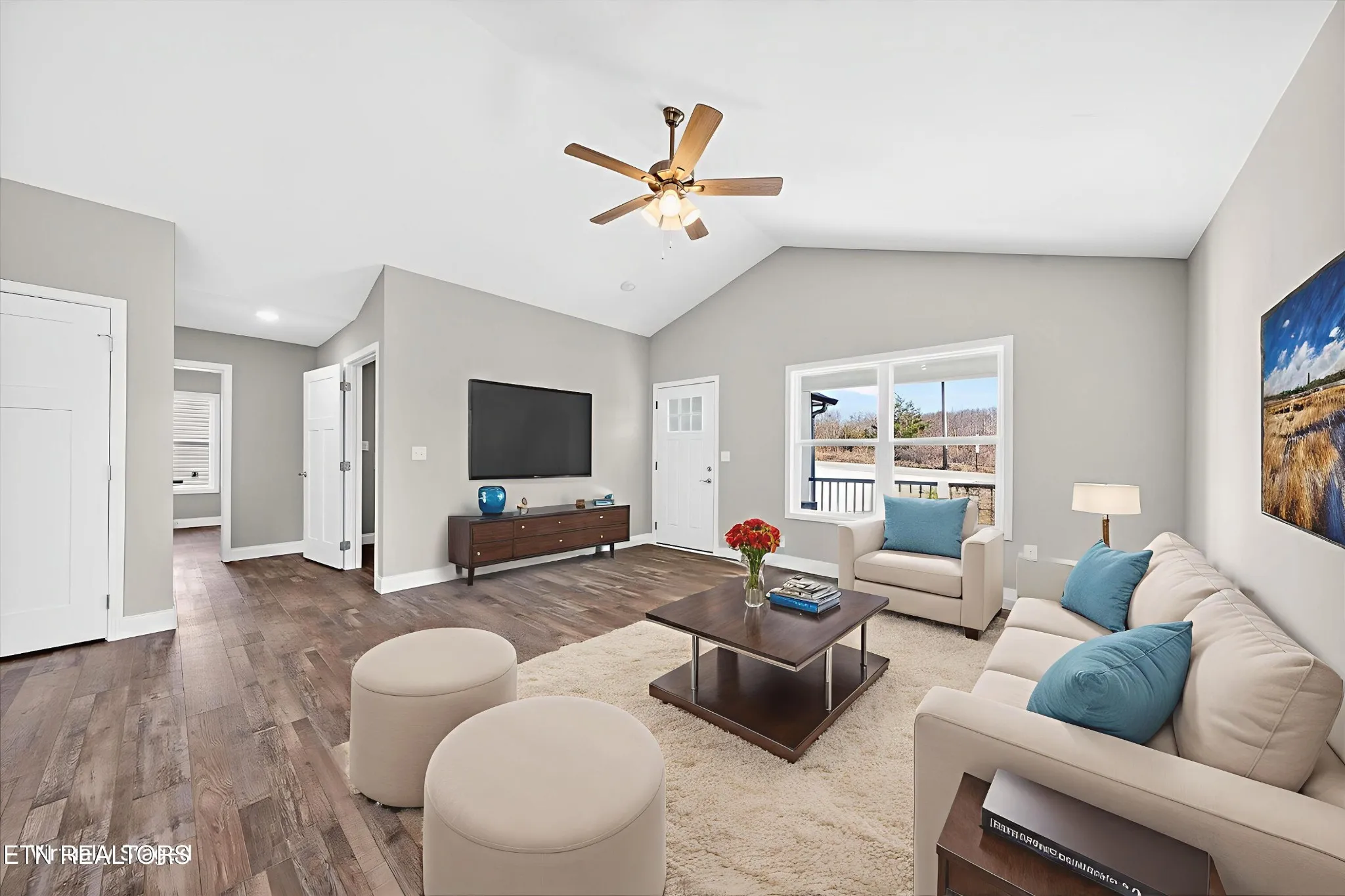 • Open-concept living, kitchen, and dining area with a vaulted ceiling